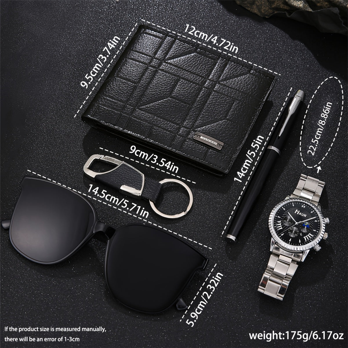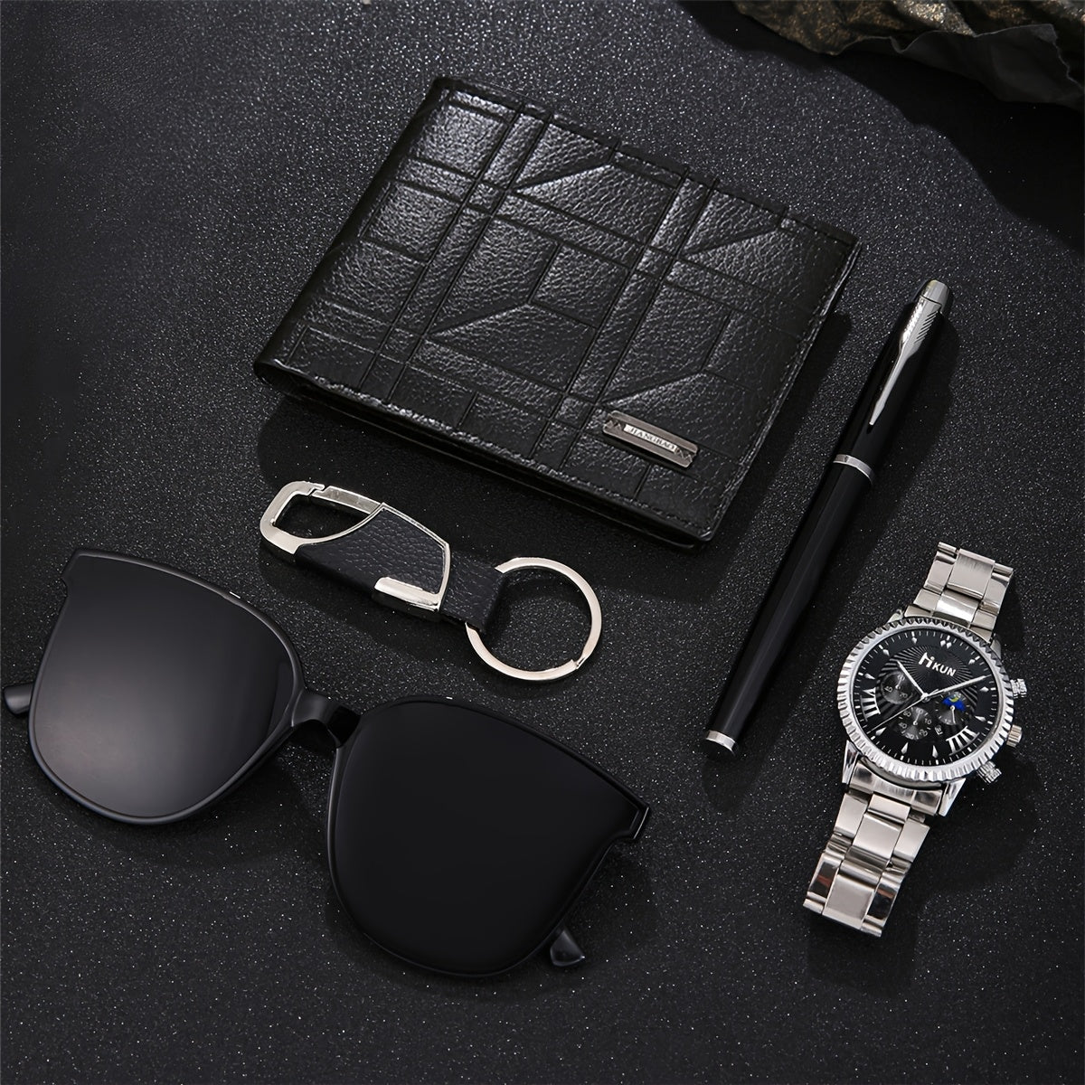 5 հատ էլեգանտ տղամարդկանց նվերների հավաքածու՝ քվարցե ժամացույց՝ ամսաթվի ցուցադրմամբ, ոճային դրամապանակ, նրբագեղ գրիչ, բանալիի շղթա և օդաչուի նորաձև ակնոցներ՝ ոչ ջրակայուն, համաձուլվածքից պատյան և ժապավեն, իդեալական է Սուրբ Վալենտինի օրվա համար