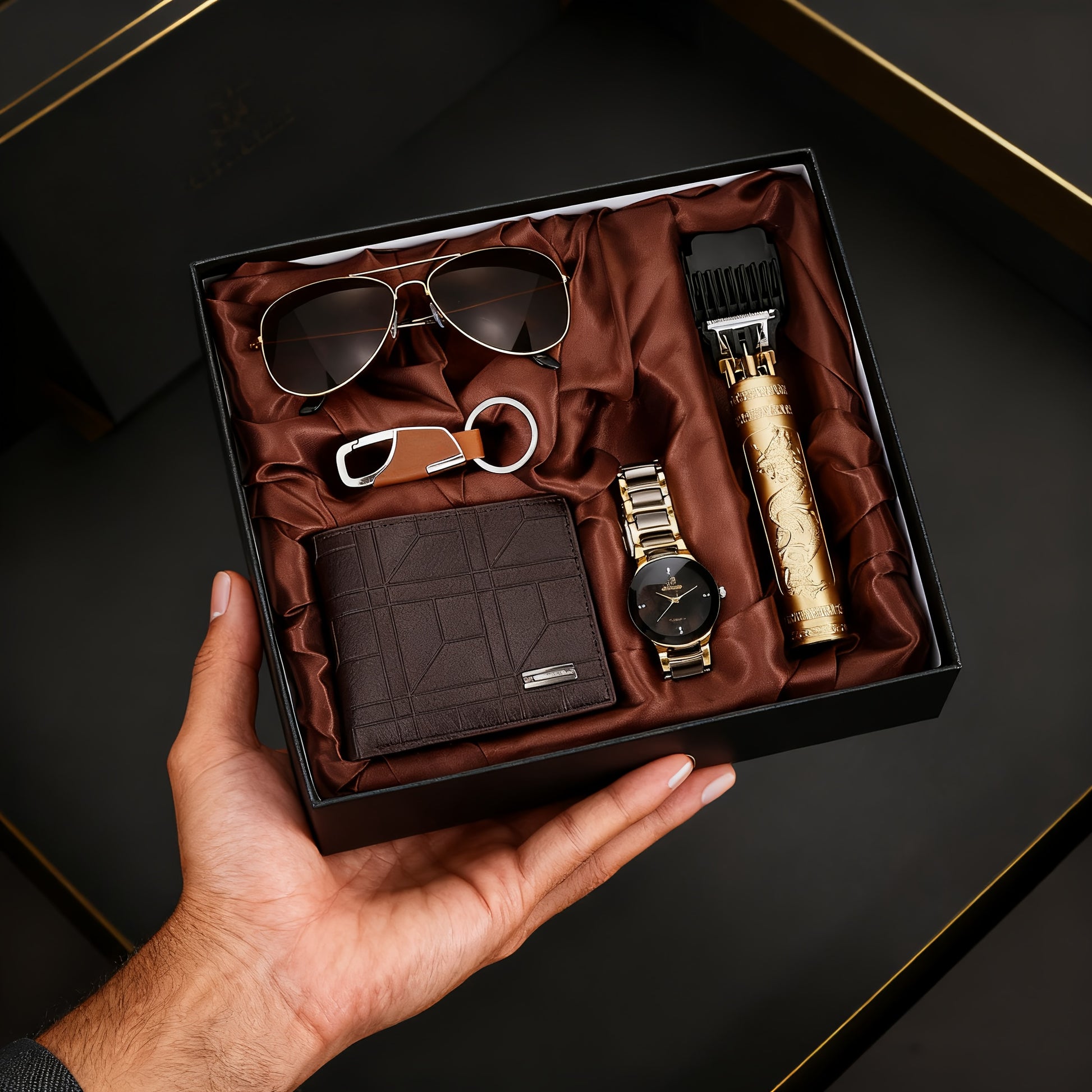 5 հատ տղամարդու գործնական և առօրյա ժամացույցների հավաքածու՝ դրամապանակով, մազ կտրիչով, բանալիի շղթայով, նորաձև ակնոցներով և ժամացույցով - մինիմալիստական գործնական ժամացույցների հավաքածու էլեգանտ նվերային տուփով