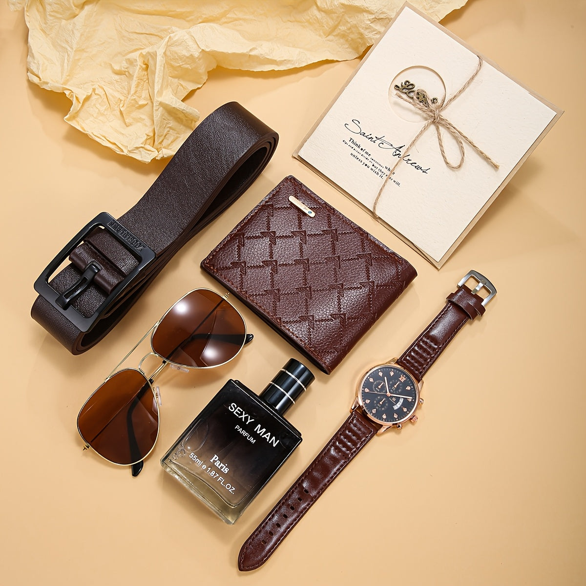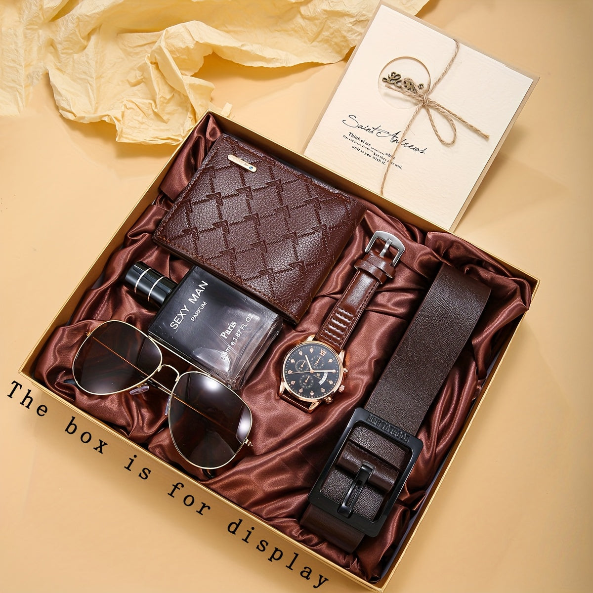 6 հատ տղամարդու գործնական ոճի դրամապանակ-ժամացույցի ժապավեն + երկարակյաց թարմ բույրով օծանելիքի բաժակներ և շնորհավորական բացիկների նվերների հավաքածու՝ կատարյալ նվեր նրա համար տարեդարձի կամ ծննդյան օրվա առթիվ