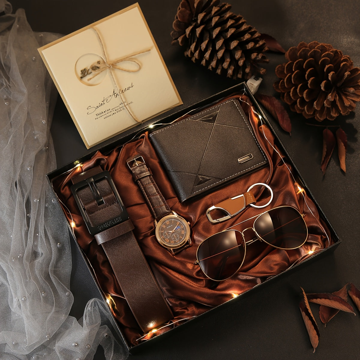 7 հատ տղամարդկանց նվերների հավաքածու՝ նորաձև ակնոցներ, բազմաֆունկցիոնալ դրամապանակ, գործնական ժամացույց, ստեղծագործական բանալիի շղթա, ոճային գոտի, մտածված շնորհավորական բացիկ և LED լույս, ճառագող նրբագեղություն