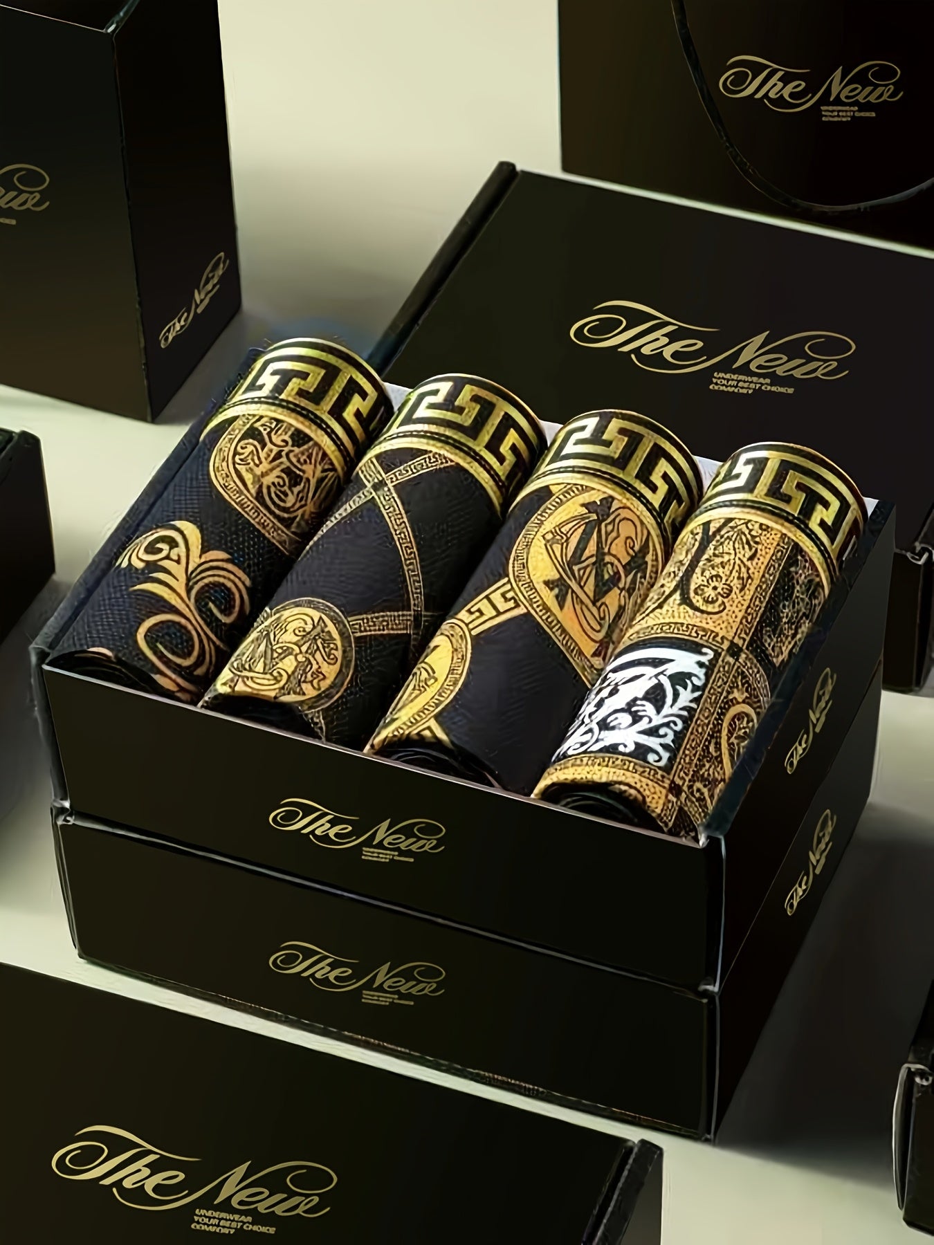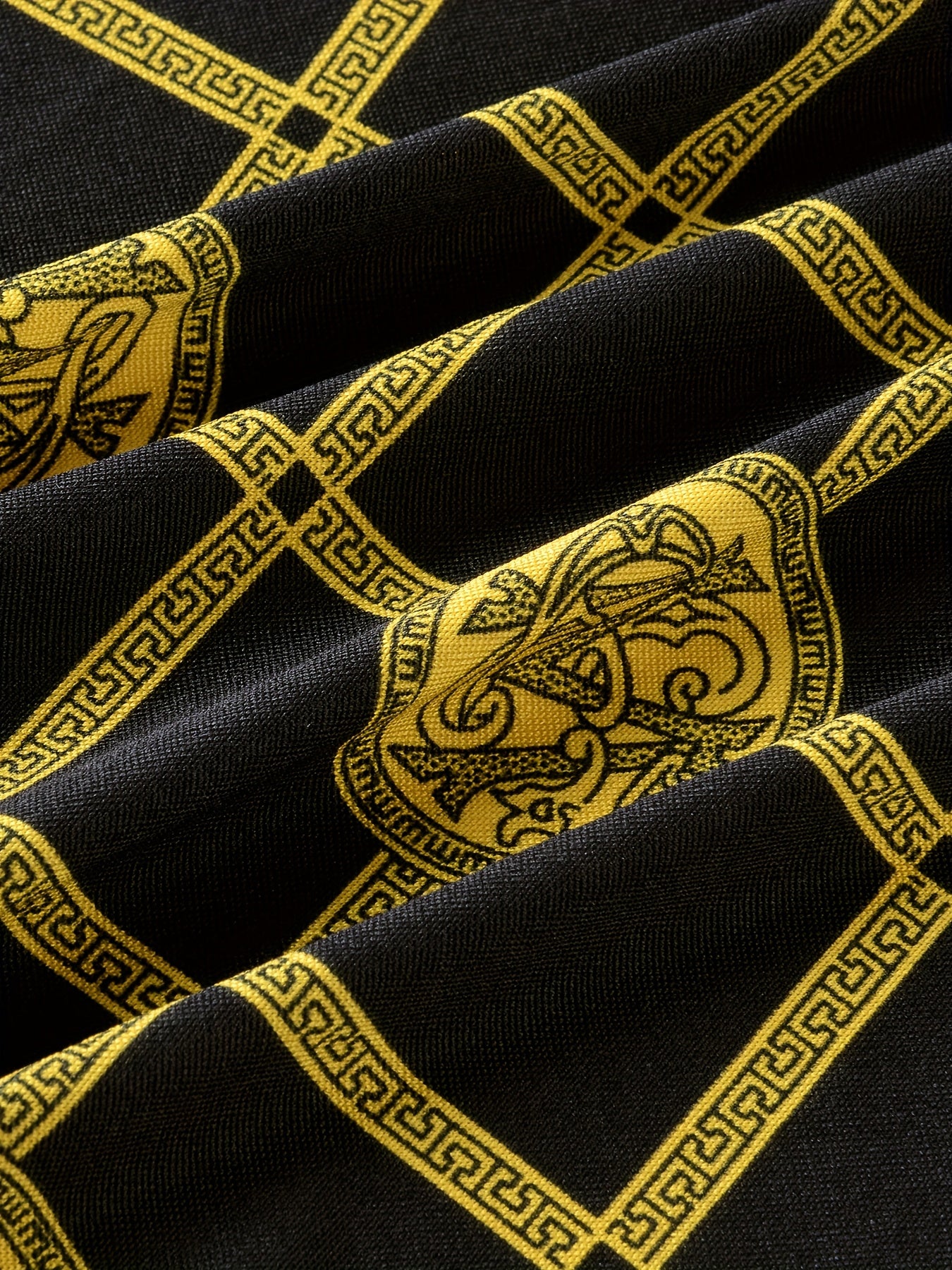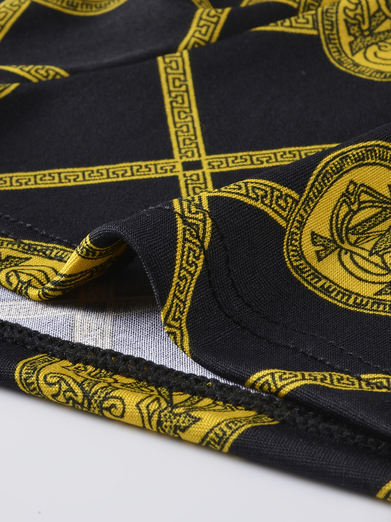 Տղամարդկանց մի զույգ շնչող և փափուկ սև և ոսկե շորտեր, որոնք ունեն նորաձև սև և ոսկեգույն դիզայն, առաձգական և հարմարավետ, կատարյալ ամենօրյա հագուստի համար: