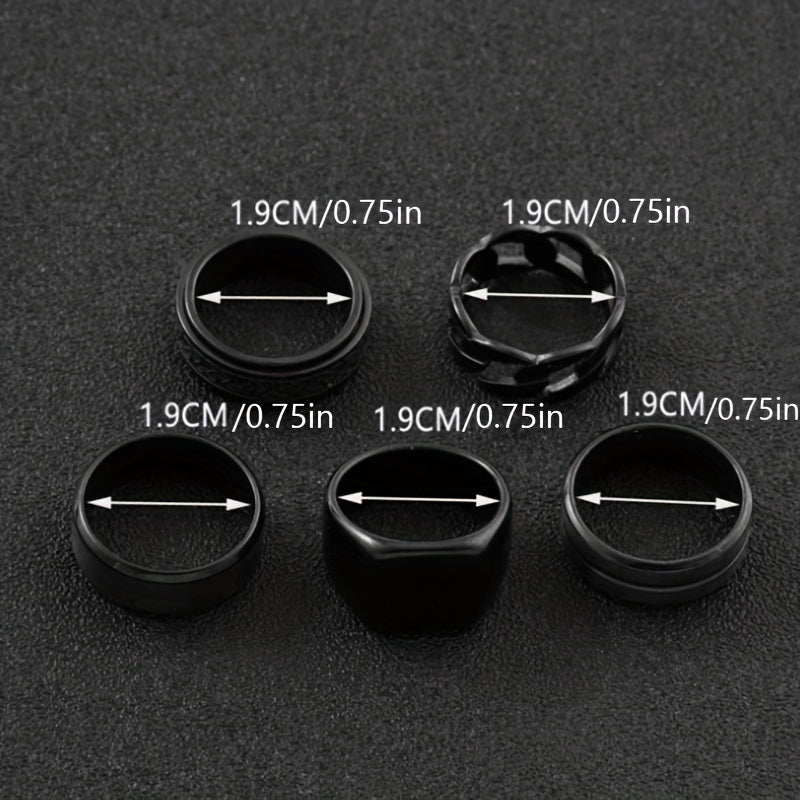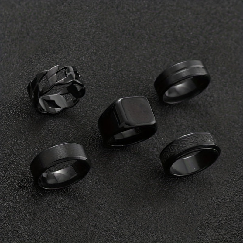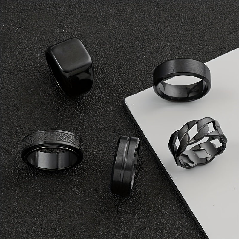 5 ոճային չժանգոտվող պողպատե մատանիների հավաքածու՝ պտտվող սև երկրաչափական նախշերով, պարզ խոռոչավոր մատանիներ, որոնք կատարյալ են տղամարդկանց հարսանեկան կամ ժամադրությունների աքսեսուարների համար։