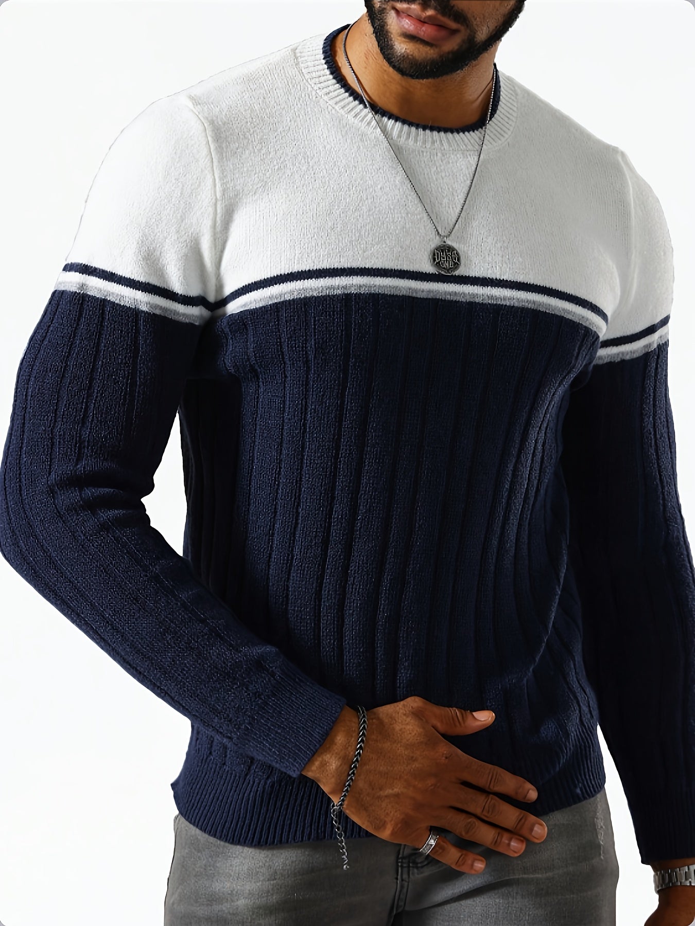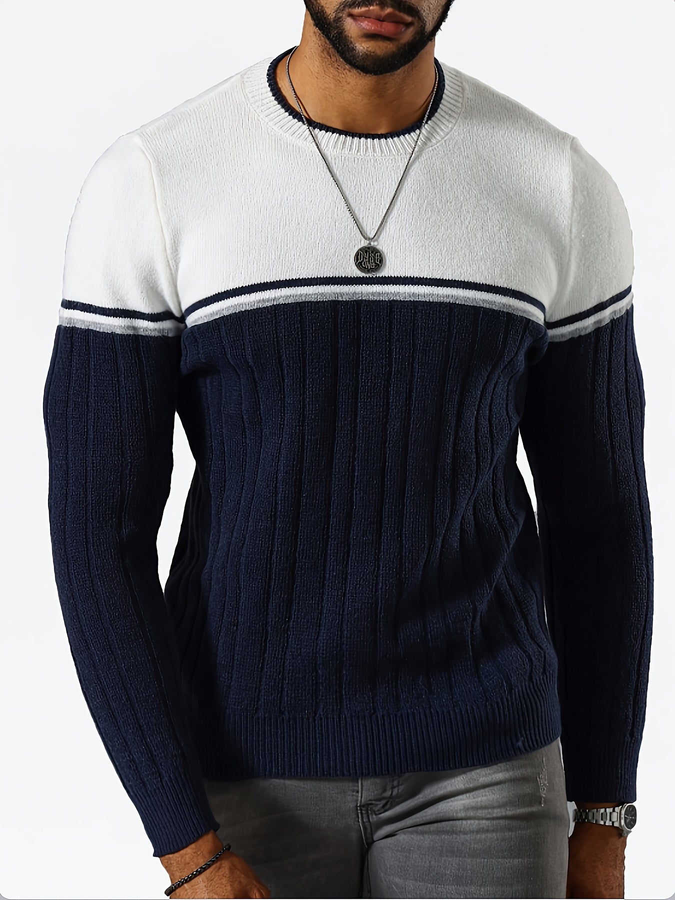Աշնանային և ձմեռային տղամարդկանց գունային բլոկներով գծավոր կլոր օձիքով սվիտեր