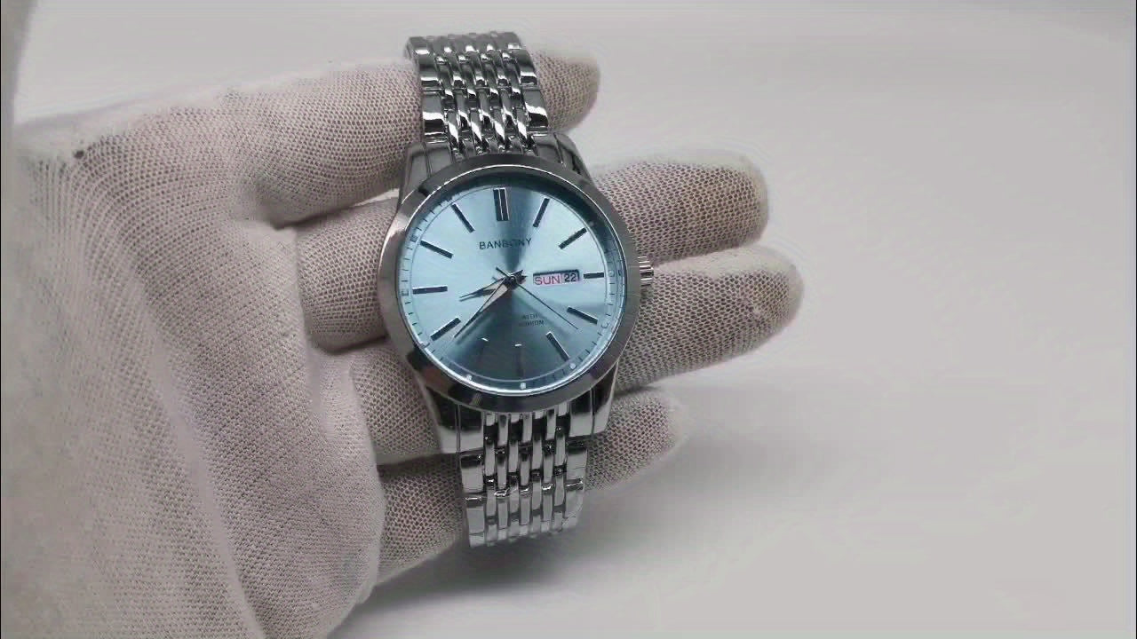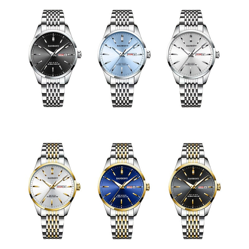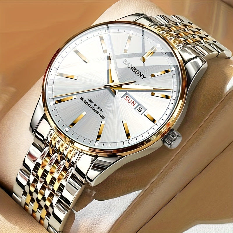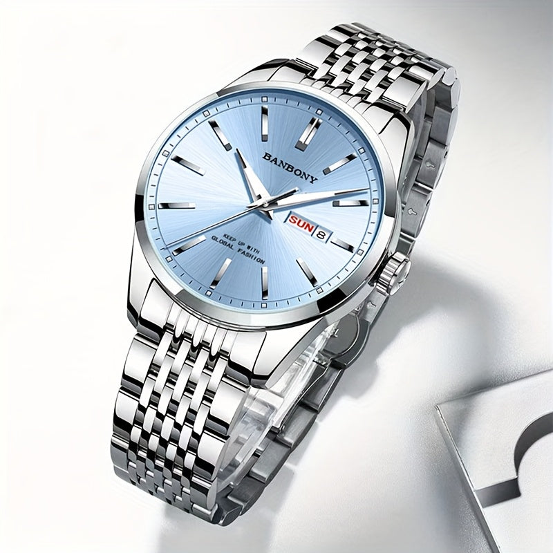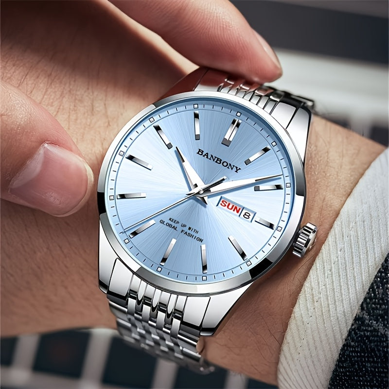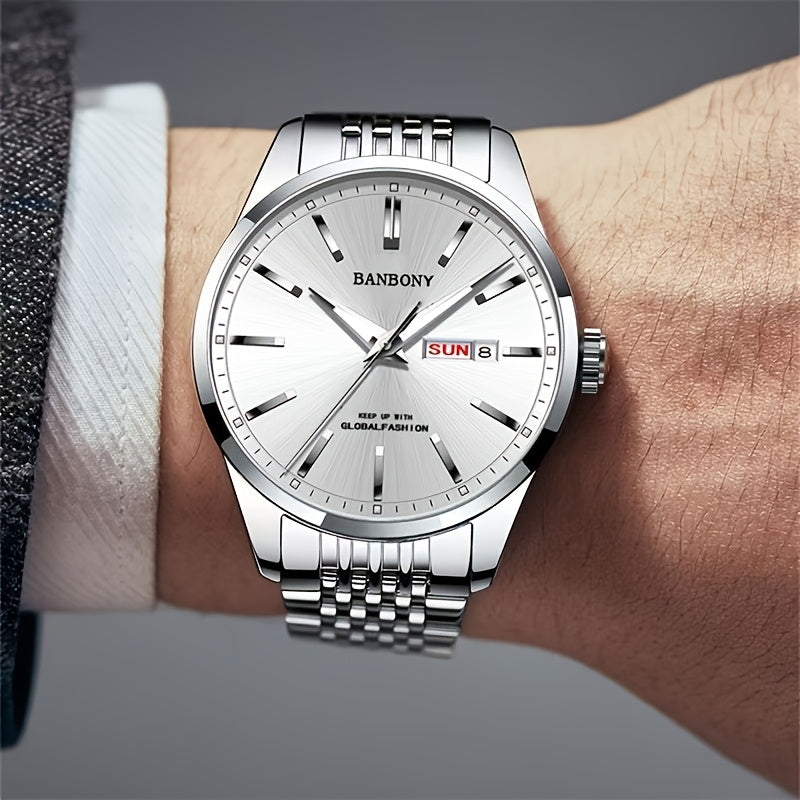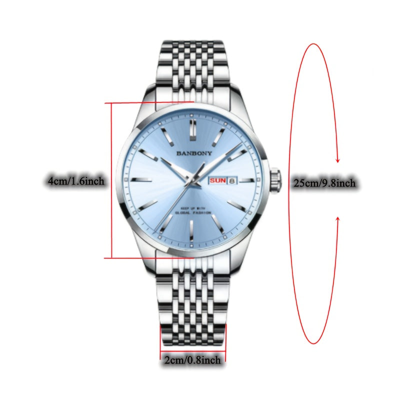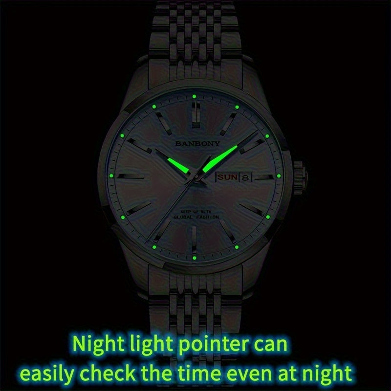 Banbony տղամարդու չժանգոտվող պողպատից ժապավենով լուսավոր օրացույցով ժամացույց, IPX7 ջրակայուն, քվարցային մեխանիզմ, կլոր ցինկե համաձուլվածքից պատյան, առօրյա նորաձև ոճ, ցուցիչ էկրանով, մարտկոցով աշխատող, չլիցքավորվող կոճակով մարտկոց, ծննդյան օրվա համար