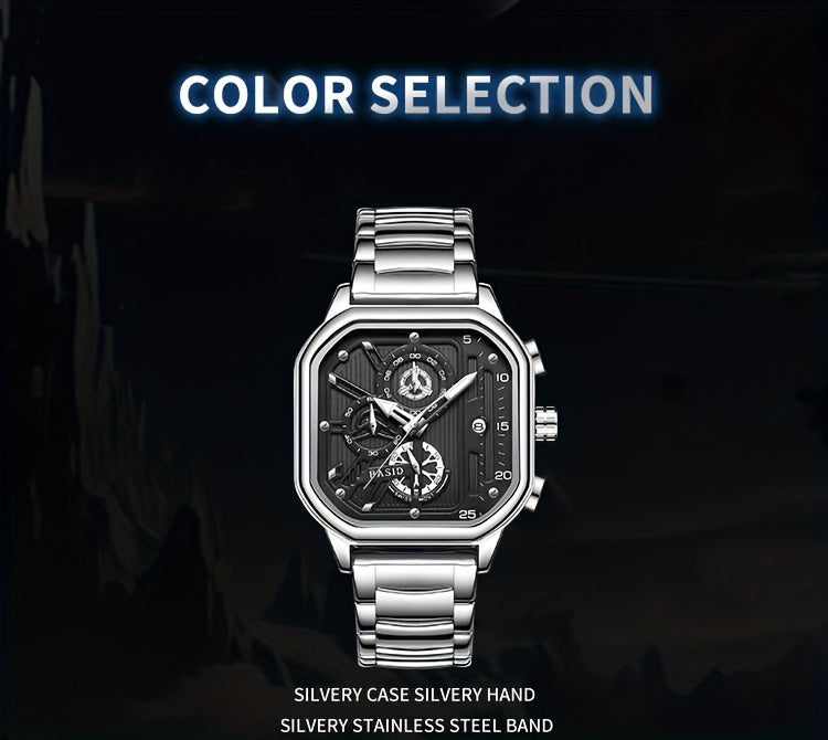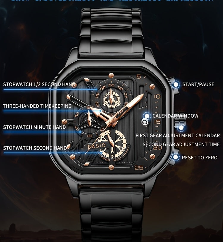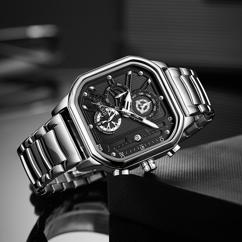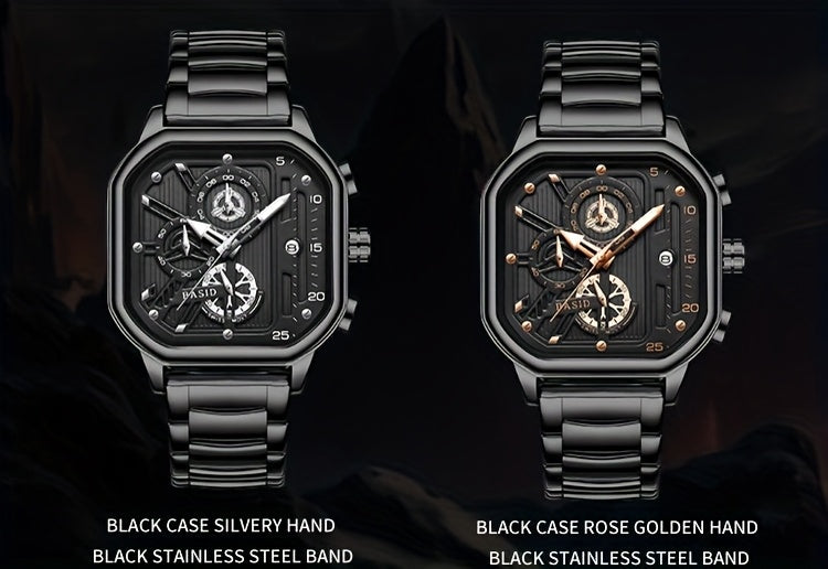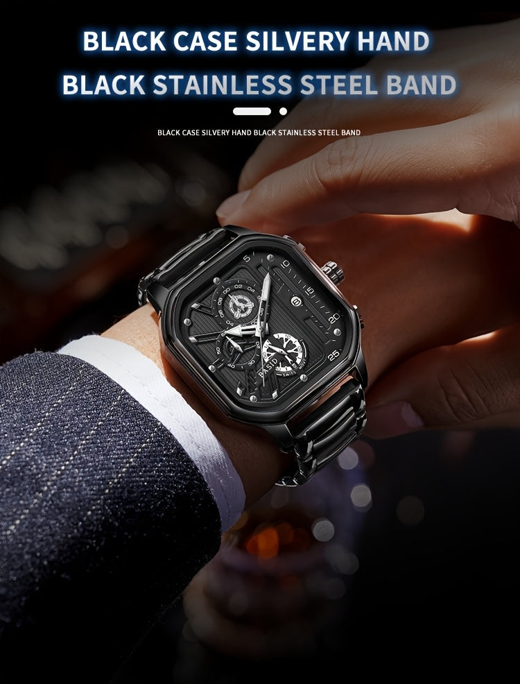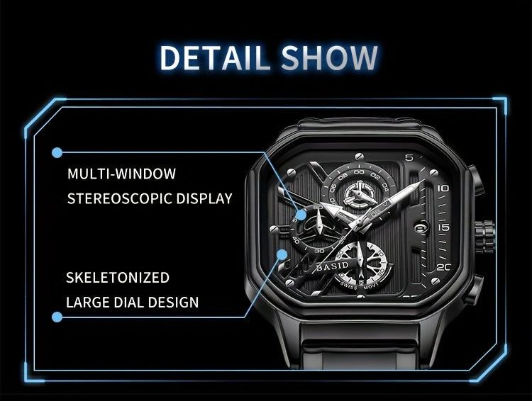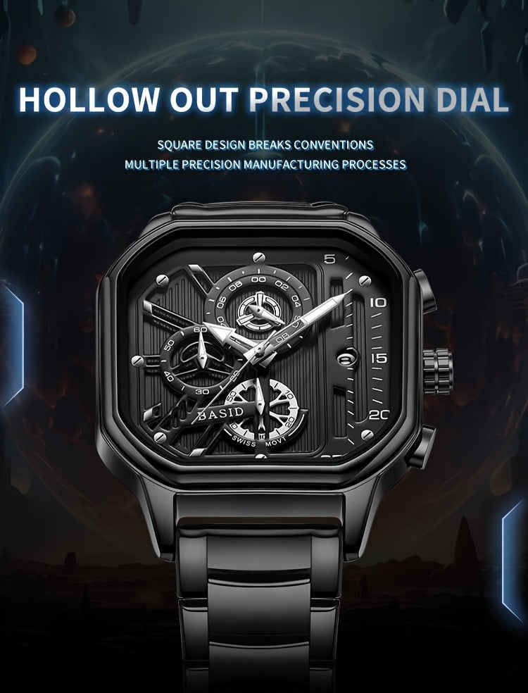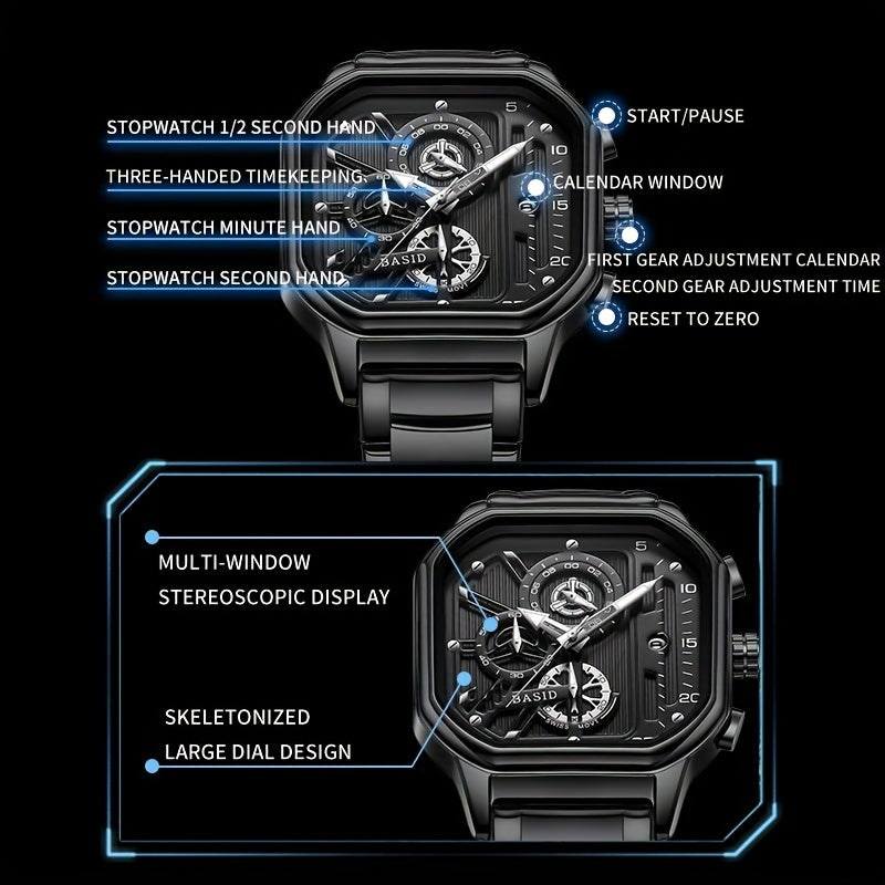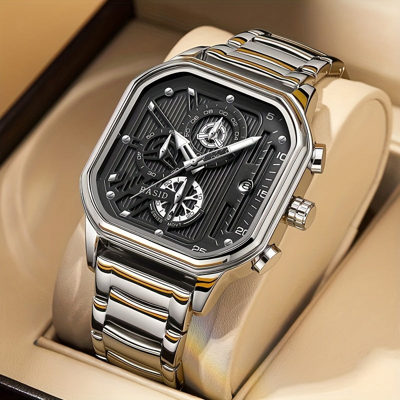 BASID Men's Elegant Square Analog Quartz Watch with Date Display & Stopwatch - Stainless Steel Strap, Black Dial - Casual & Dress Watch for Men, Unique Gift Idea, Versatile Wristwatch, Sleek Watch Design, Polished Finish