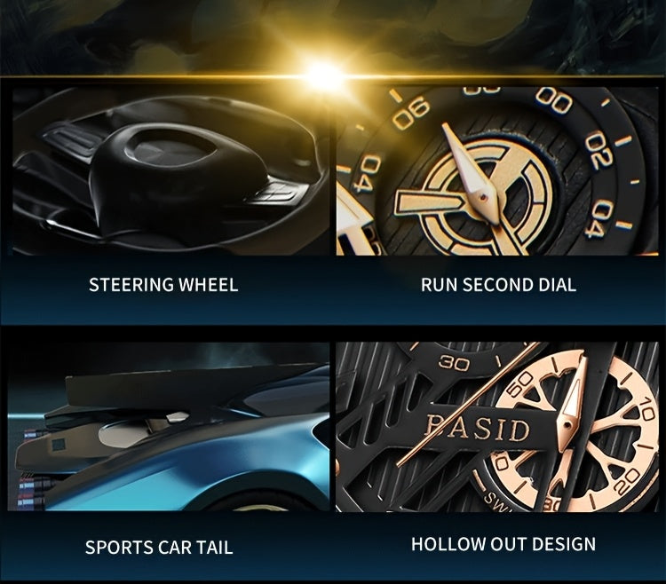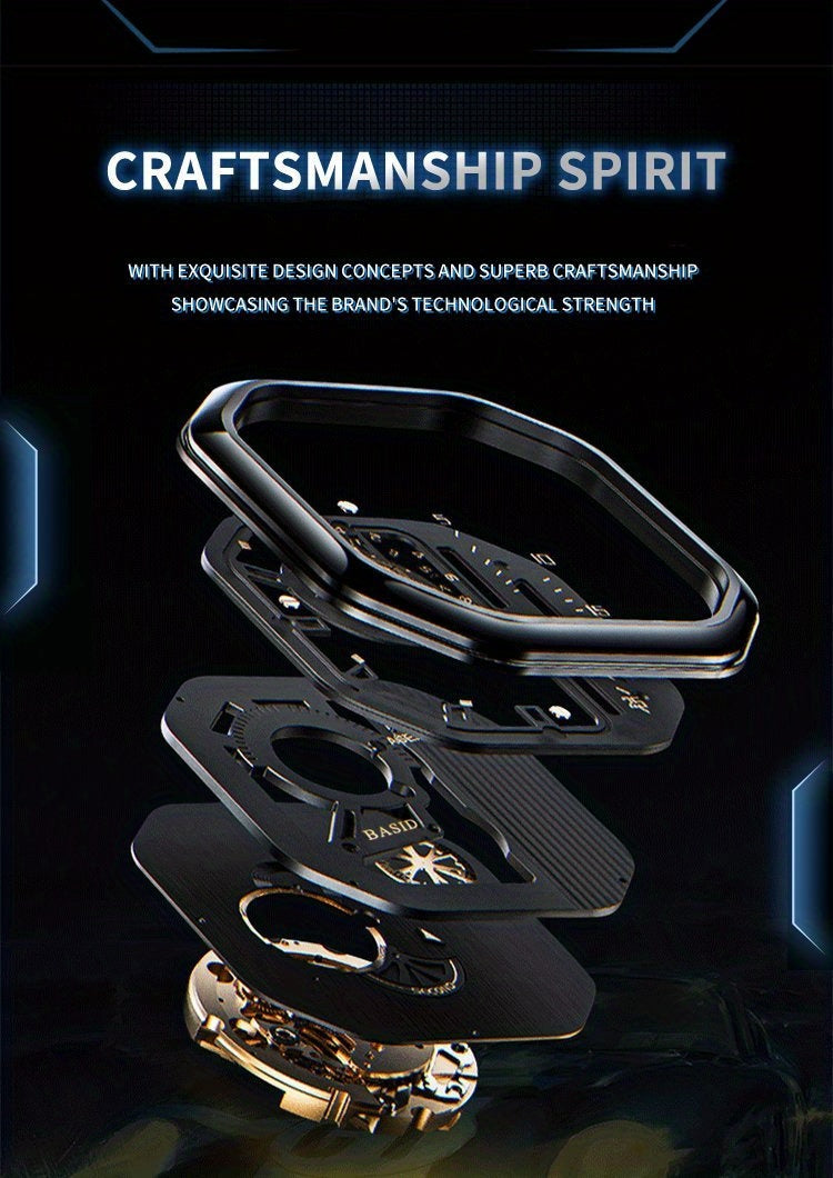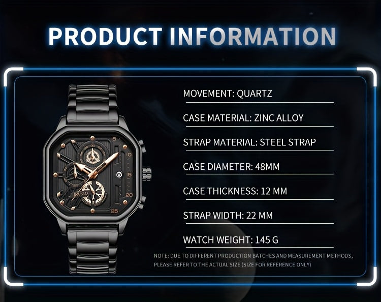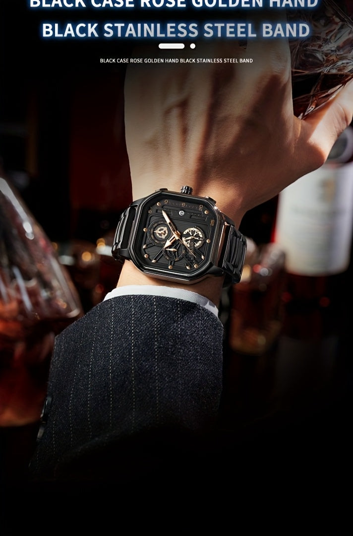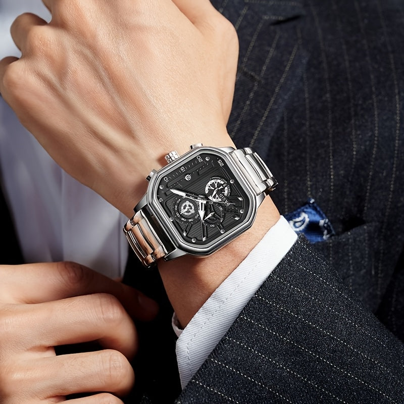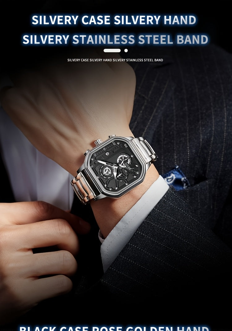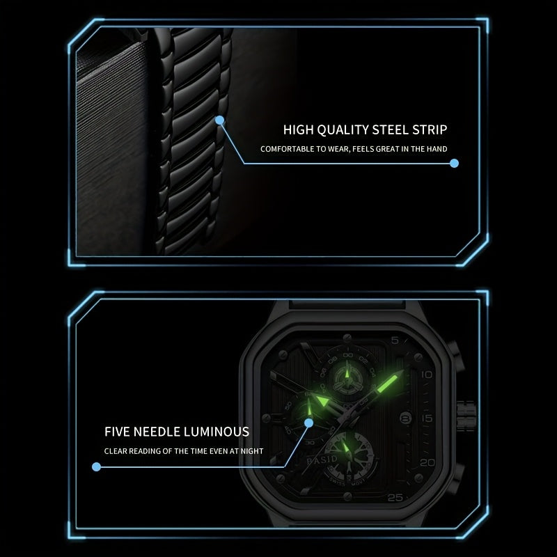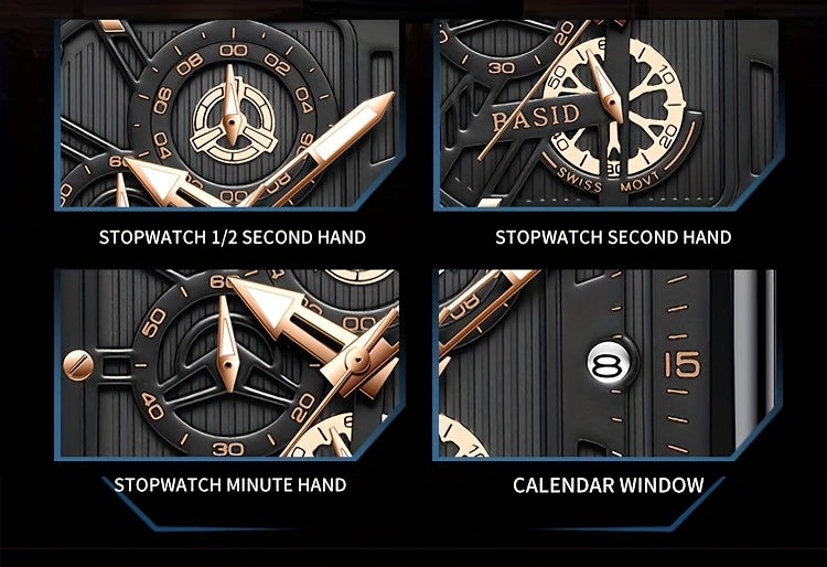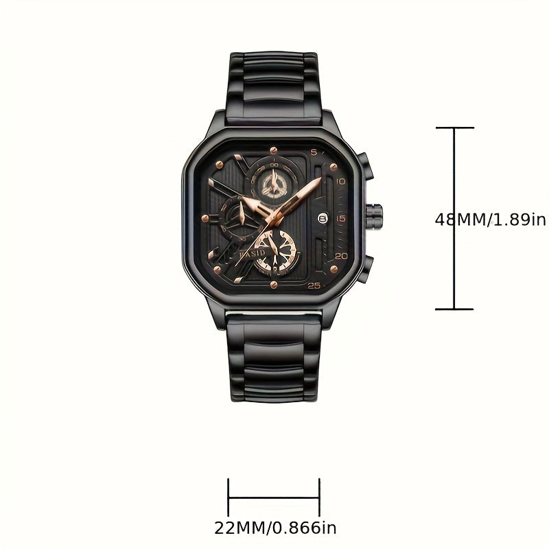 BASID Men's Elegant Square Analog Quartz Watch with Date Display & Stopwatch - Stainless Steel Strap, Black Dial - Casual & Dress Watch for Men, Unique Gift Idea, Versatile Wristwatch, Sleek Watch Design, Polished Finish