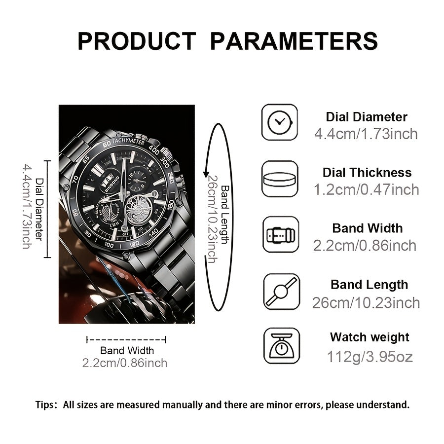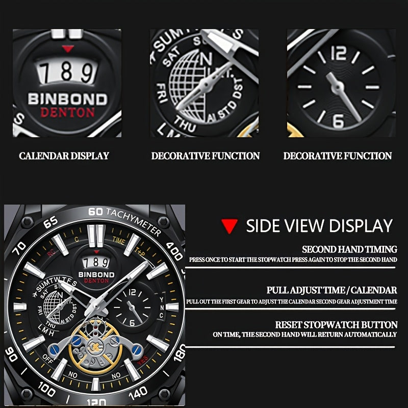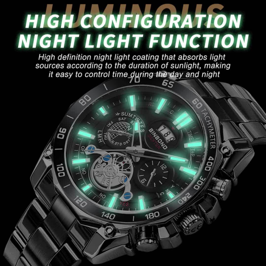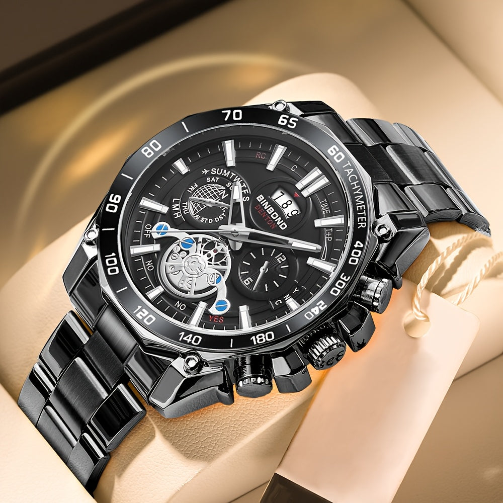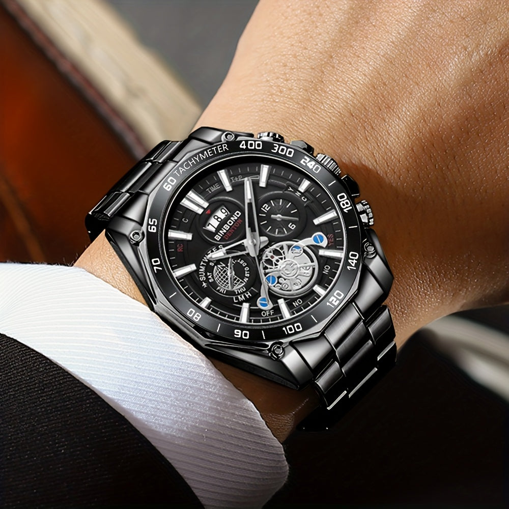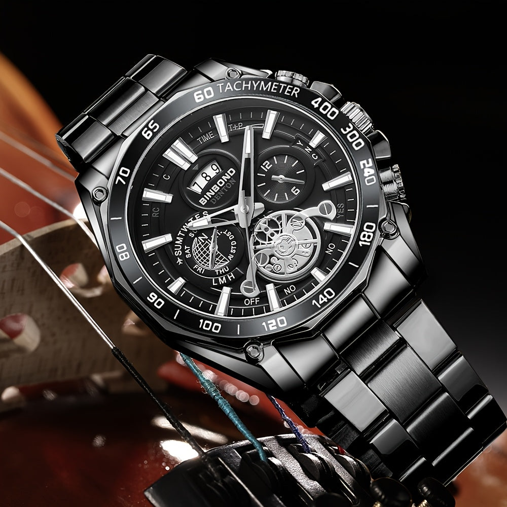 BINBOND տղամարդու շքեղ քվարցային ժամացույց՝ նրբագեղ սև, ջրակայուն՝ օրացույցով և լուսավոր սլաքներով, չժանգոտվող պողպատե ժապավենով, ամսաթվի ցուցադրմամբ, քրոնոգրաֆով և համաշխարհային ժամանակի հնարավորություններով՝ գործնական և ամենօրյա օգտագործման համար