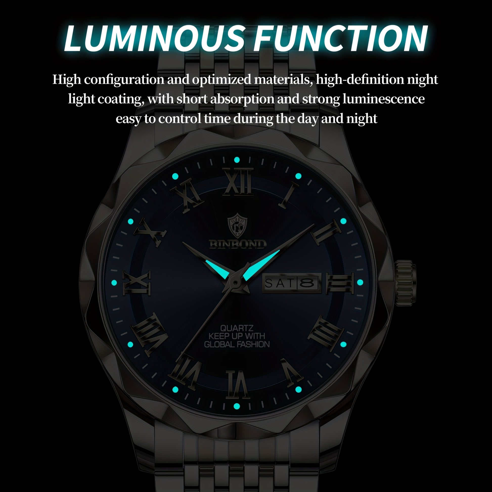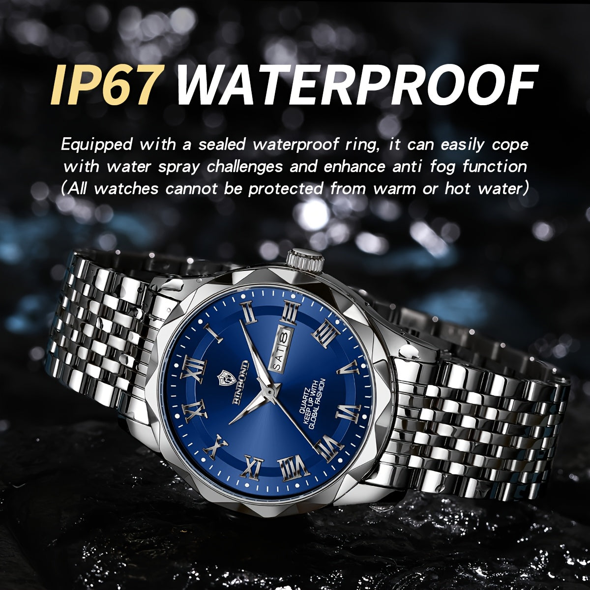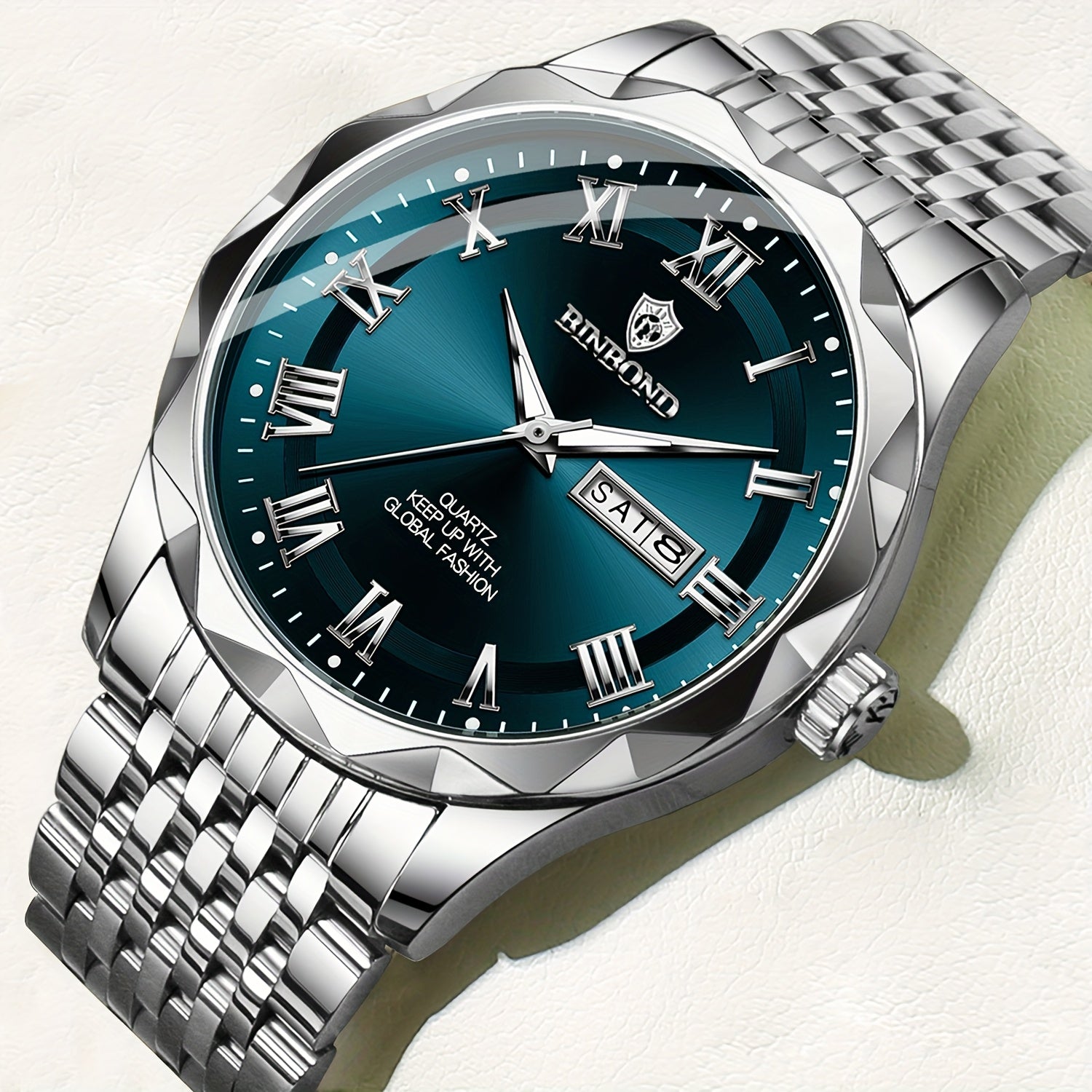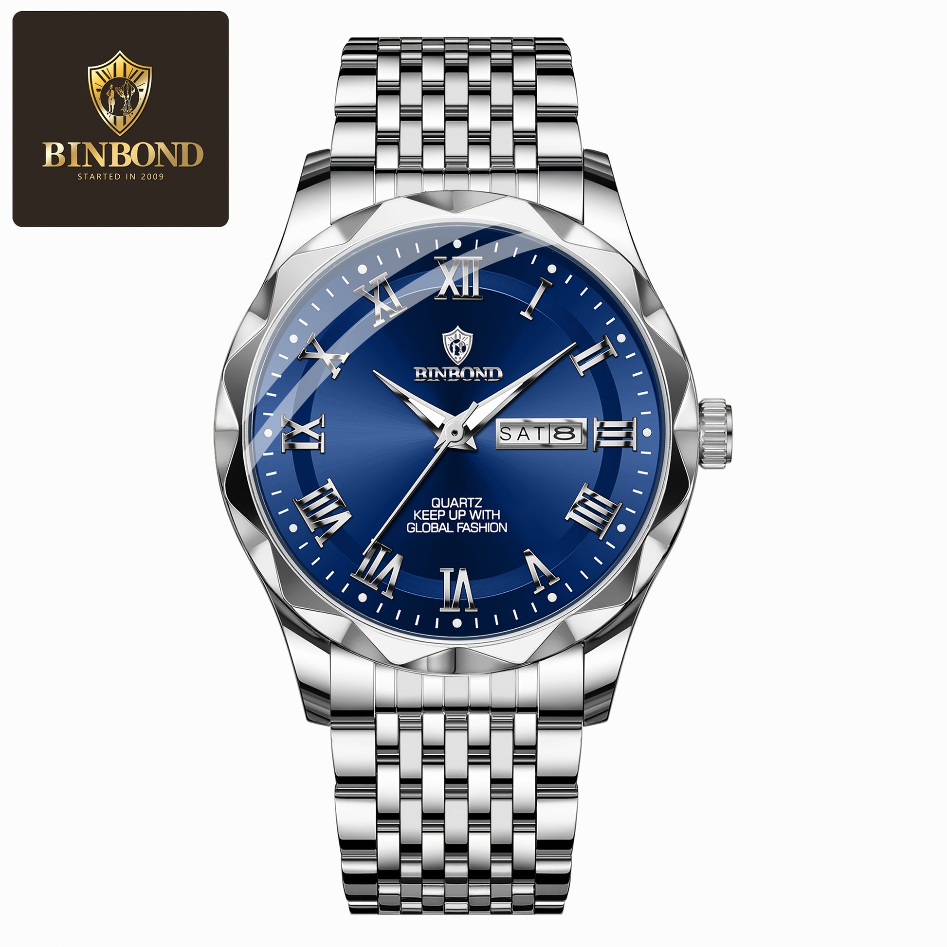 BINBOND Men'S Quartz Watch - Waterproof, Stainless Steel, Luxury Business Style with Stopwatch & Date Display, Blue & Silvery Dial, Electronic Movement, IP67 Rating, Elegant Male Wristwatch for Professional or Casual Wea