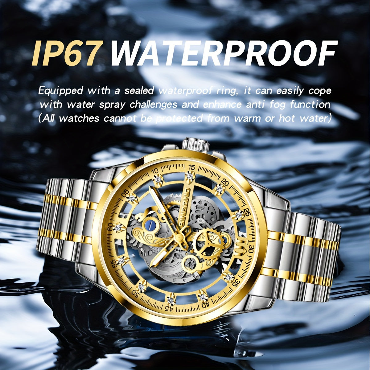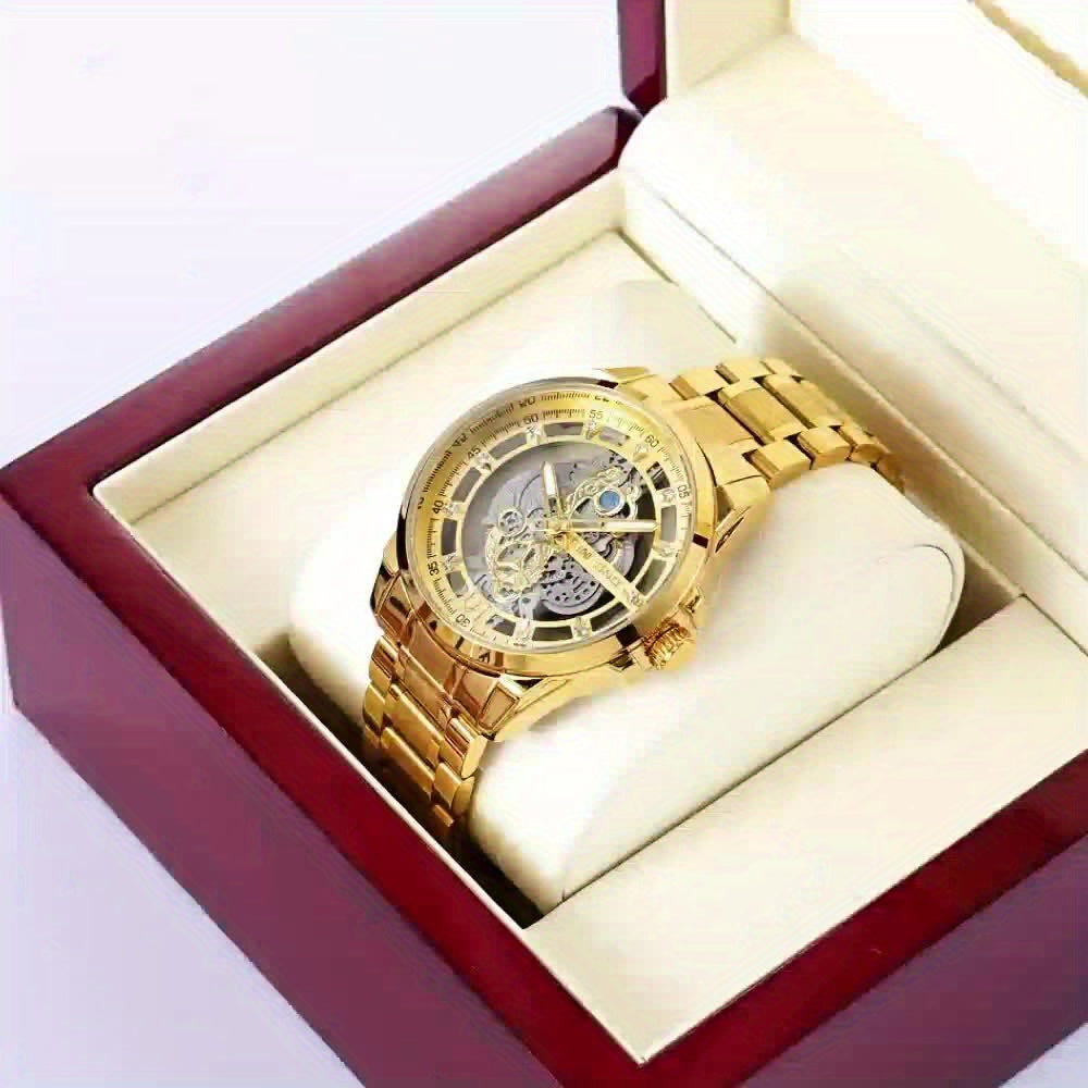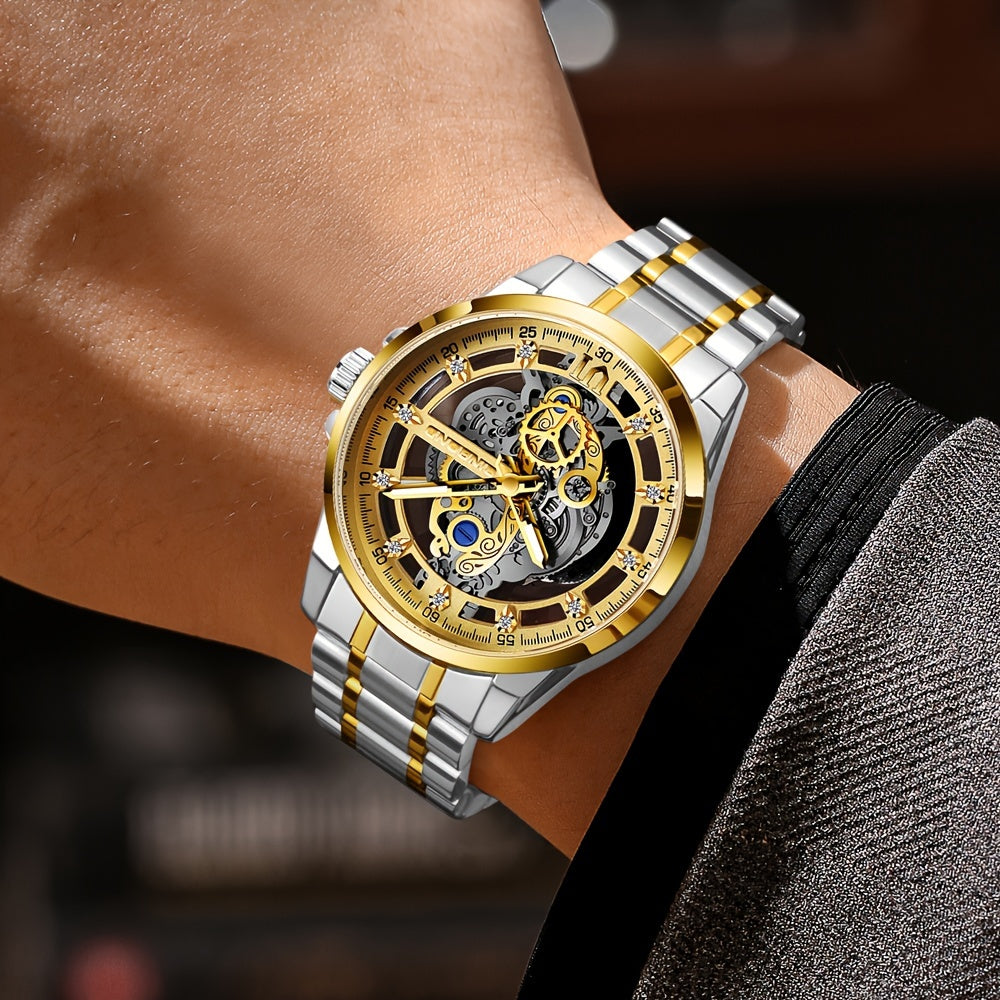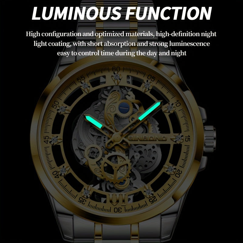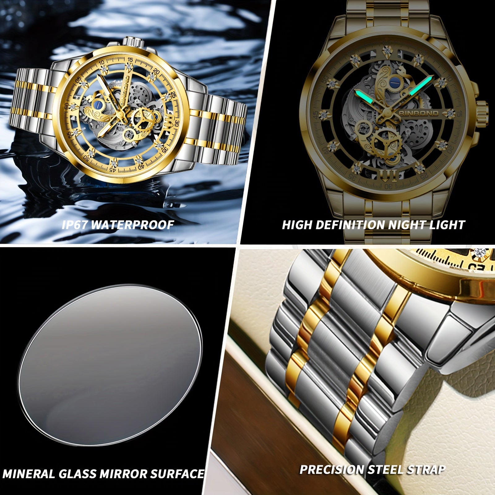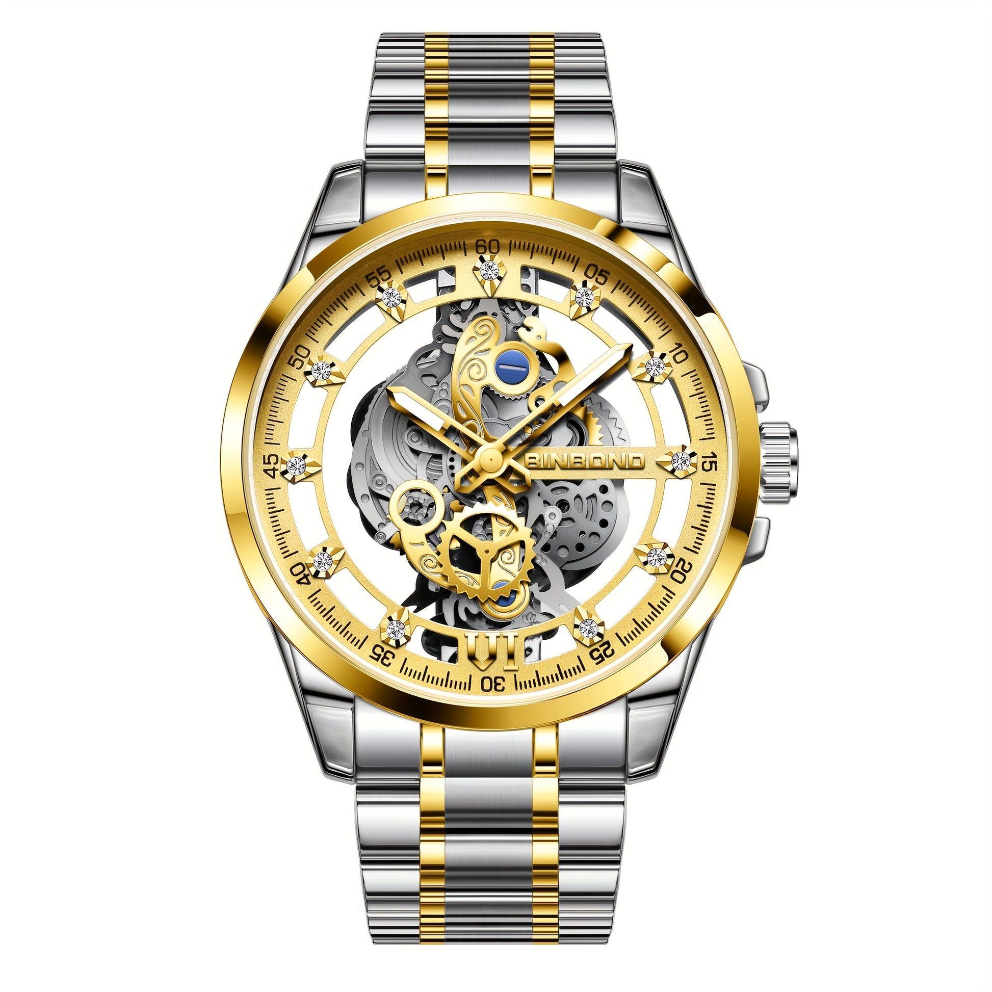 BINBOND տղամարդու նրբագեղ ոսկեգույն քվարցային ժամացույց՝ թափանցիկ երկկողմանի խոռոչավոր դիզայնով, ջրակայուն՝ լուսավոր սլաքներով, չժանգոտվող պողպատե ժապավեն, իդեալական նվեր