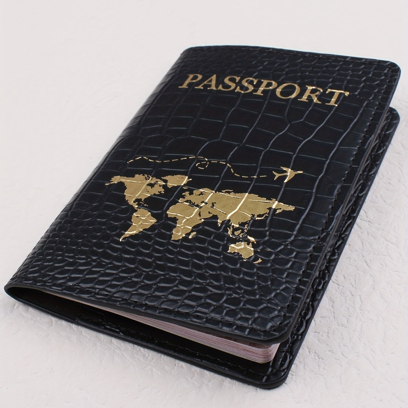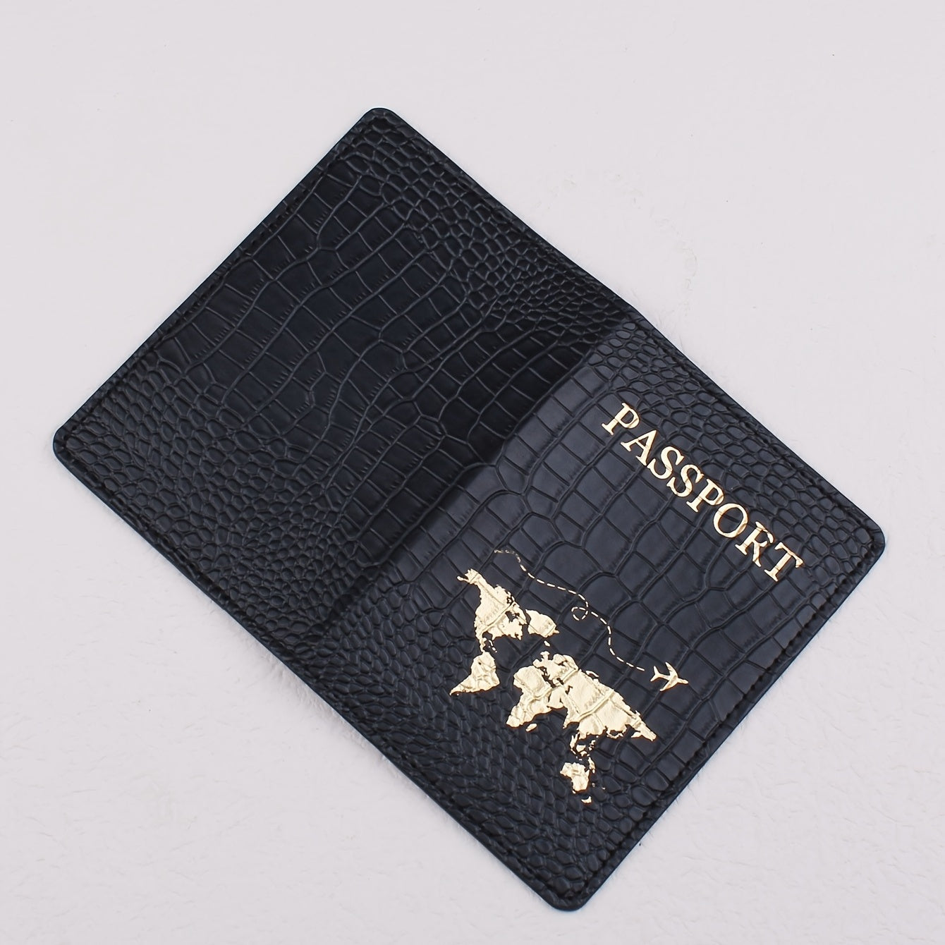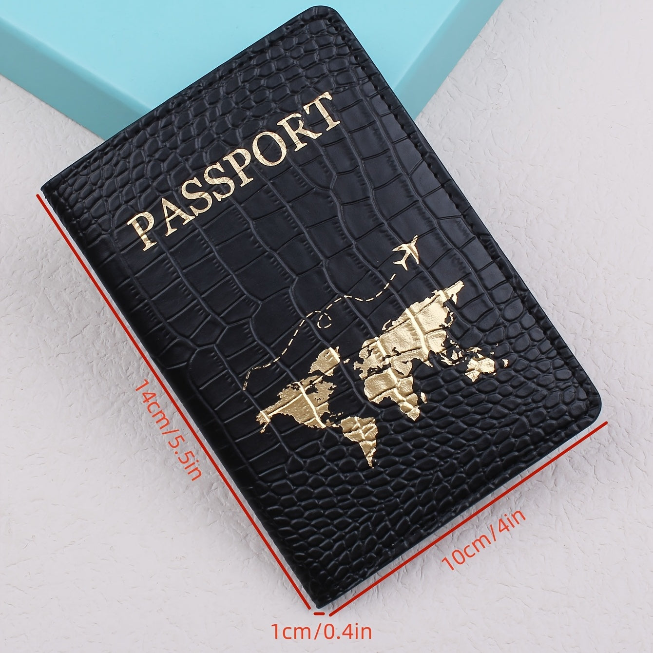 Սև կոկորդիլոսով դաջված ճամփորդական անձնագրի կրիչ՝ ոսկե տառերով և աշխարհի քարտեզի ձևավորումով – Թեթև, բիծակայուն, հակագողության սինթետիկ կաշվից փաստաթղթերի կազմակերպիչ արձակուրդի համար