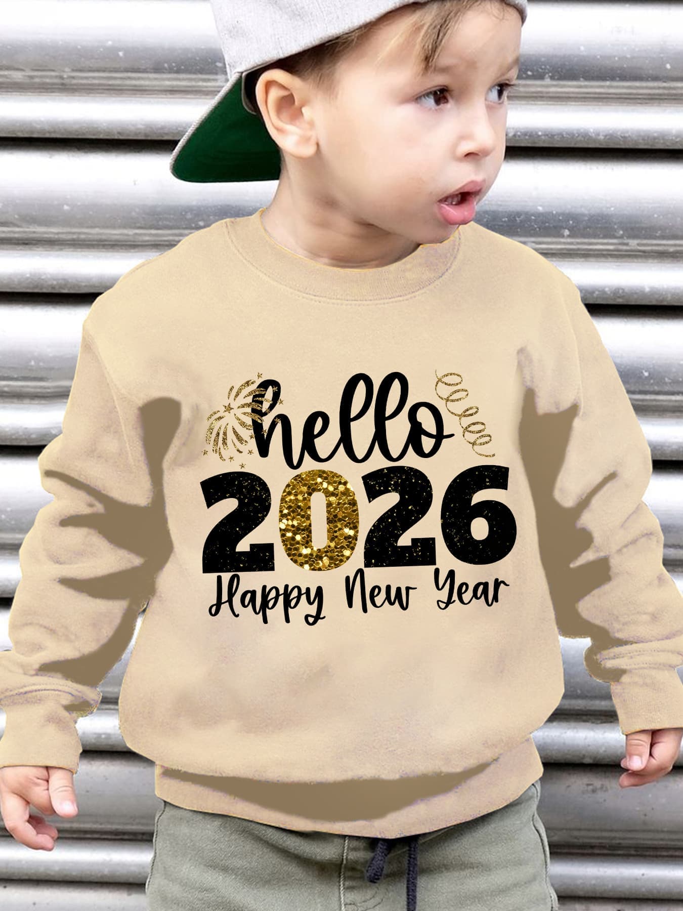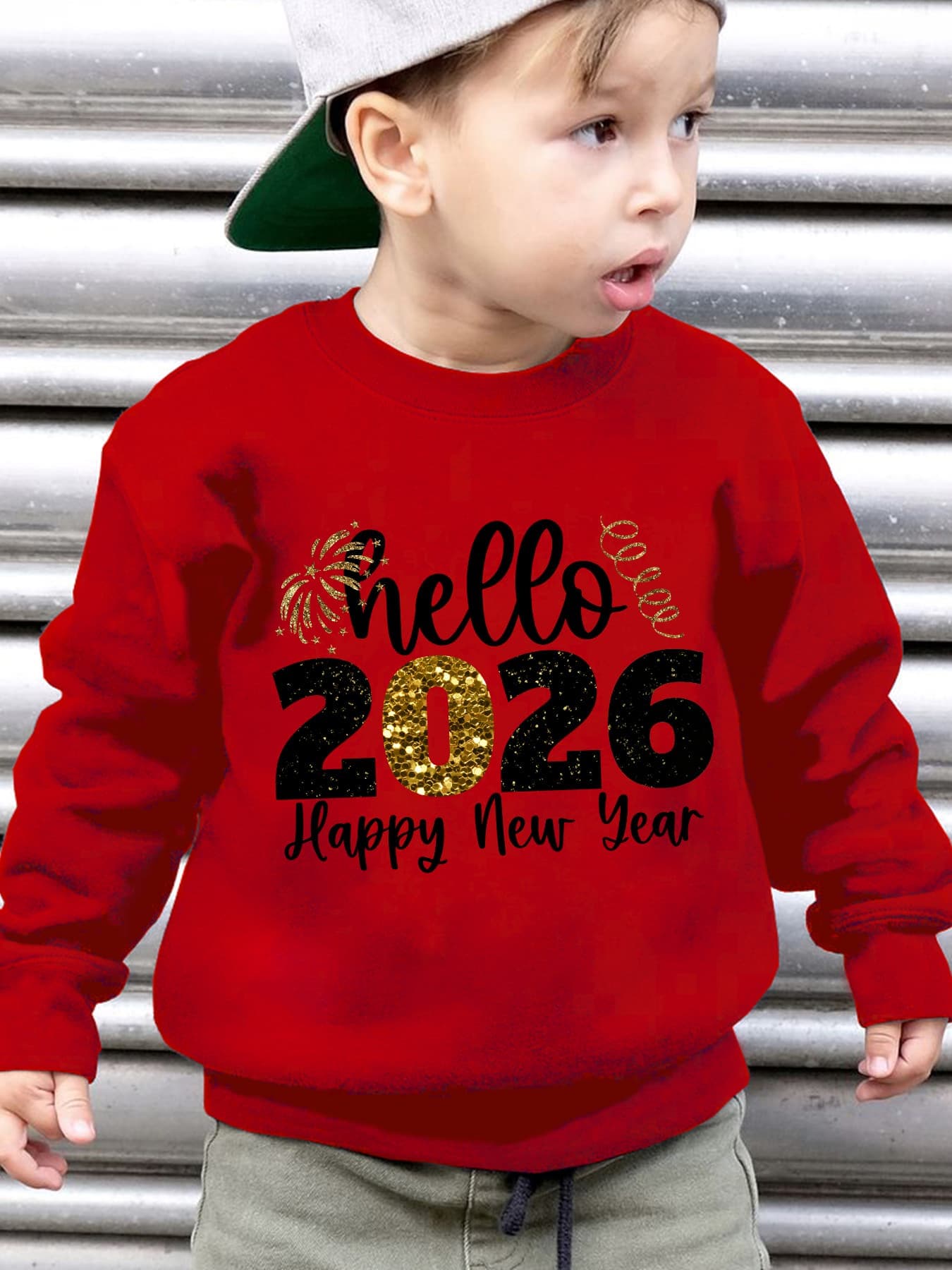 Տղաների 2026 թվականի Նոր տարվա երեկույթի սվիտեր - Բարև 2026 Շնորհավոր Նոր Տարի հրավառության տպագրությամբ, ազատ չափի երկար թևքով սվիտեր ոսկեգույն փայլուն գրությամբ, ձմեռային տաքություն տղաների համար, Նոր տարվա սվիտեր, տոնական հագուստ, խաղալիք
