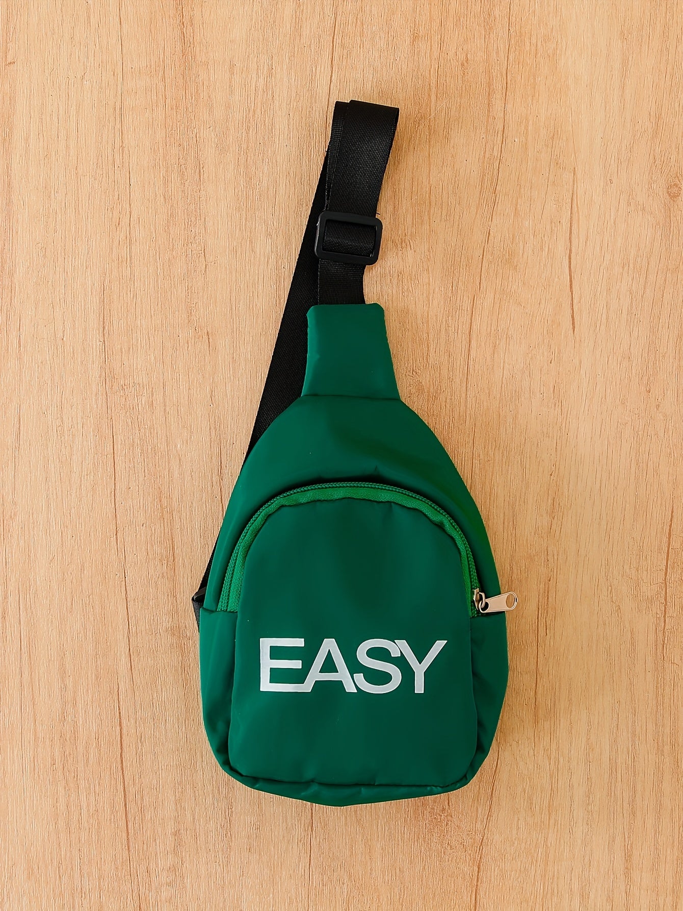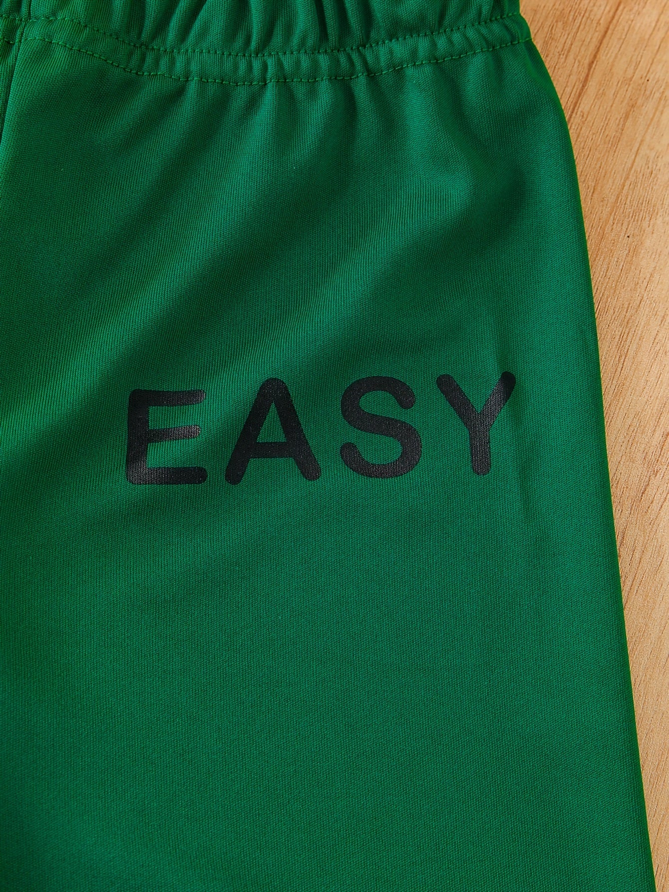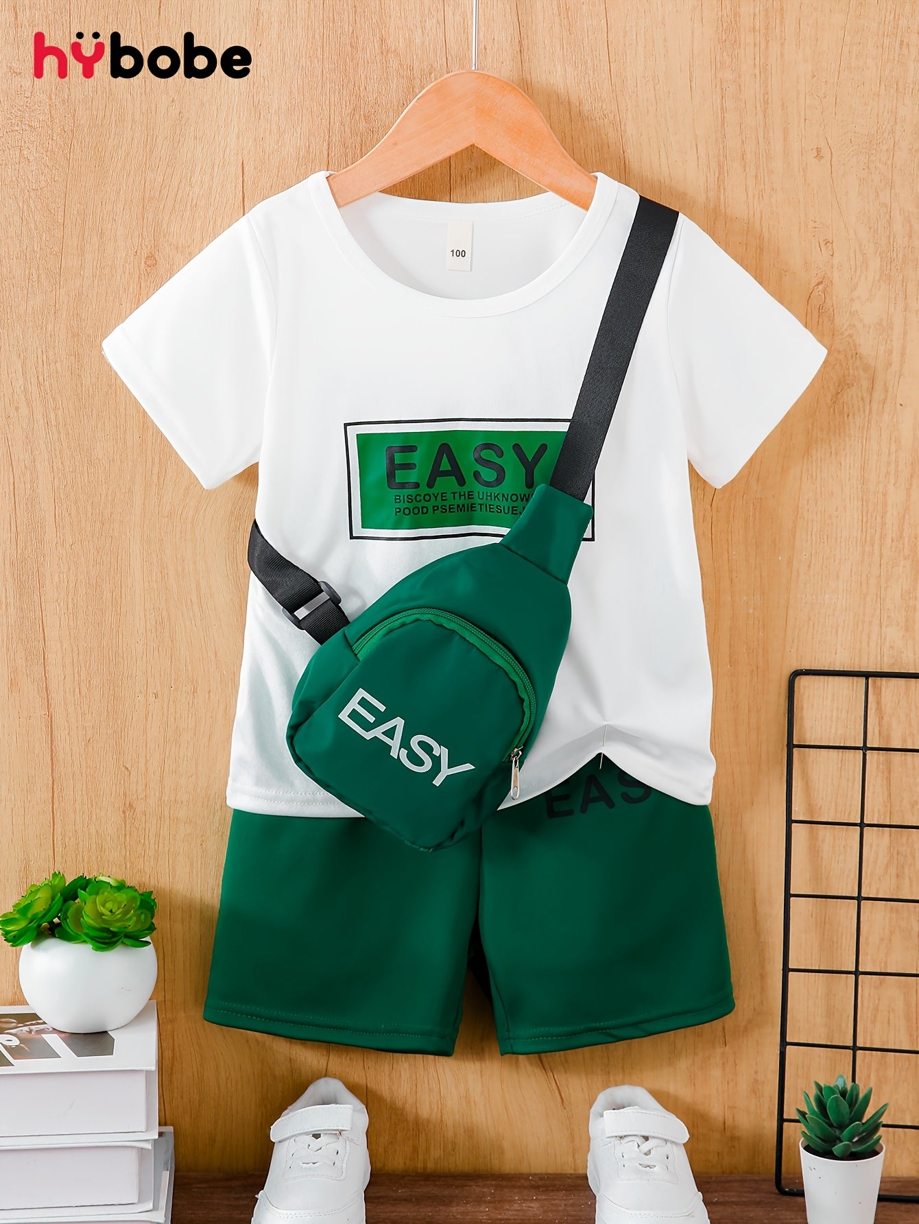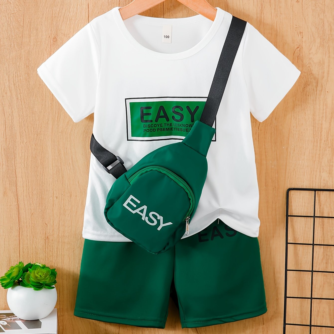 Տղաների համար նախատեսված 3 հատանոց սպիտակ, կլոր վզնոցով մարզաշապիկ EASY գրությամբ, կանաչ, առաձգական գոտկատեղով շորտերով և կանաչ, խաչաձև պայուսակով, առօրյա, հարմարավետ, բացօթյա հագուստի համար, նվերի գաղափար, իդեալական է բացօթյա օգտագործման համար։