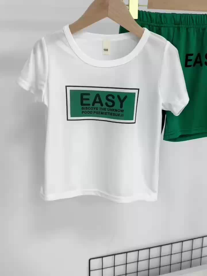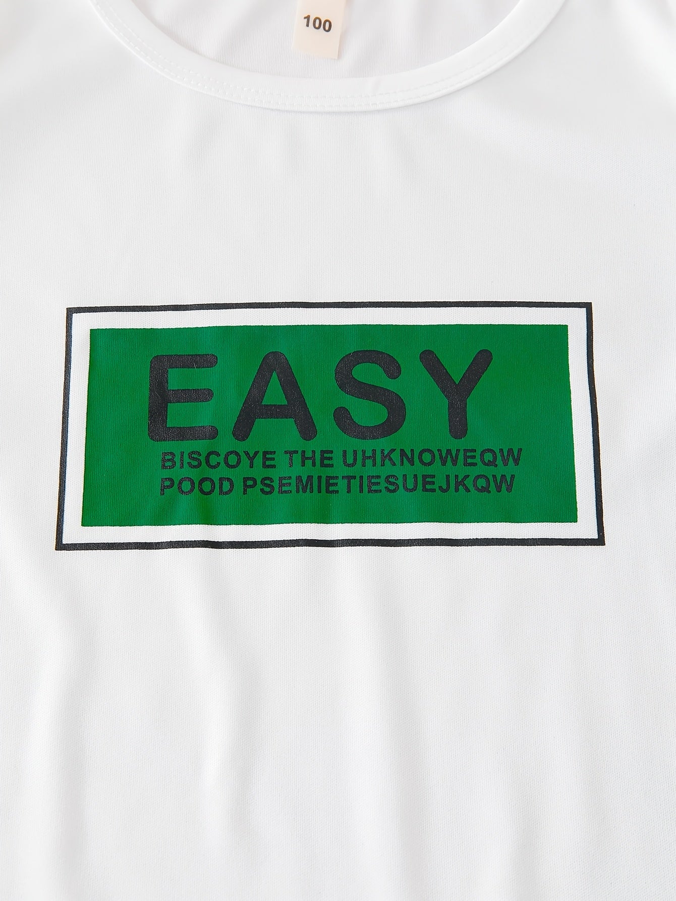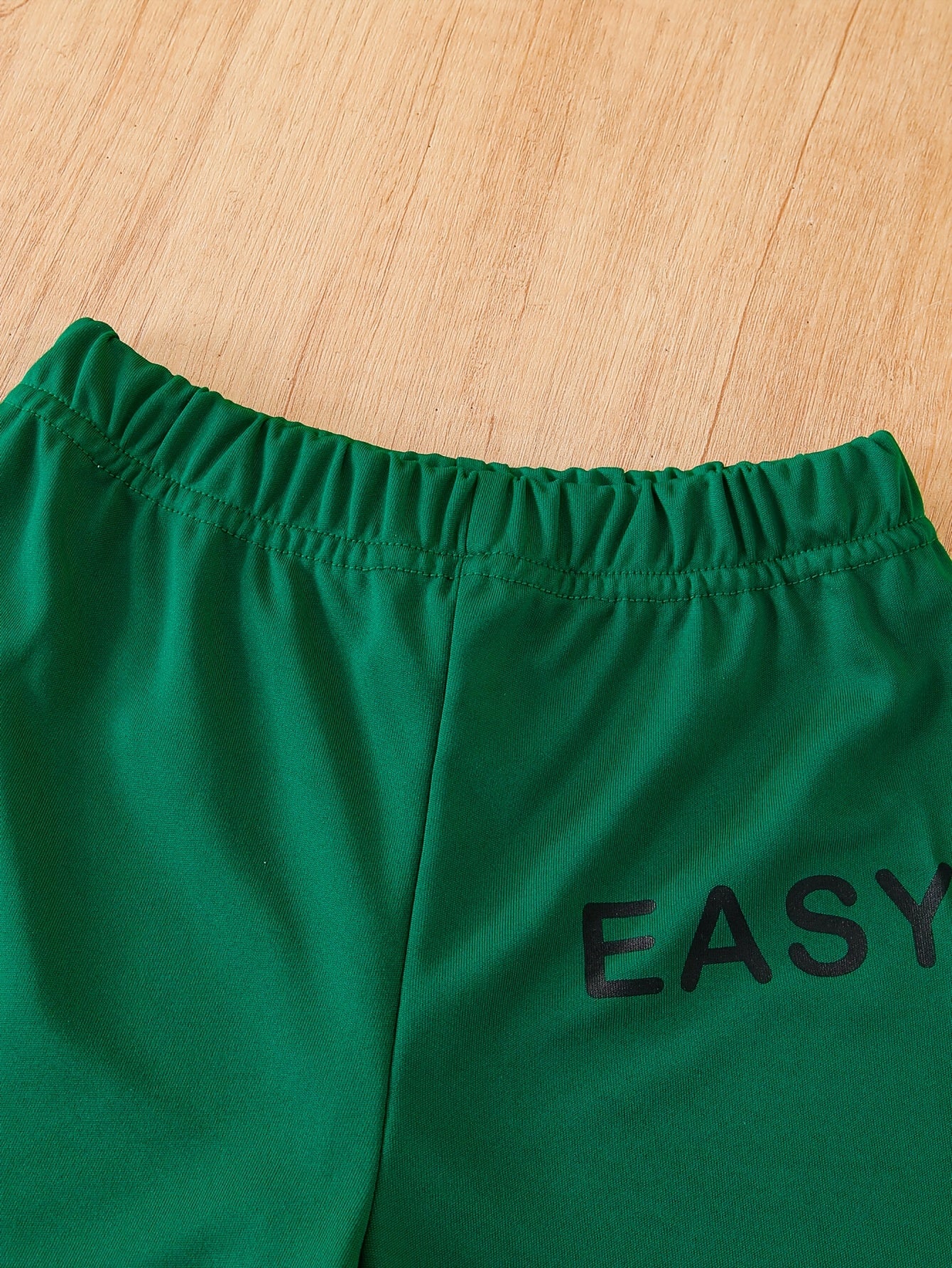 Տղաների համար նախատեսված 3 հատանոց սպիտակ, կլոր վզնոցով մարզաշապիկ EASY գրությամբ, կանաչ, առաձգական գոտկատեղով շորտերով և կանաչ, խաչաձև պայուսակով, առօրյա, հարմարավետ, բացօթյա հագուստի համար, նվերի գաղափար, իդեալական է բացօթյա օգտագործման համար։