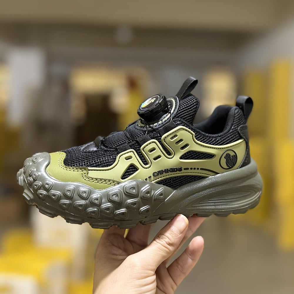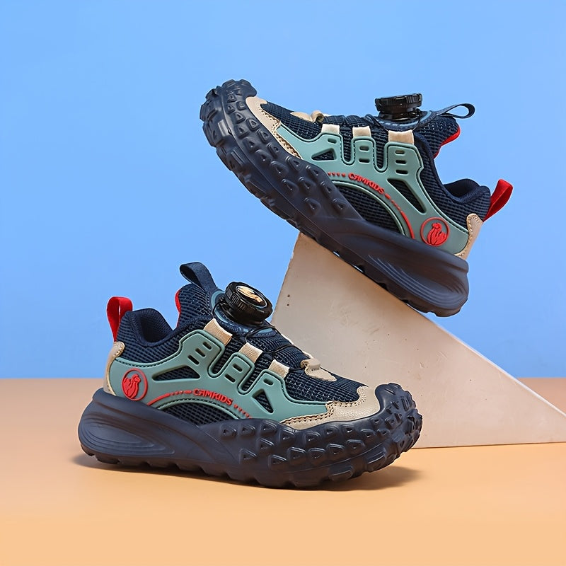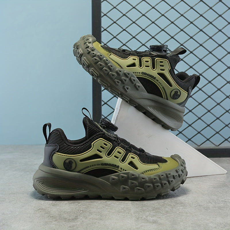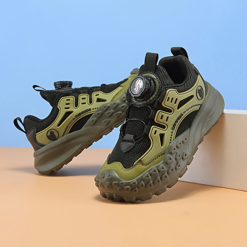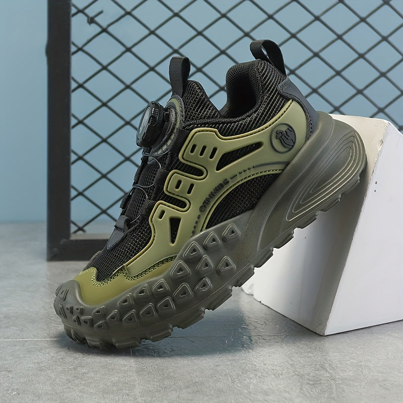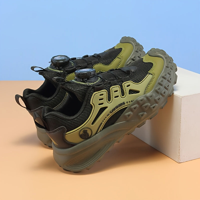 Տղաների շնչող ցանցե սպորտային կոշիկներ՝ պտտվող կոճակով փակմամբ - թեթև EVA ներբան, դիմացկուն PU և գործվածքային վերին մաս, բոլոր եղանակների համար նախատեսված արշավային կոշիկներ (սև/կանաչ/կարմիր երանգներով):
