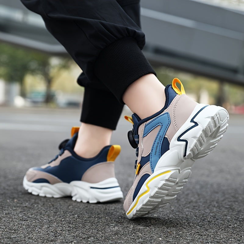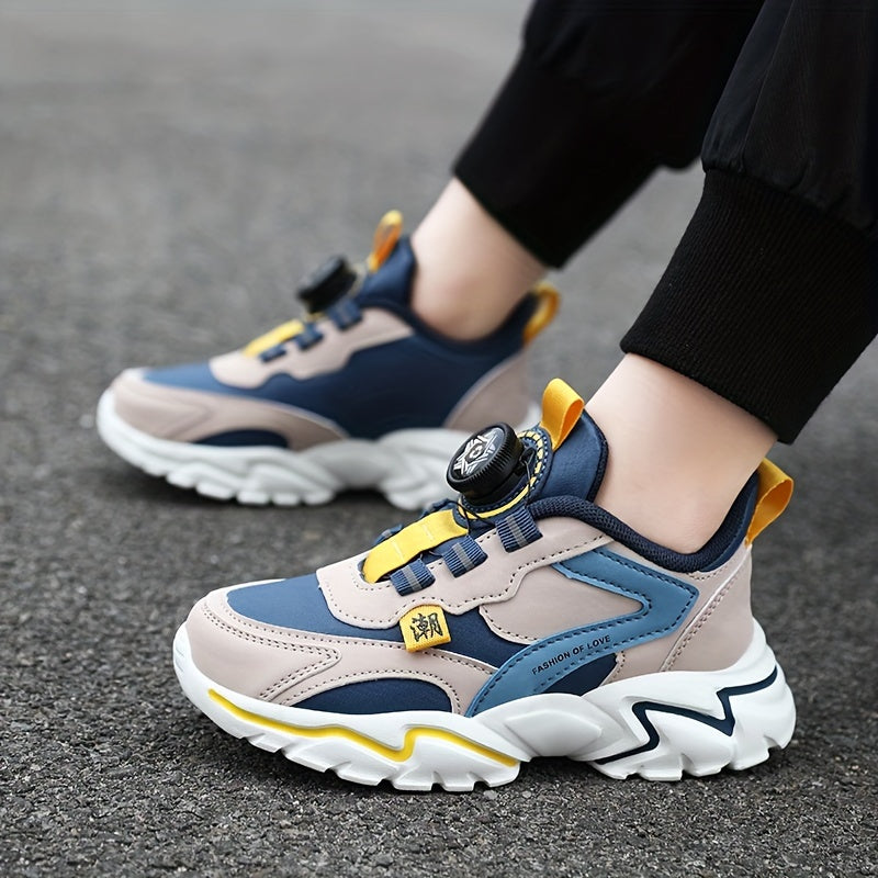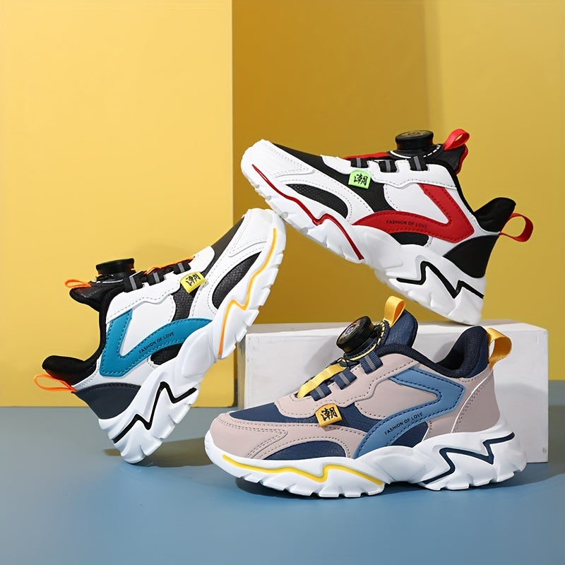 Boys' Fashion Sneakers with Striped Design - Casual Sports Running Shoes with Rotary Buckle Closure, Low Top PU Upper, Fabric Lining, EVA Sole, All-Season Comfort for Daily Wear - Tassel Detail, Round Toe for Ages 14 and Unde