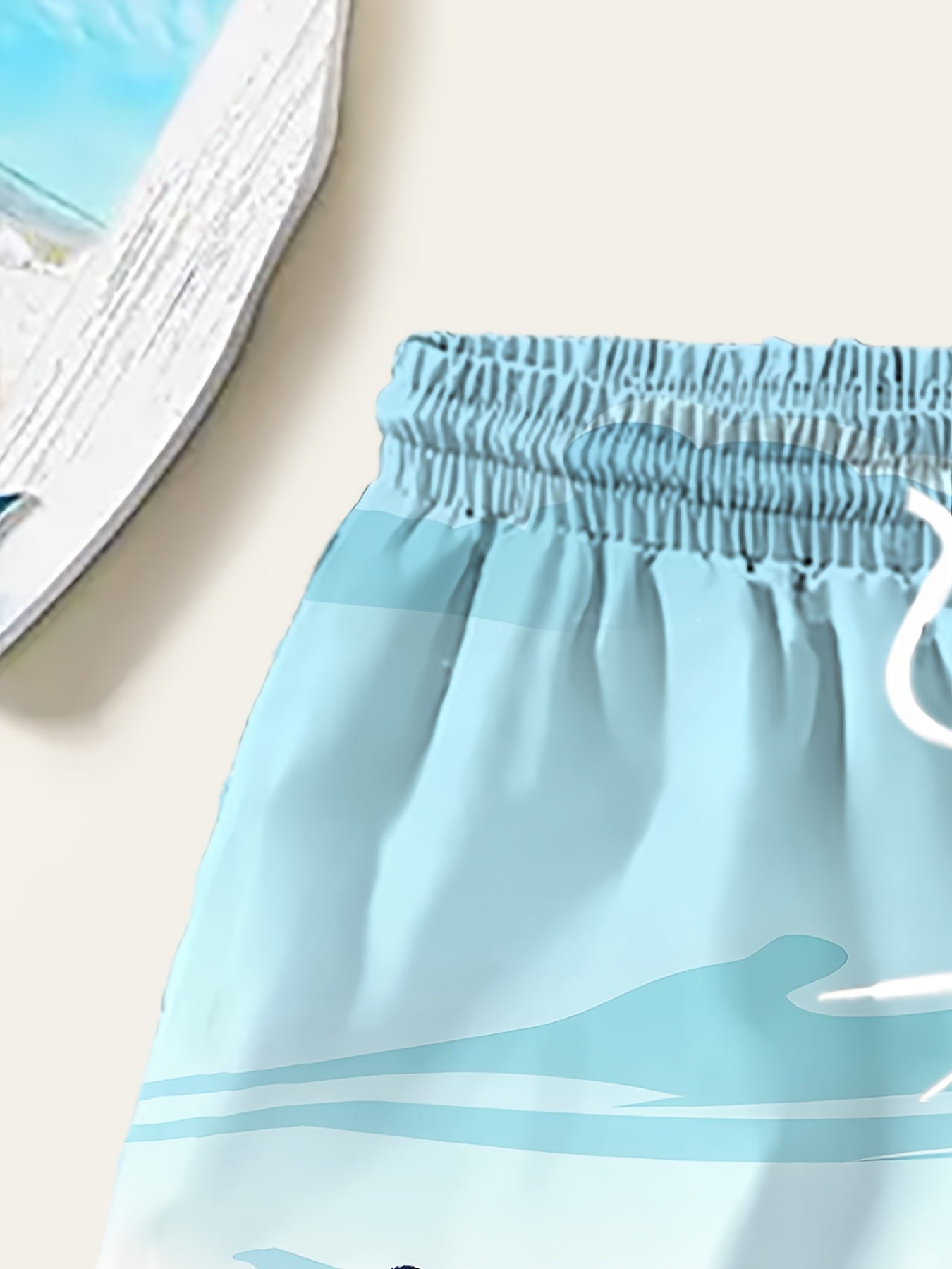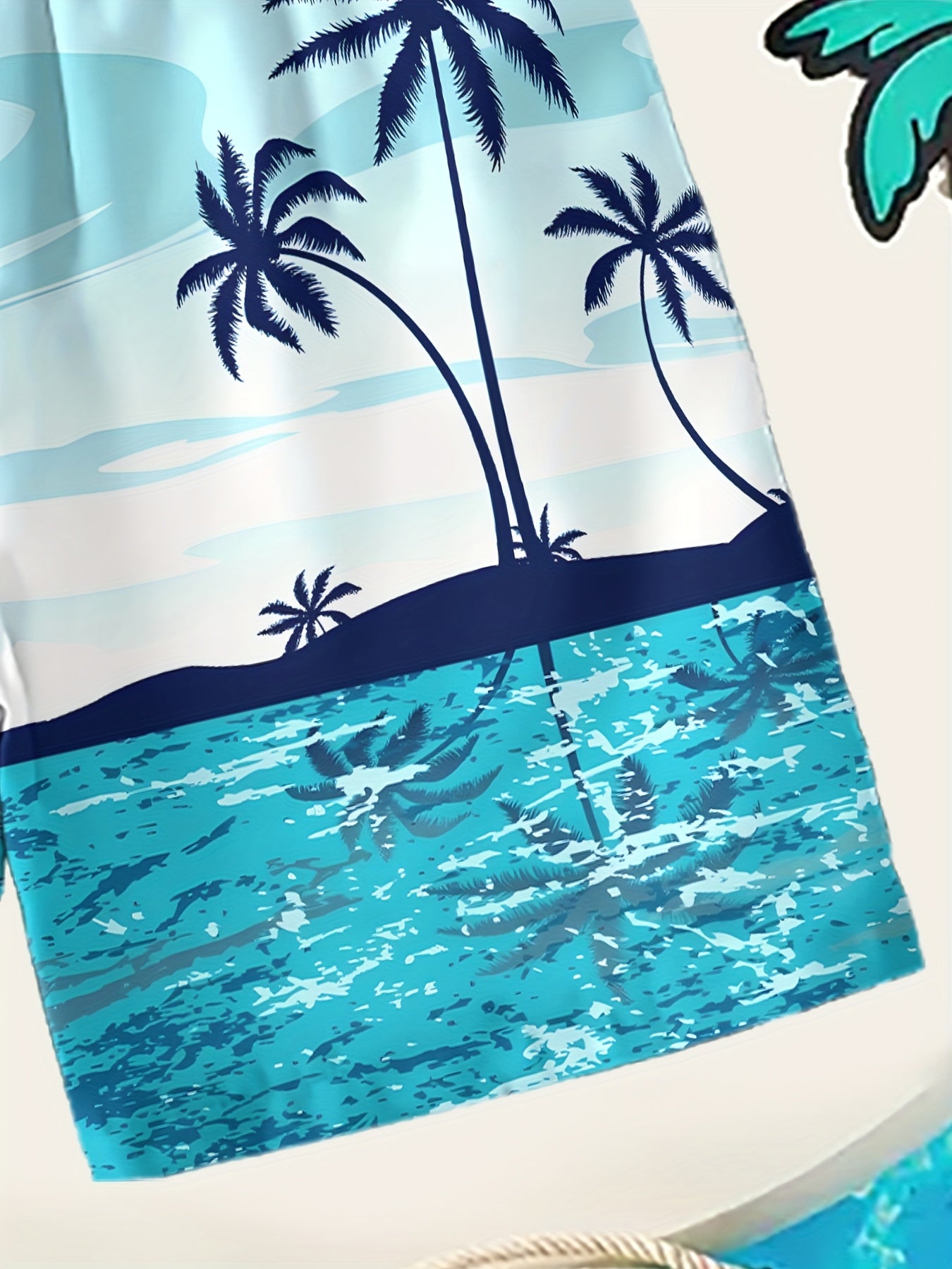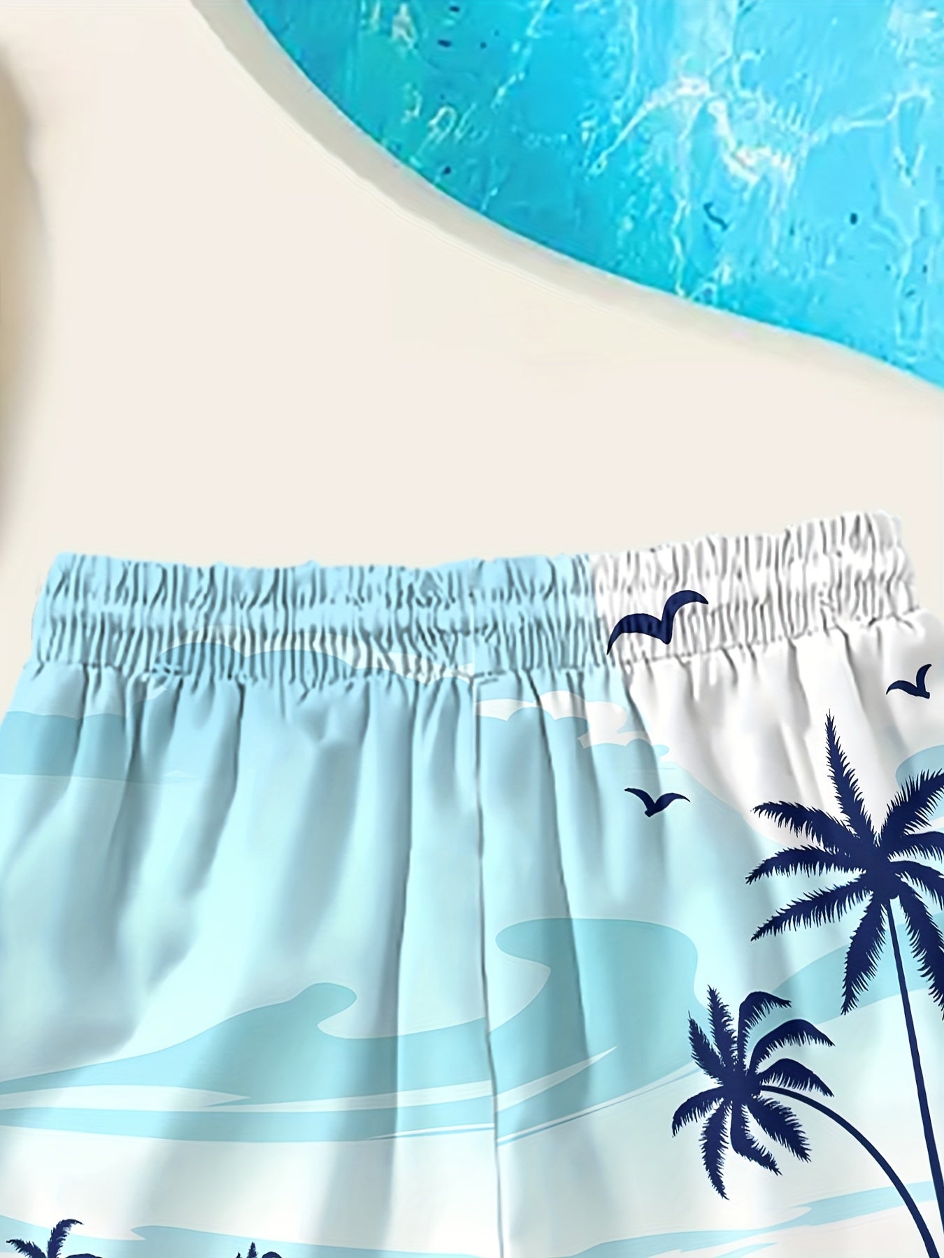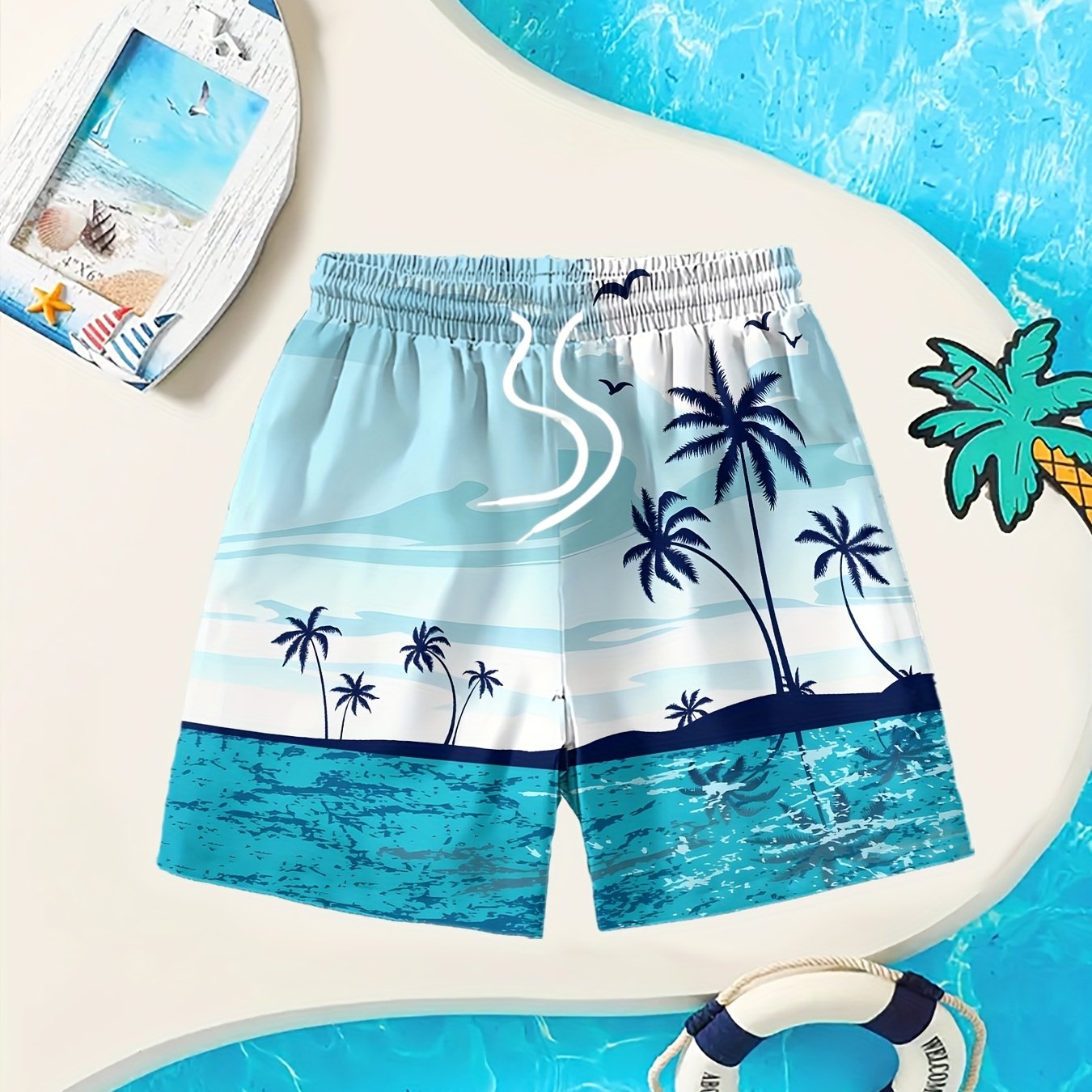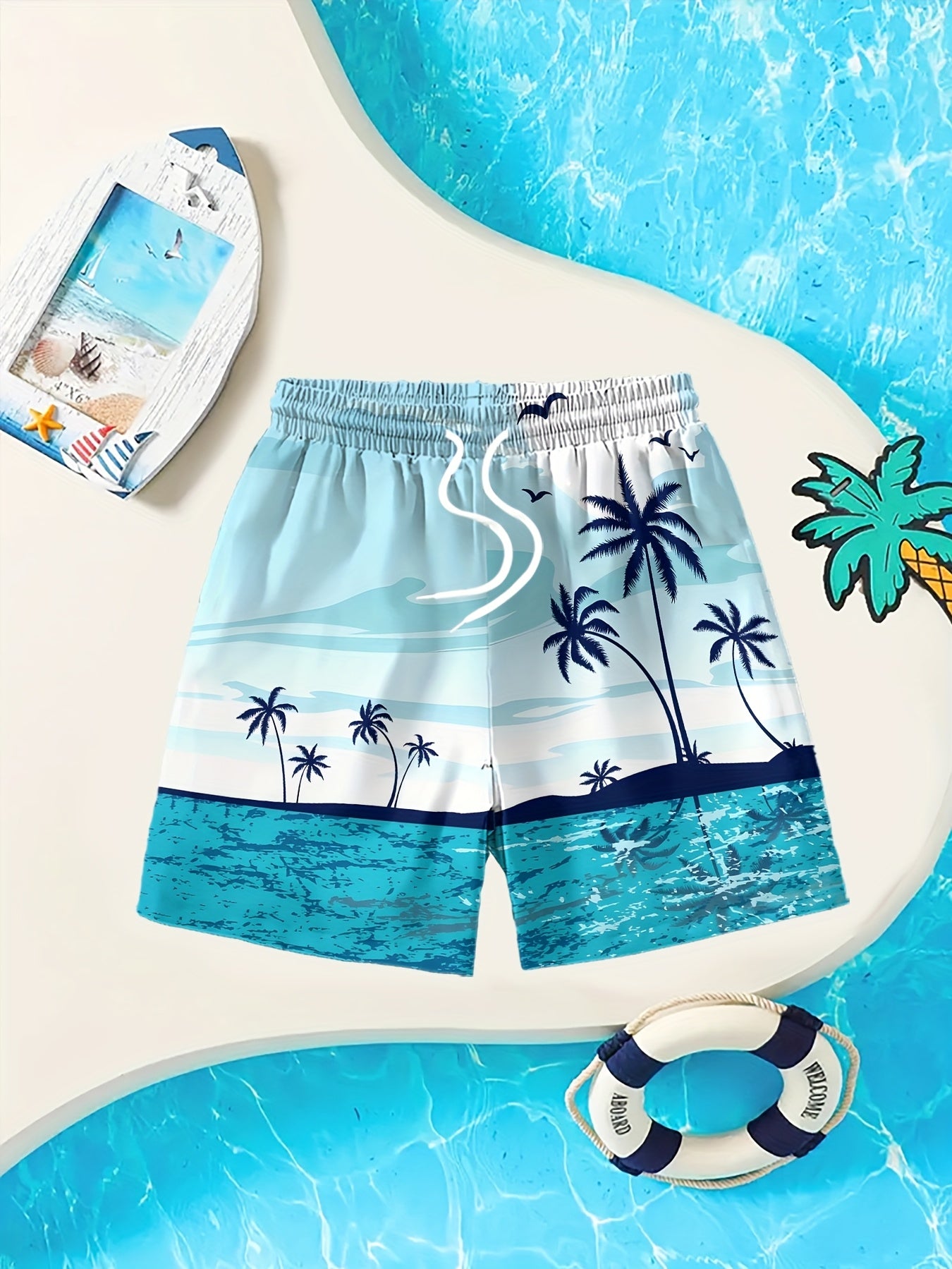 Տղաների արևադարձային լողափնյա նախշերով լողազգեստի շորտեր՝ արագ չորացող, շնչող պոլիեսթերից՝ առաձգական գոտկատեղով և լարով, բաց կապույտ արմավենու նախշերով՝ ամառային զվարճանքի և սերֆինգի համար, լողափնյա շորտեր, արագ չորացող գործվածք, բացօթյա օգտագործման համար