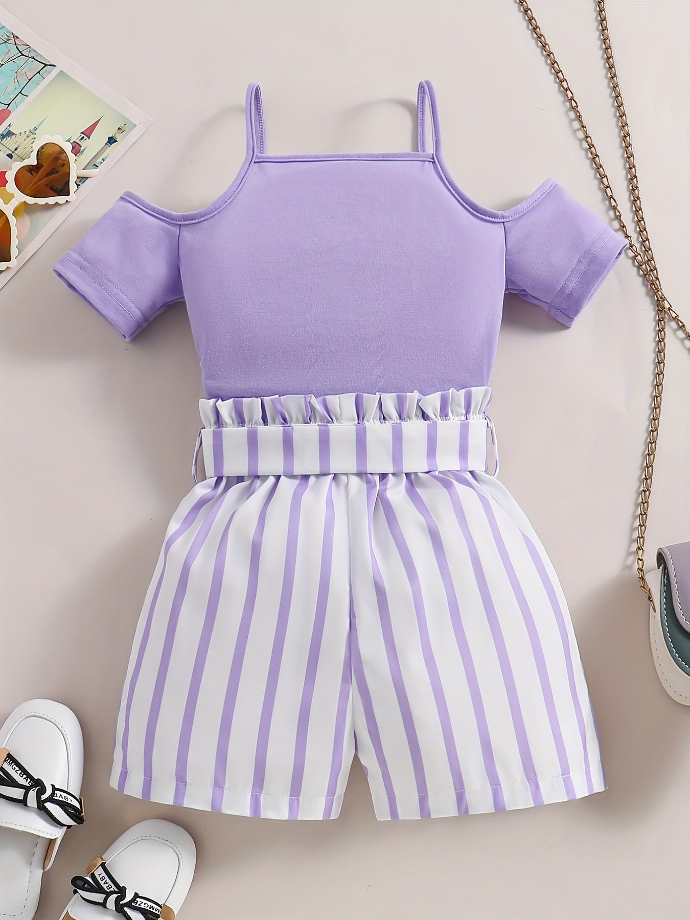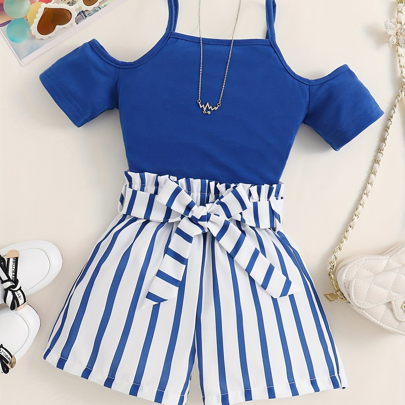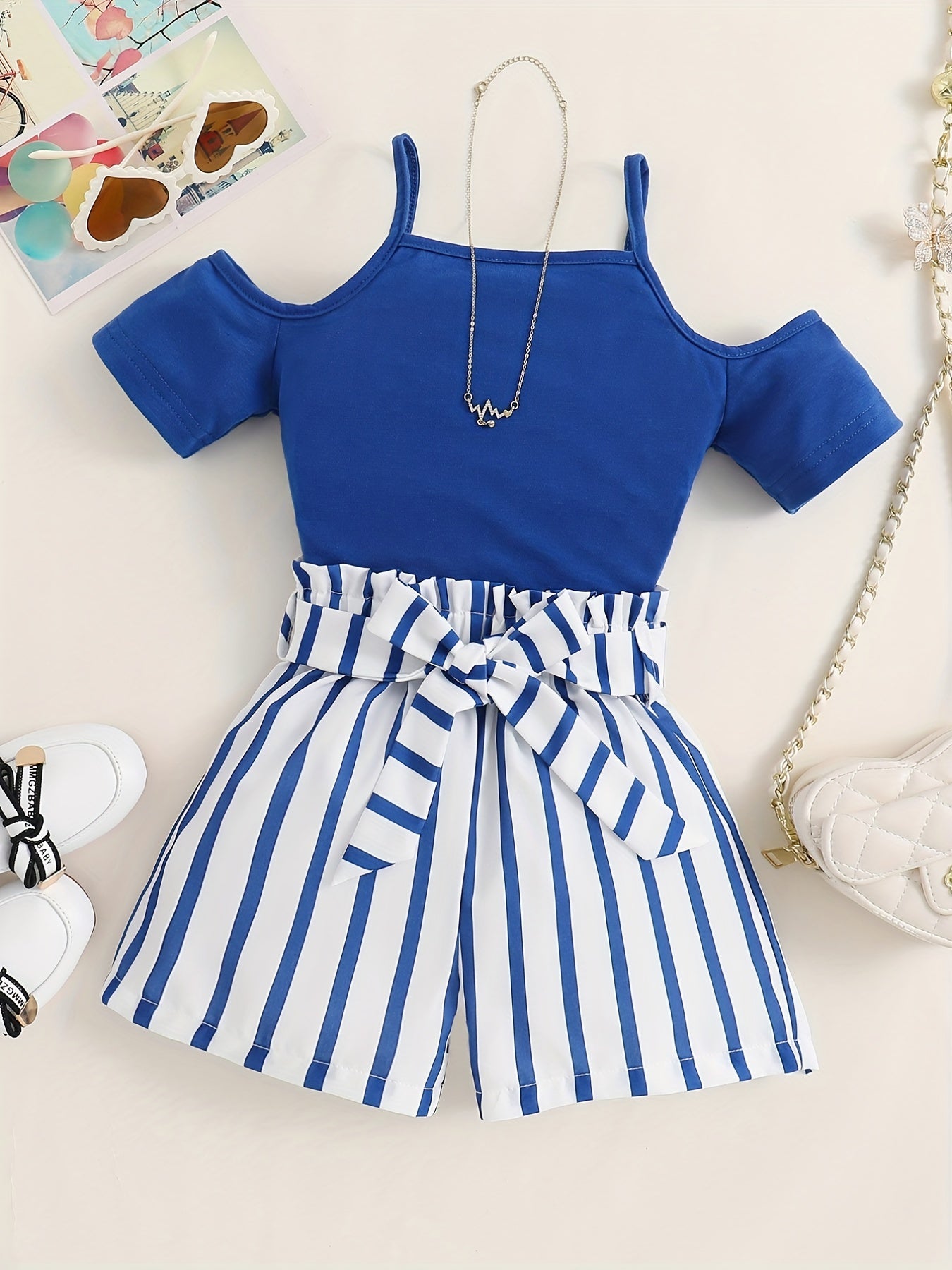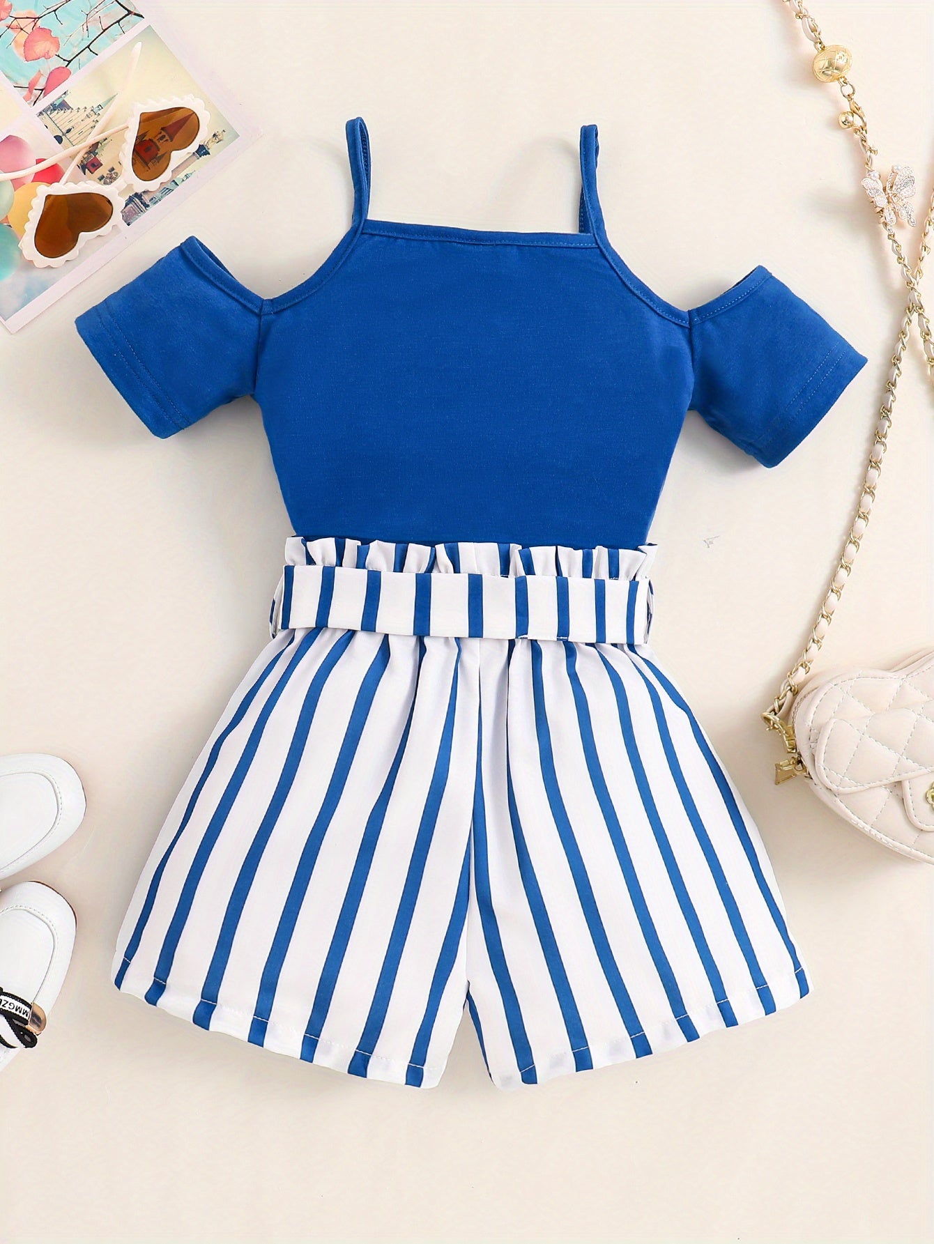 Cami վերնաշապիկ և գծավոր շորտեր՝ գոտիով աղջիկների երկու կտոր հավաքածուով, ամառային ամենօրյա ամենօրյա հագուստ բացօթյա