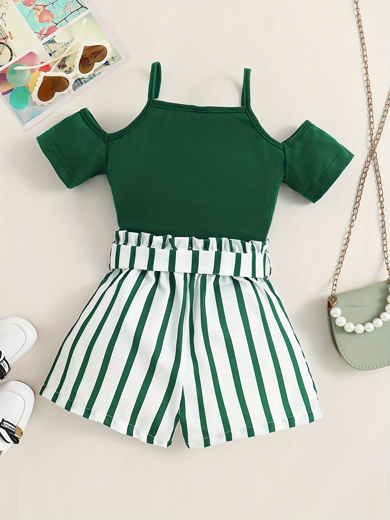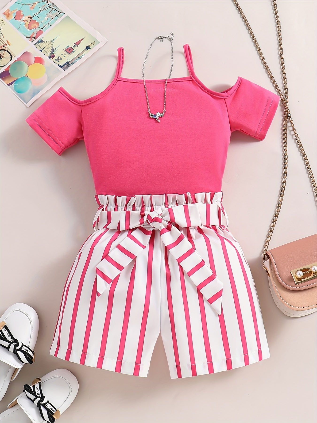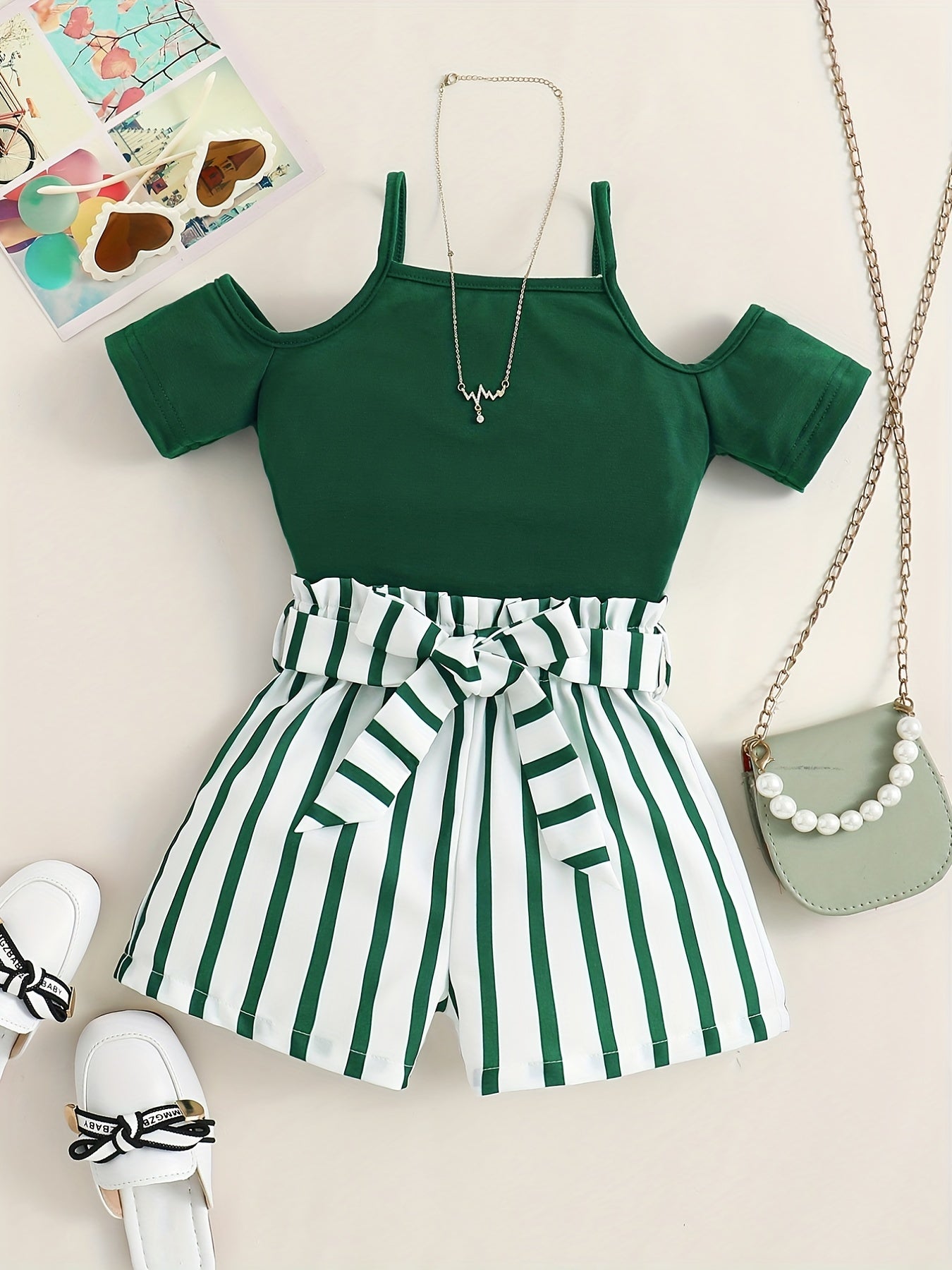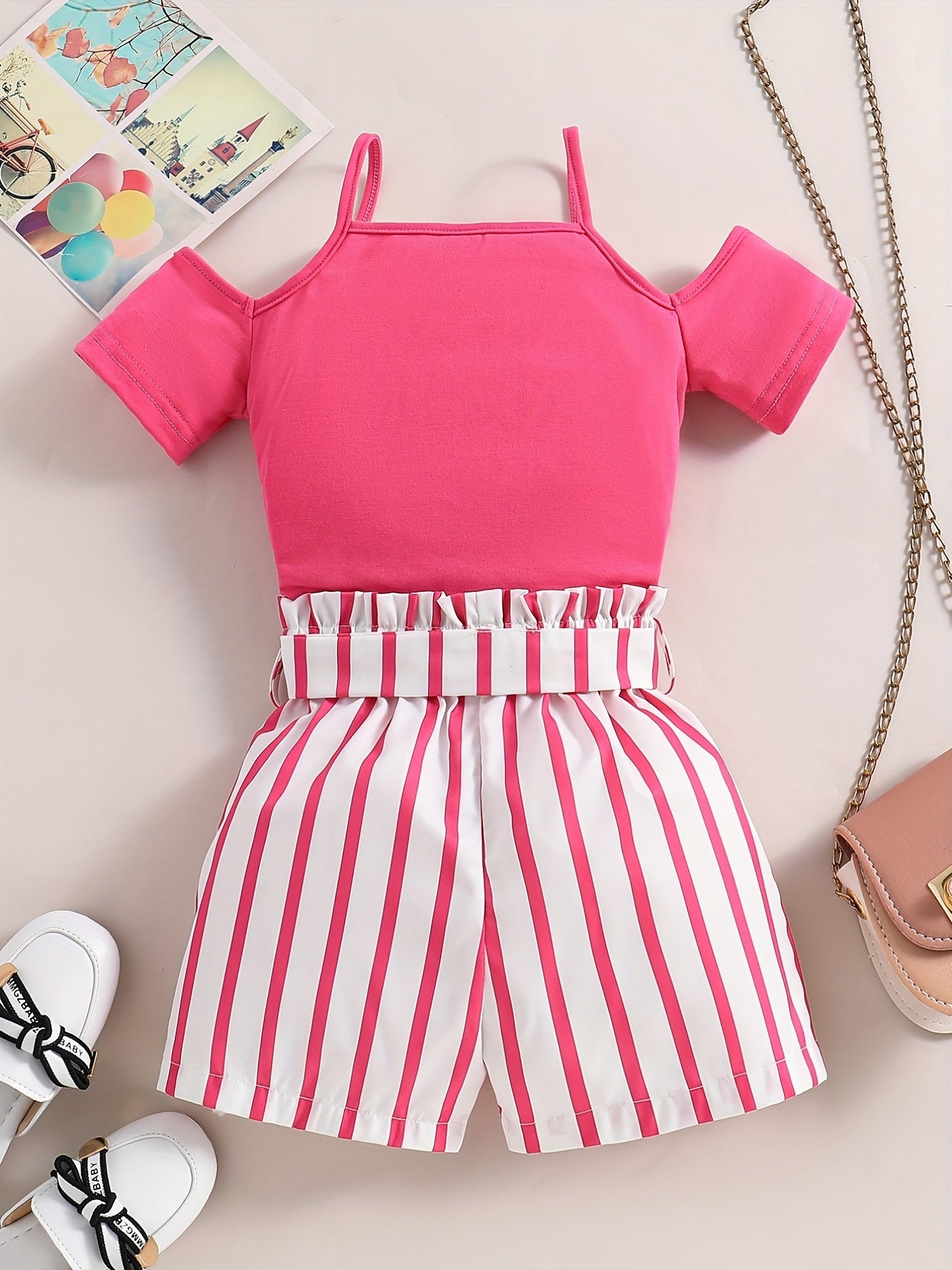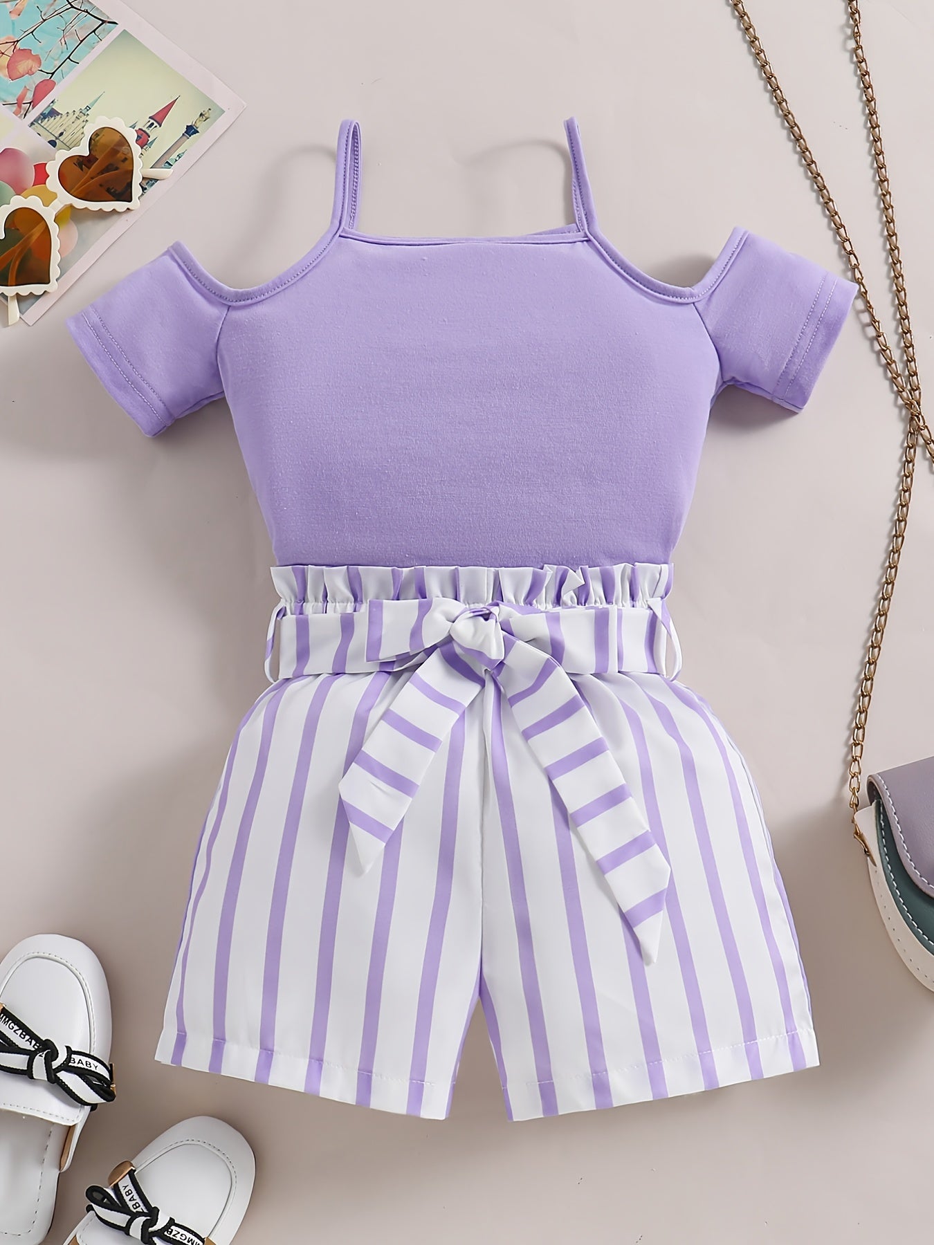 Cami վերնաշապիկ և գծավոր շորտեր՝ գոտիով աղջիկների երկու կտոր հավաքածուով, ամառային ամենօրյա ամենօրյա հագուստ բացօթյա