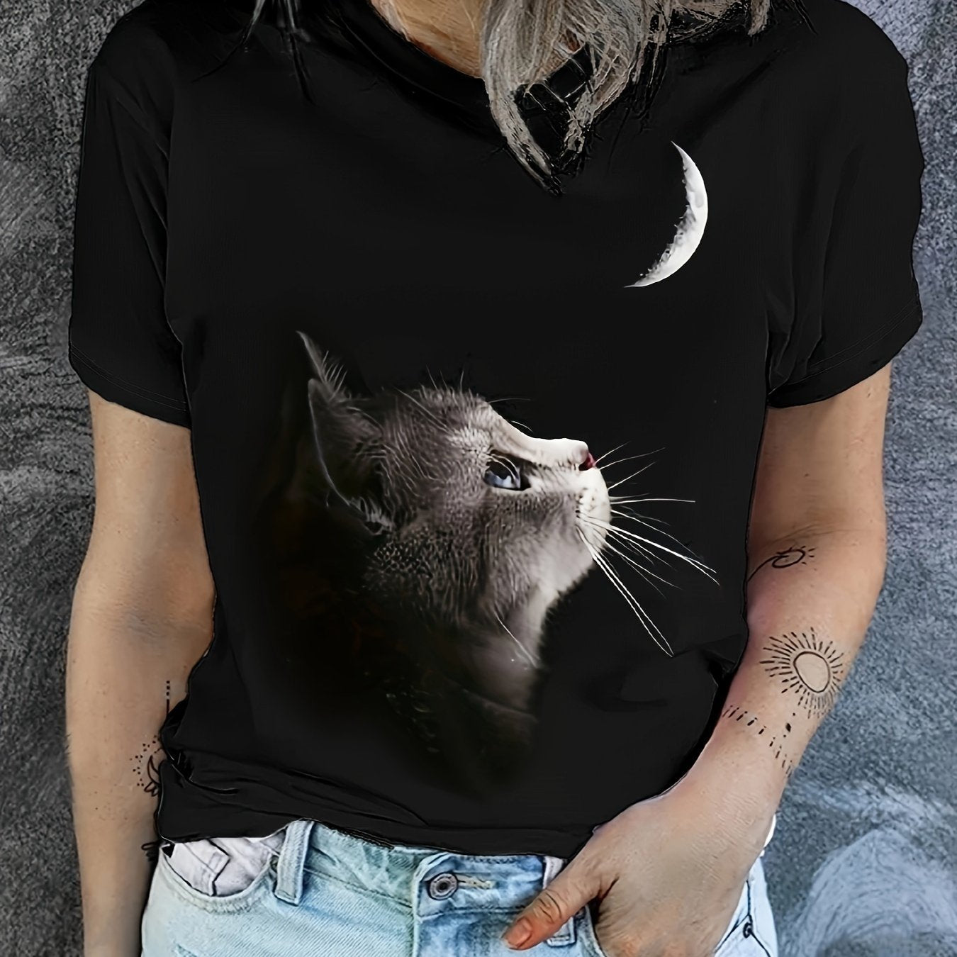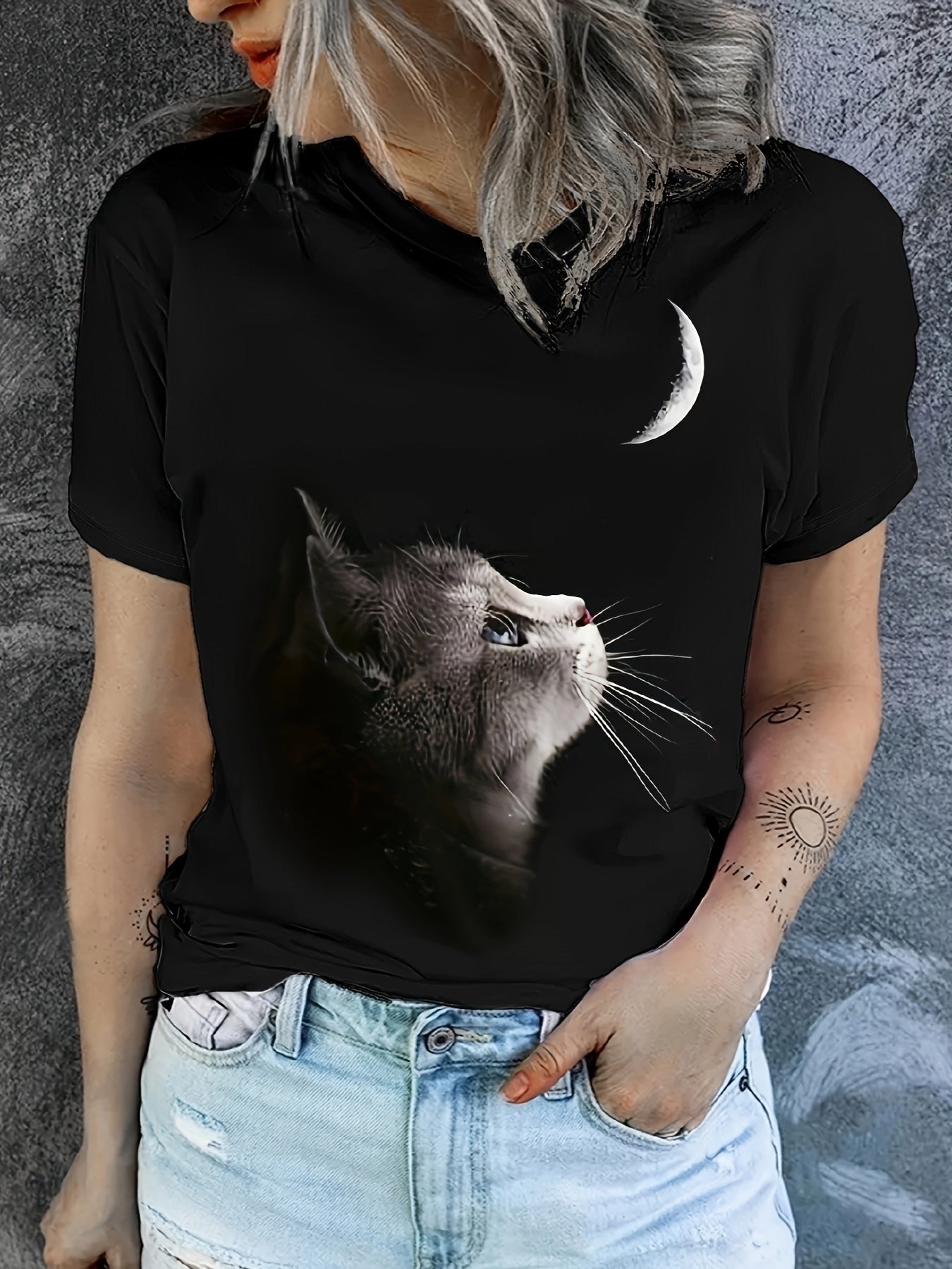 Cat Print կարճաթև շապիկ, ամենօրյա բրիգադային վերնաշապիկ գարնան և ամառի համար, կանացի հագուստ