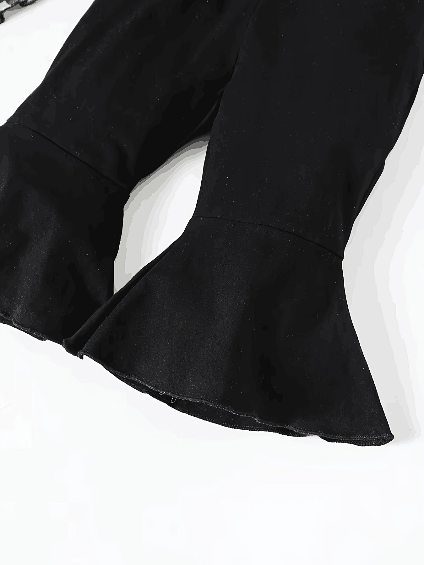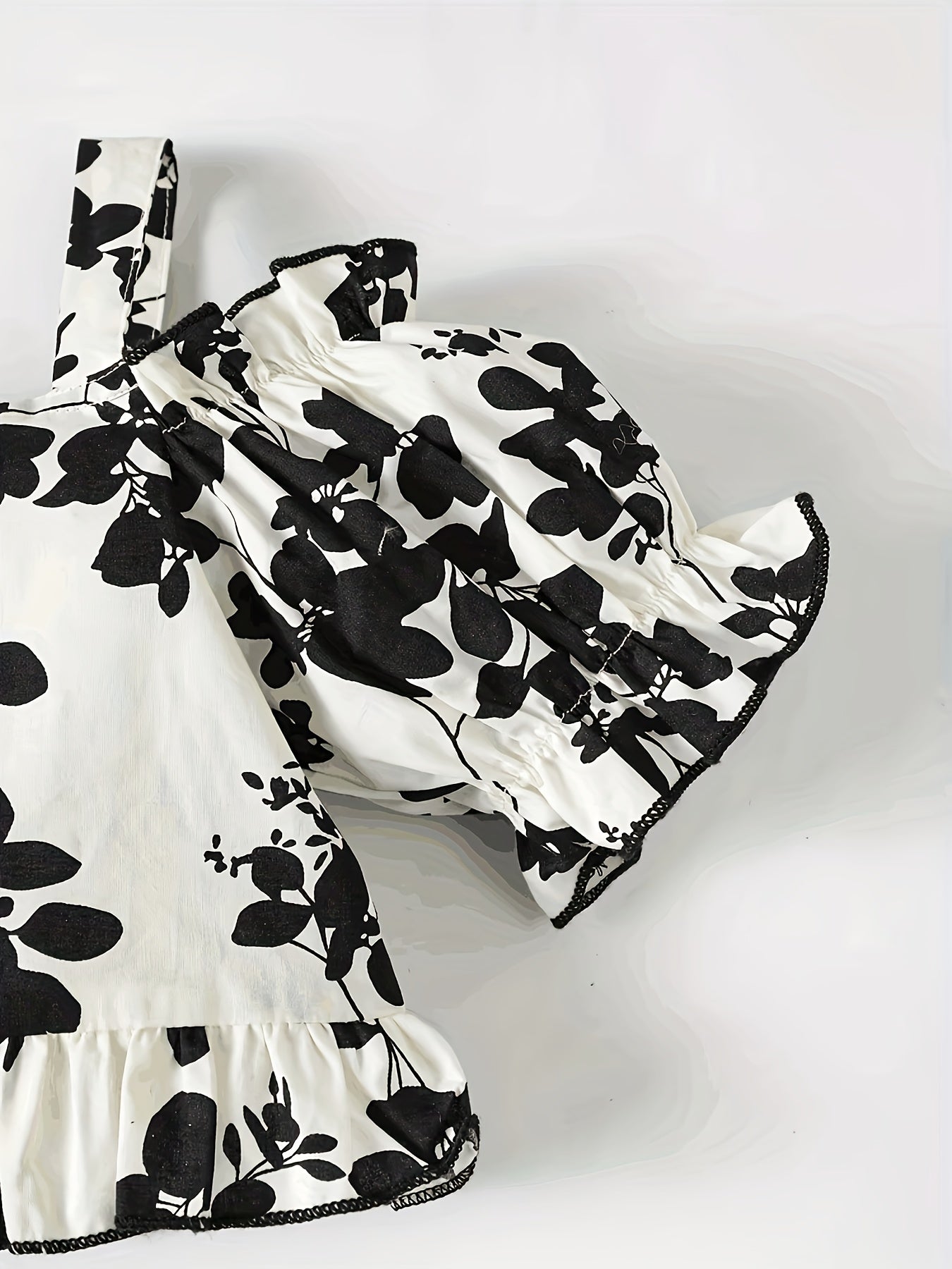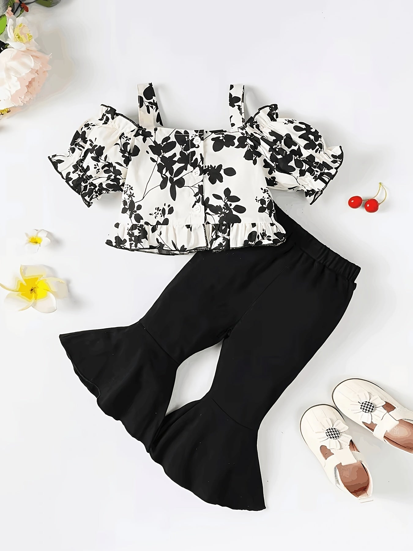 Փոքրիկ աղջիկների համար նախատեսված շքեղ հավաքածու՝ ուսերից դուրս ծաղկավոր վերնաշապիկ և սև շալվար՝ բամբակյա խառնուրդ, չձգվող, ամառային պատահական հանդերձանք, կատարյալ դրսի համար