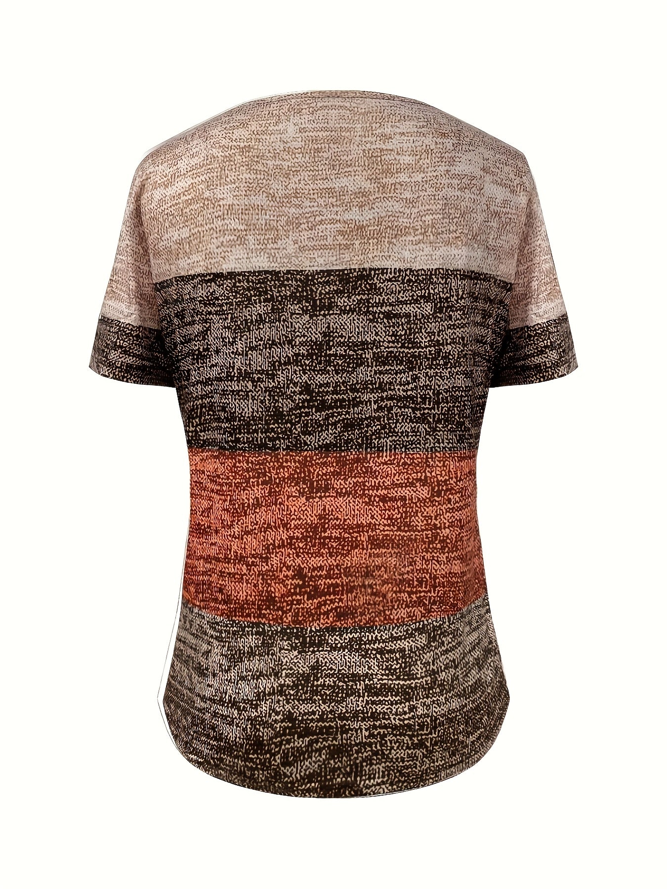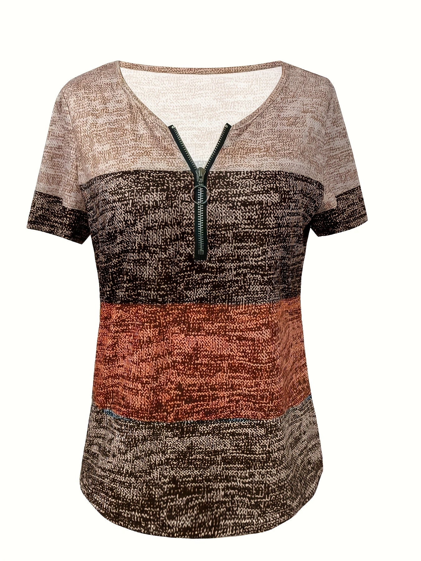 Շքեղ կանացի սուրճից ներշնչված գունավոր բլոկ, որը ներշնչված է V- պարանոցով, էլեգանտ կարճ թեւ, երկրաչափական նախշով, ձգվող պոլիեսթեր խառնուրդով, լվացվող մեքենայում՝ կատարյալ բոլոր եղանակների համար