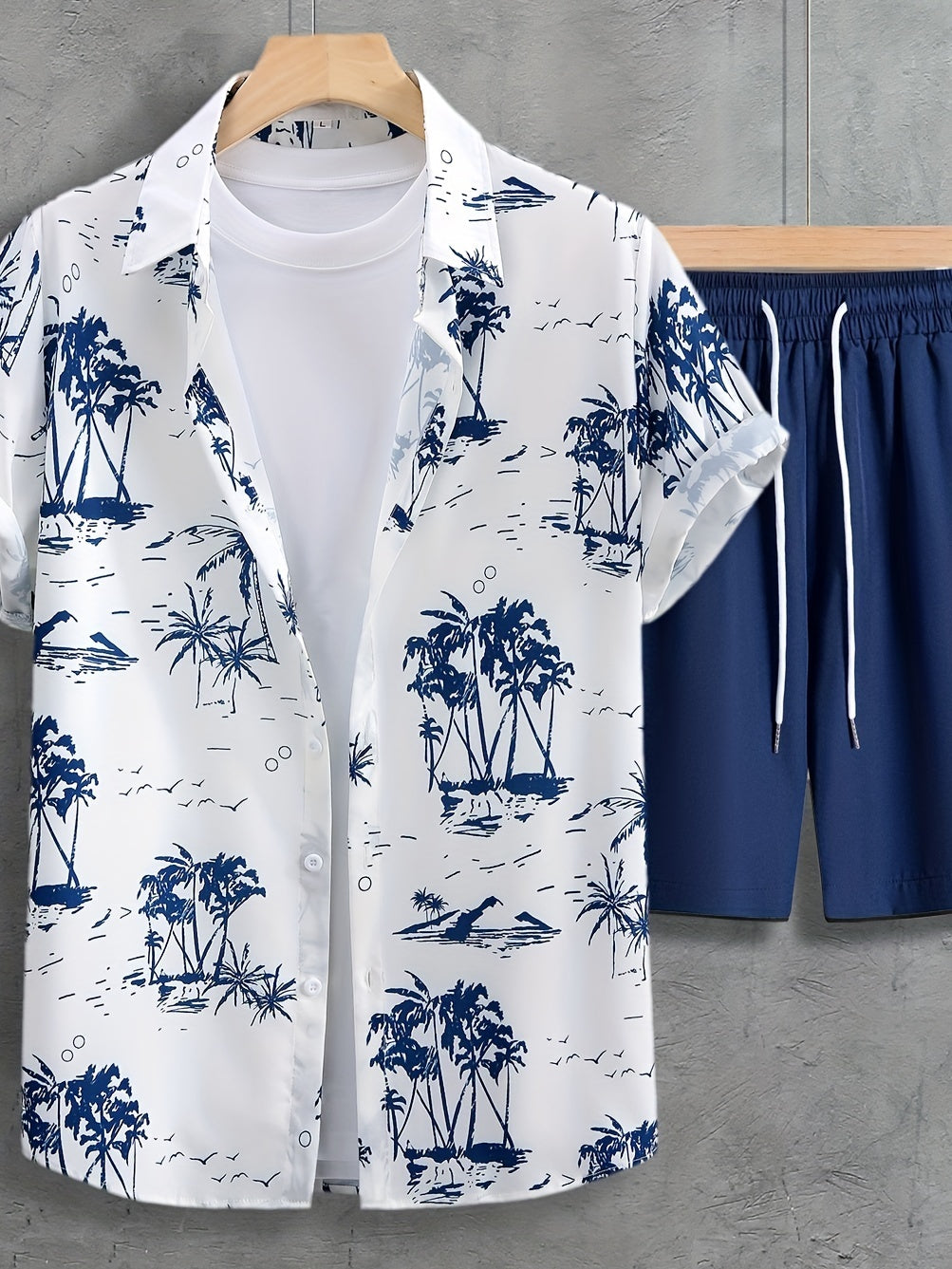 Կոկոսի ծառեր, տղամարդու 2 հատ, կարճ թևքերով, գրաֆիկական նախշերով, կոճակներով վերնաշապիկ և լարով շորտեր, համադրություն