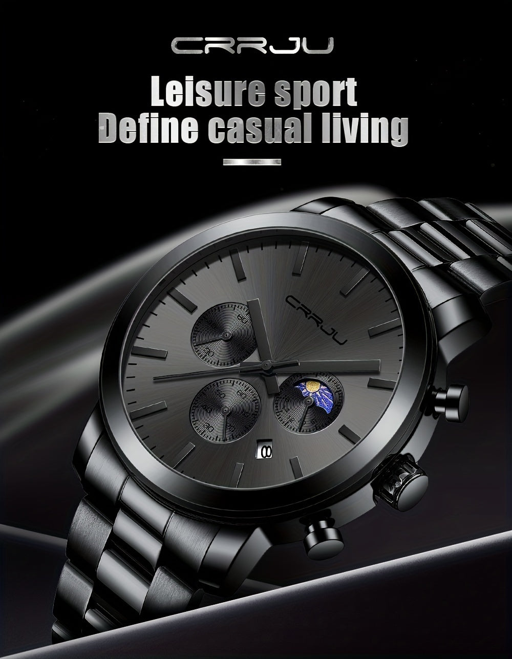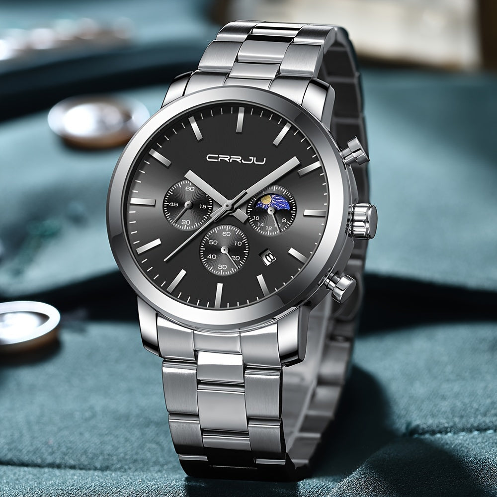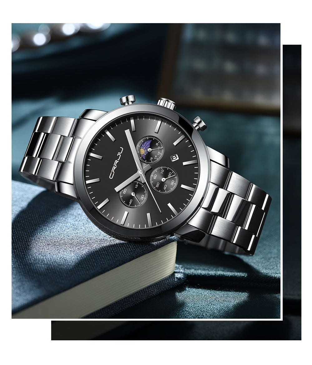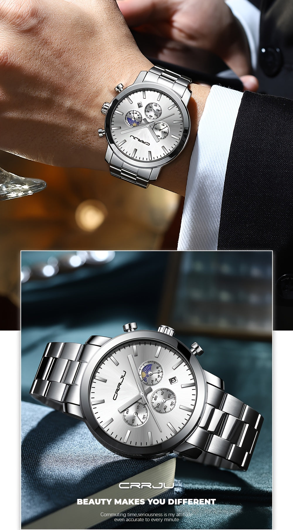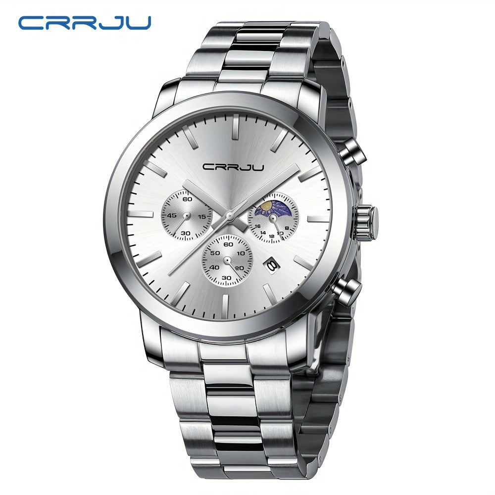CRRJU տղամարդու շքեղ նորաձև ժամացույց՝ նրբագեղ գործնական ոճով, չժանգոտվող պողպատե ժապավենով, բազմաֆունկցիոնալ քվարցային ժամացույց՝ քրոնոգրաֆով, ամսաթվի ցուցադրմամբ, լուսավոր սլաքներով և ենթացուցիչով, հարմար է կանանց համար