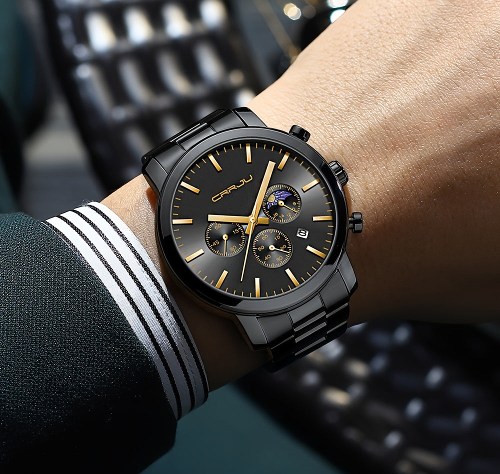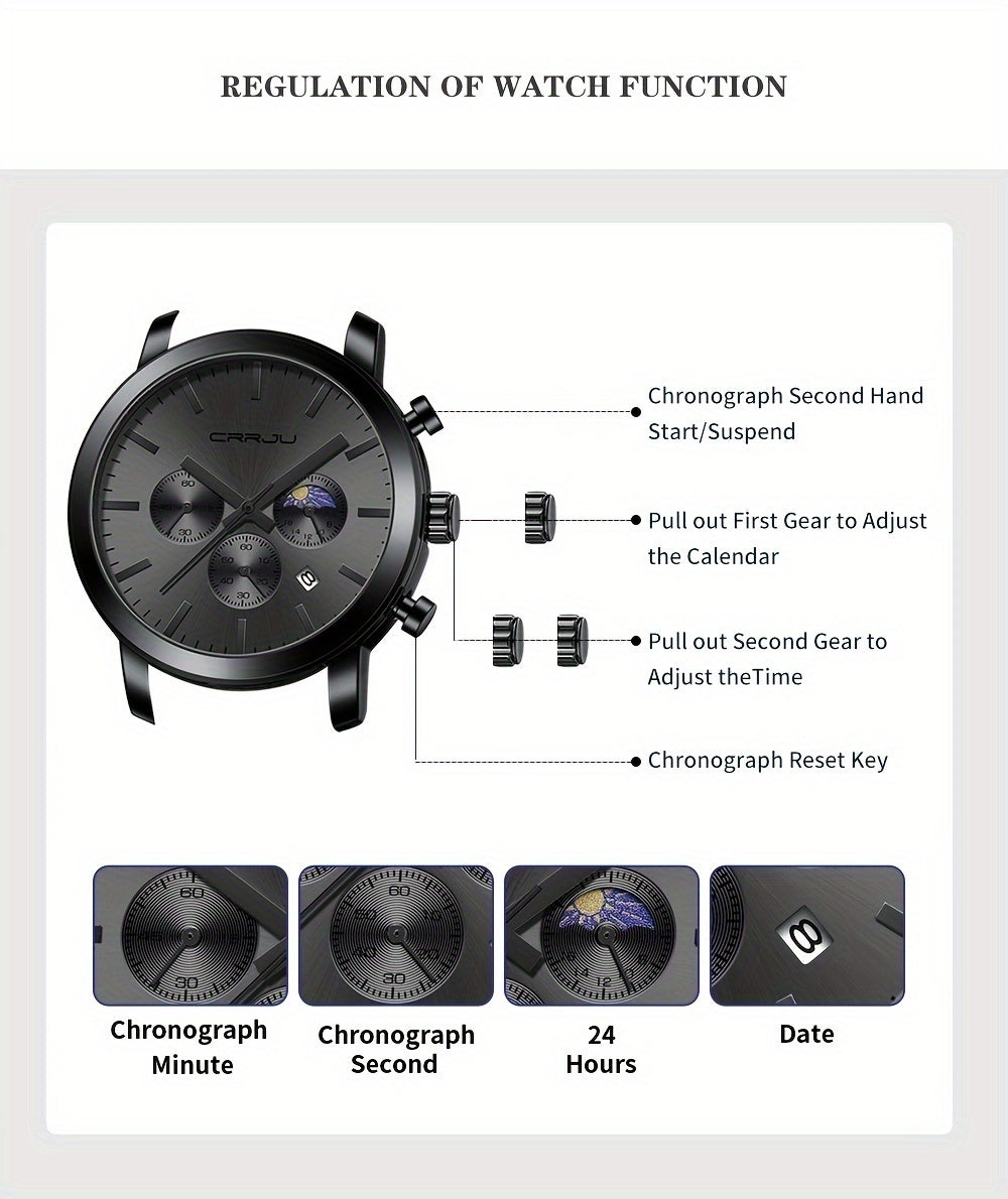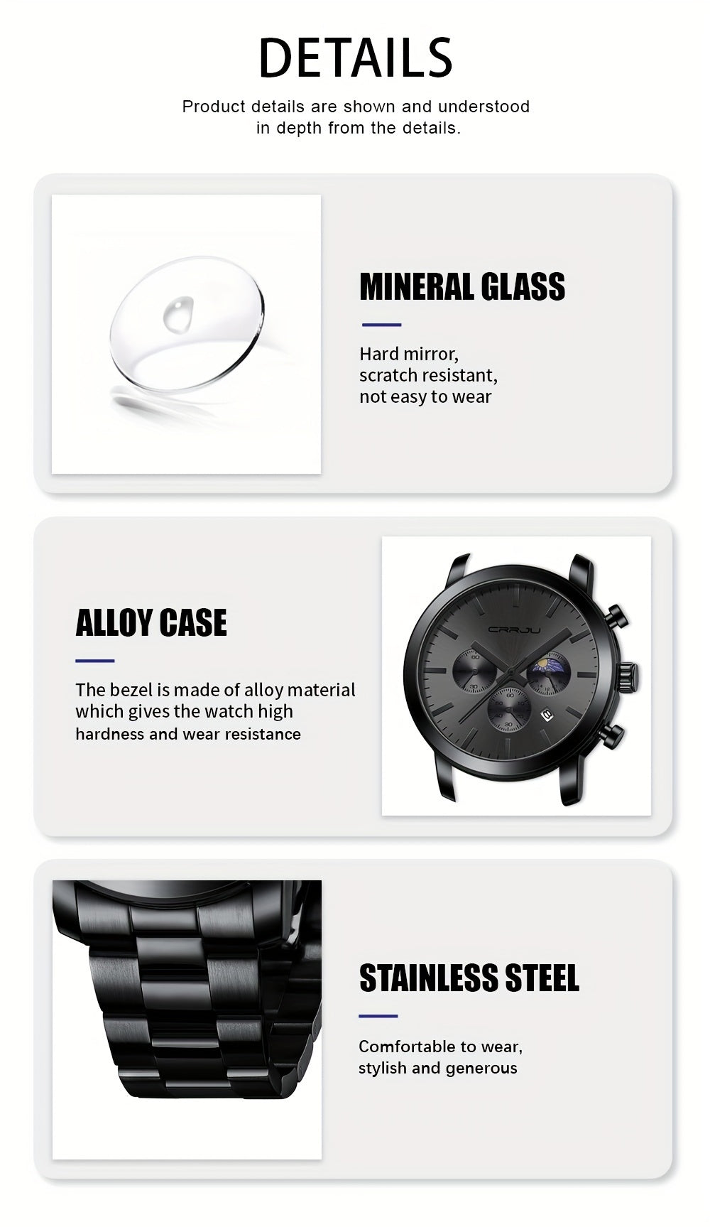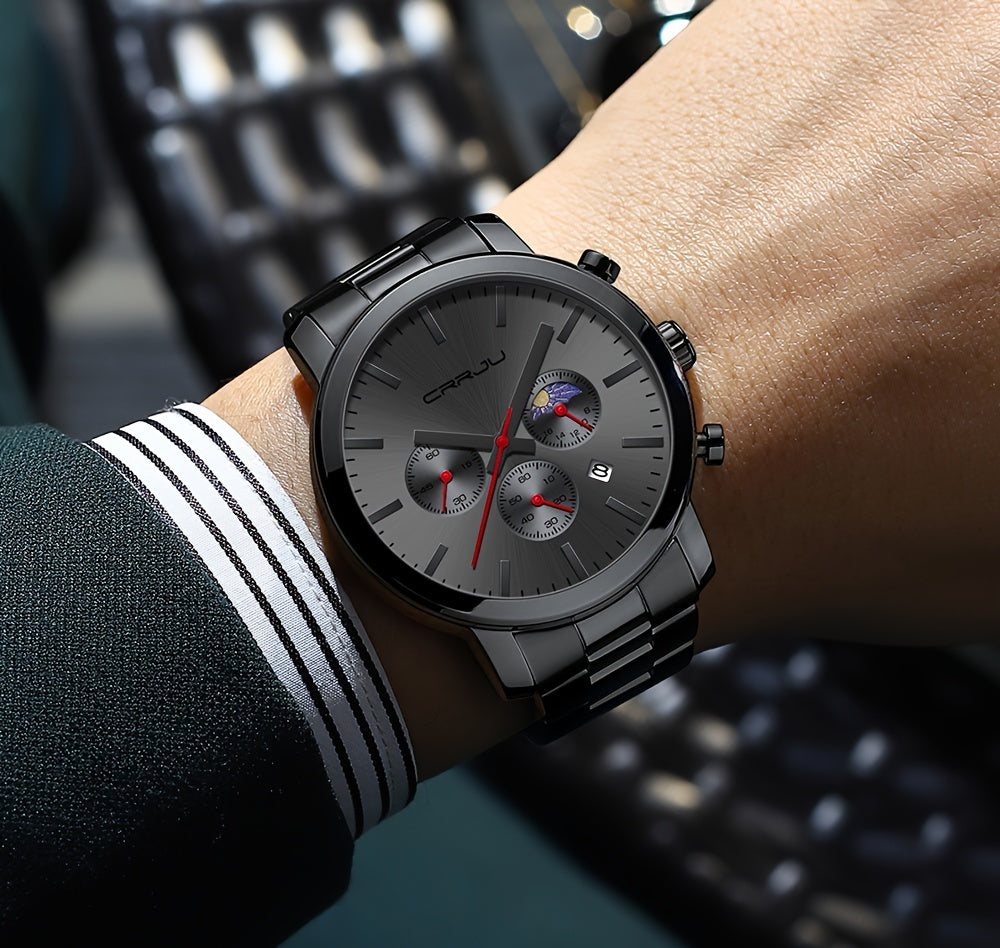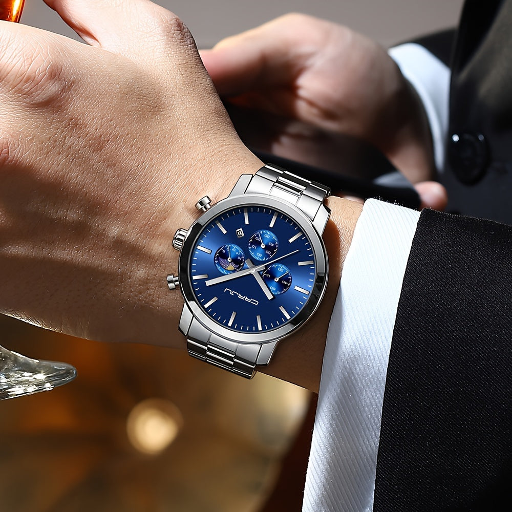 CRRJU տղամարդու շքեղ նորաձև ժամացույց՝ նրբագեղ գործնական ոճով, չժանգոտվող պողպատե ժապավենով, բազմաֆունկցիոնալ քվարցային ժամացույց՝ քրոնոգրաֆով, ամսաթվի ցուցադրմամբ, լուսավոր սլաքներով և ենթացուցիչով, հարմար է կանանց համար