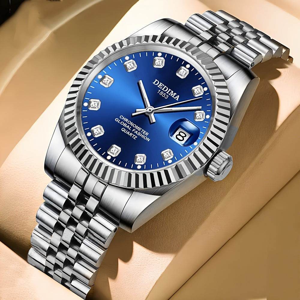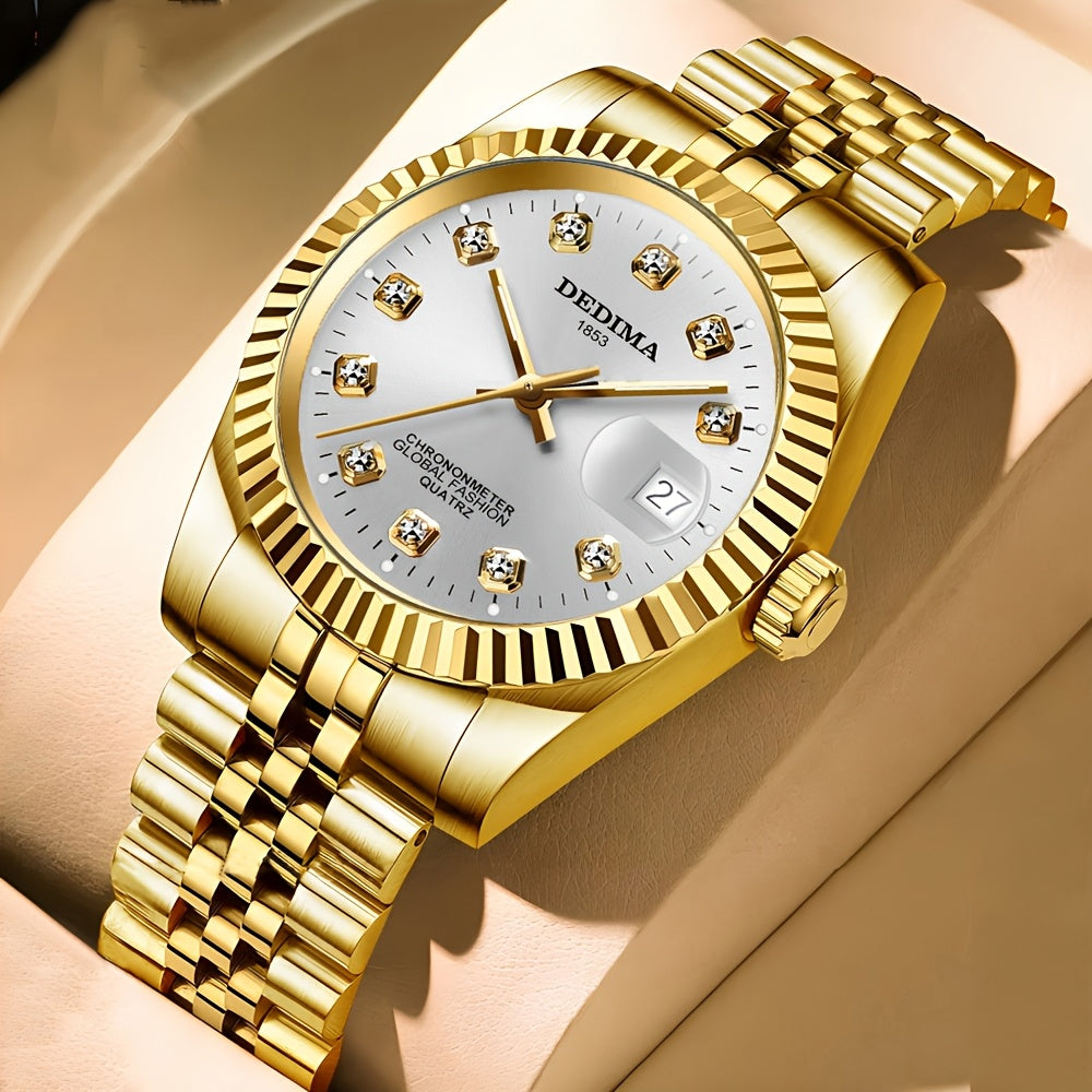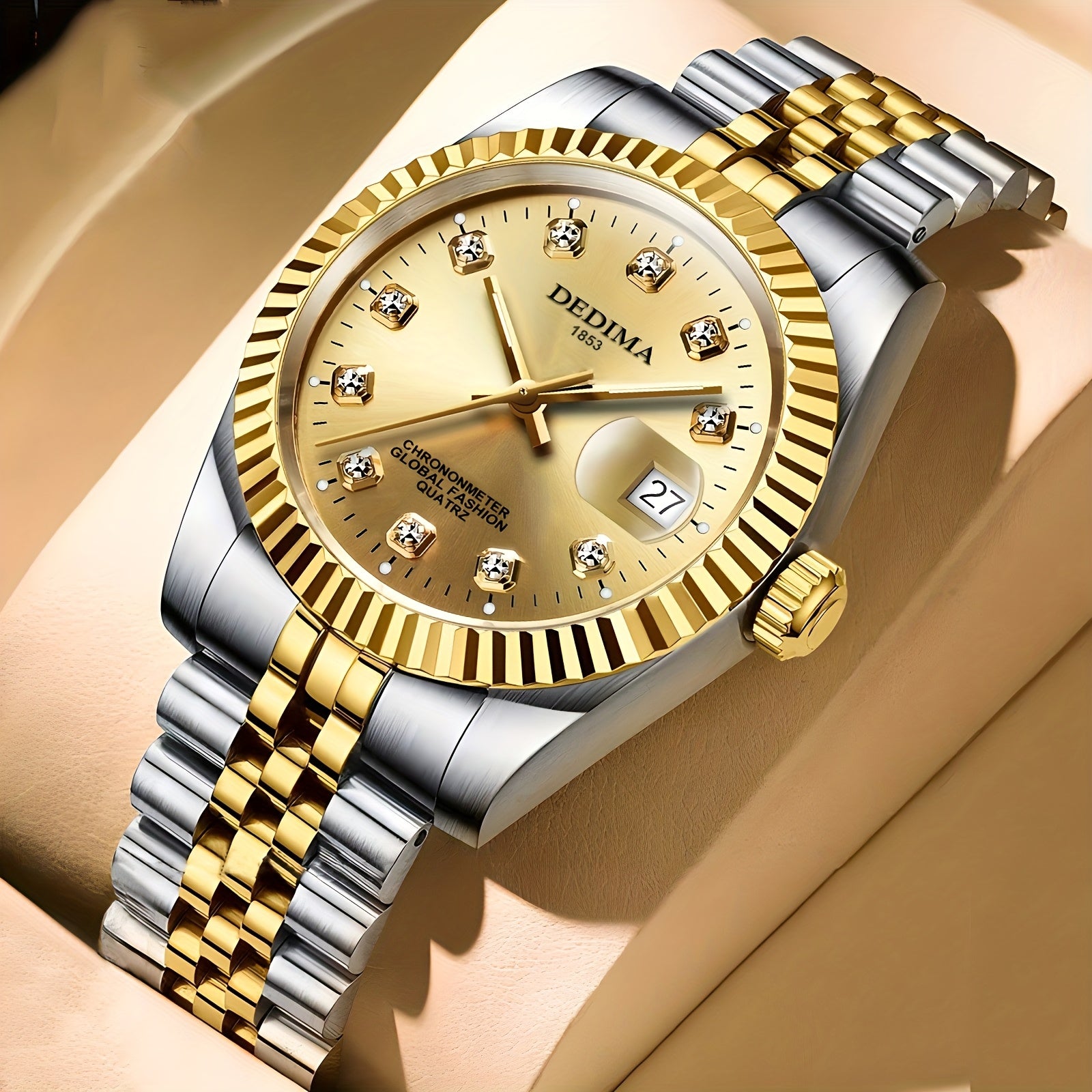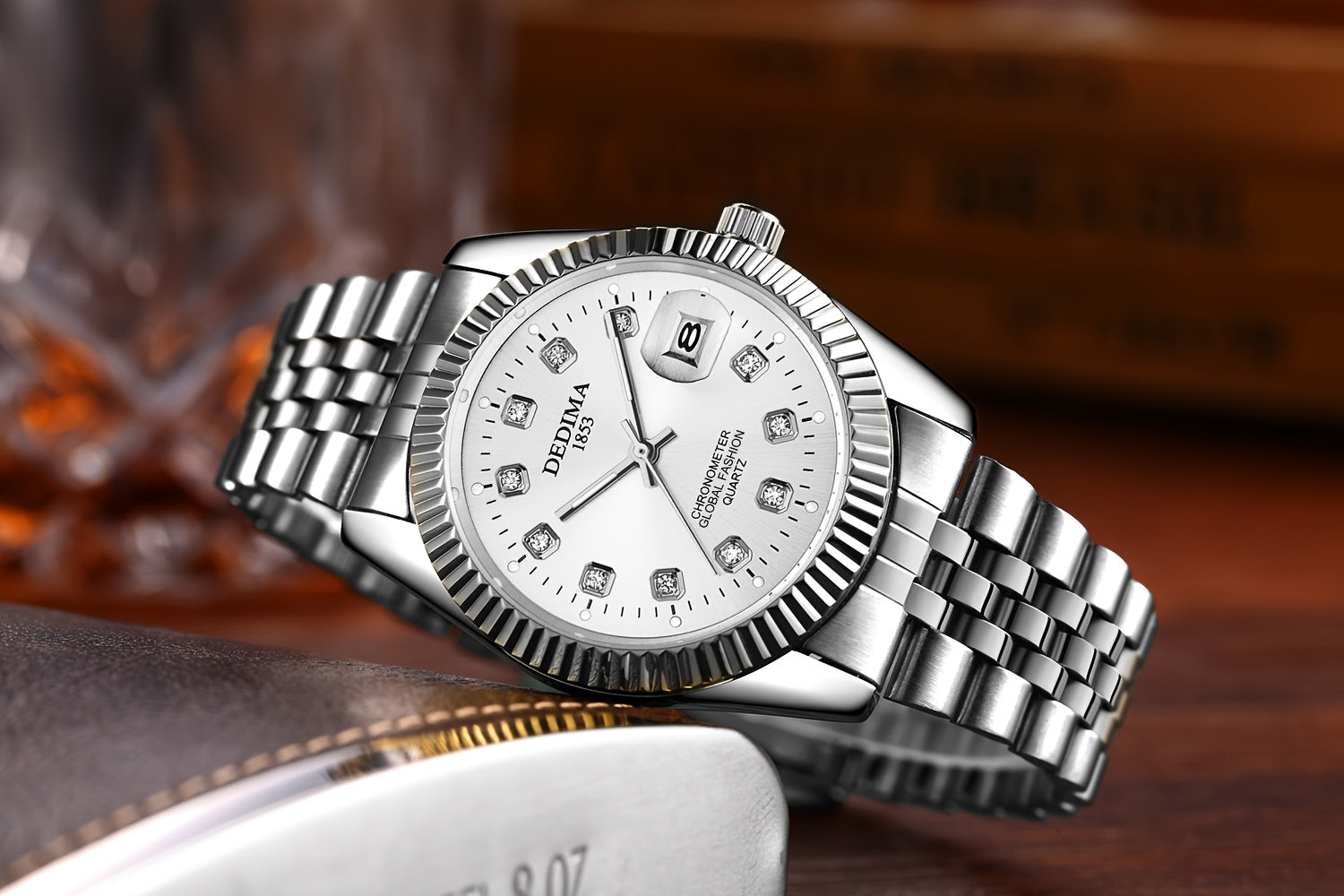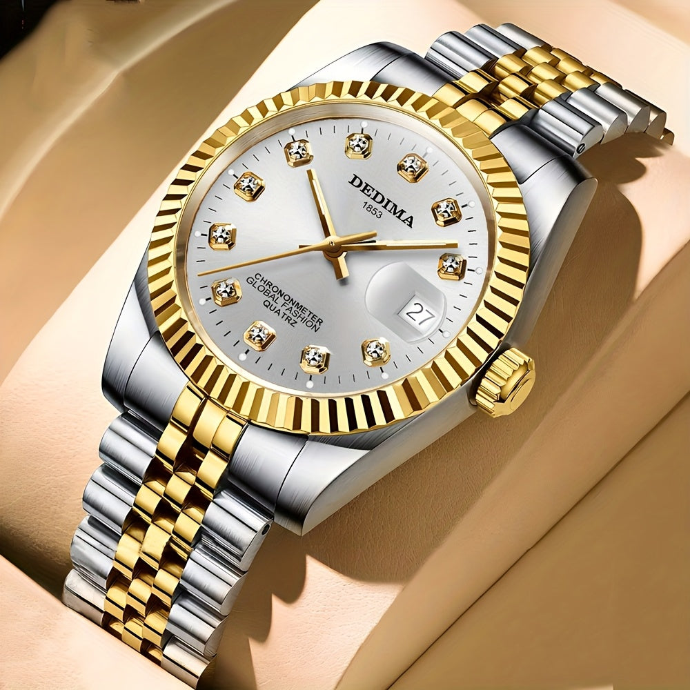 DEDIMA Elegant Stainless Steel Band Calendar Watch, Quartz Movement, Round Dial with Rhinestones, Battery-Powered, Non-Rechargeable Button Battery, Regular Cleaning, for Men, Women, Students, Christmas, Valentine'S Day, Thank