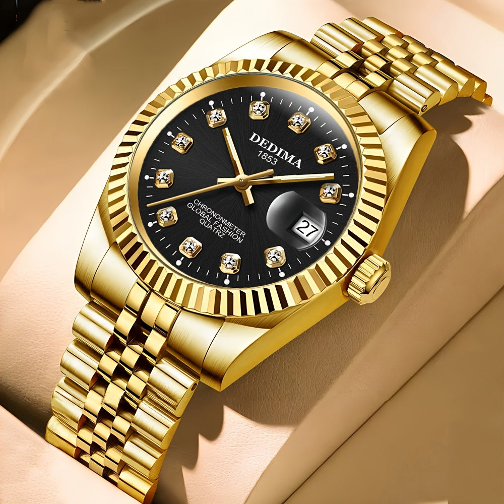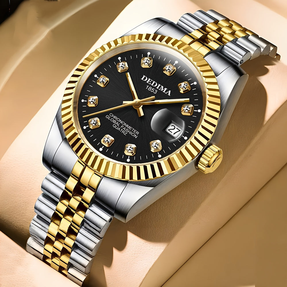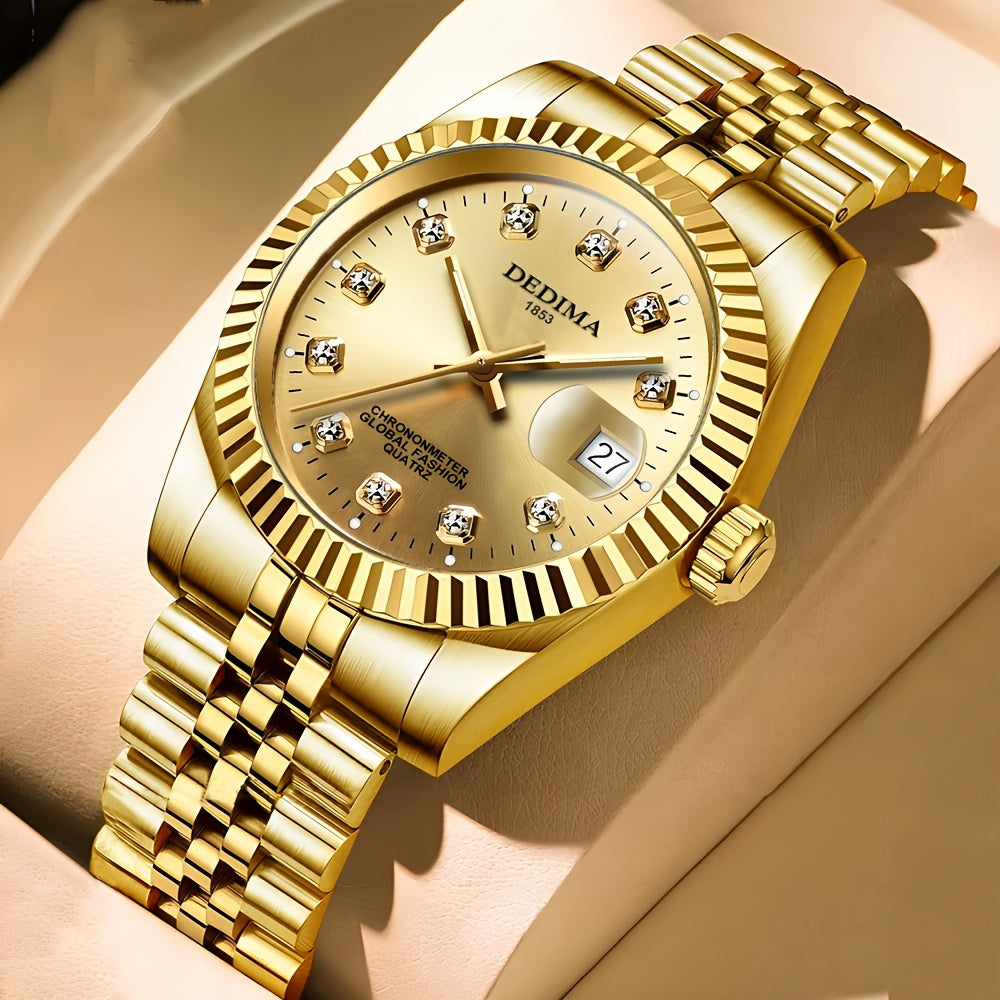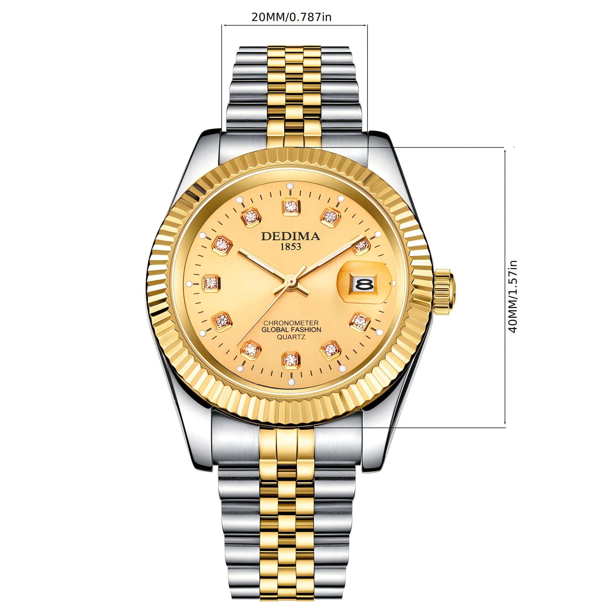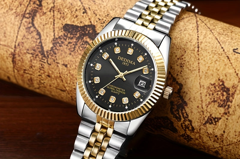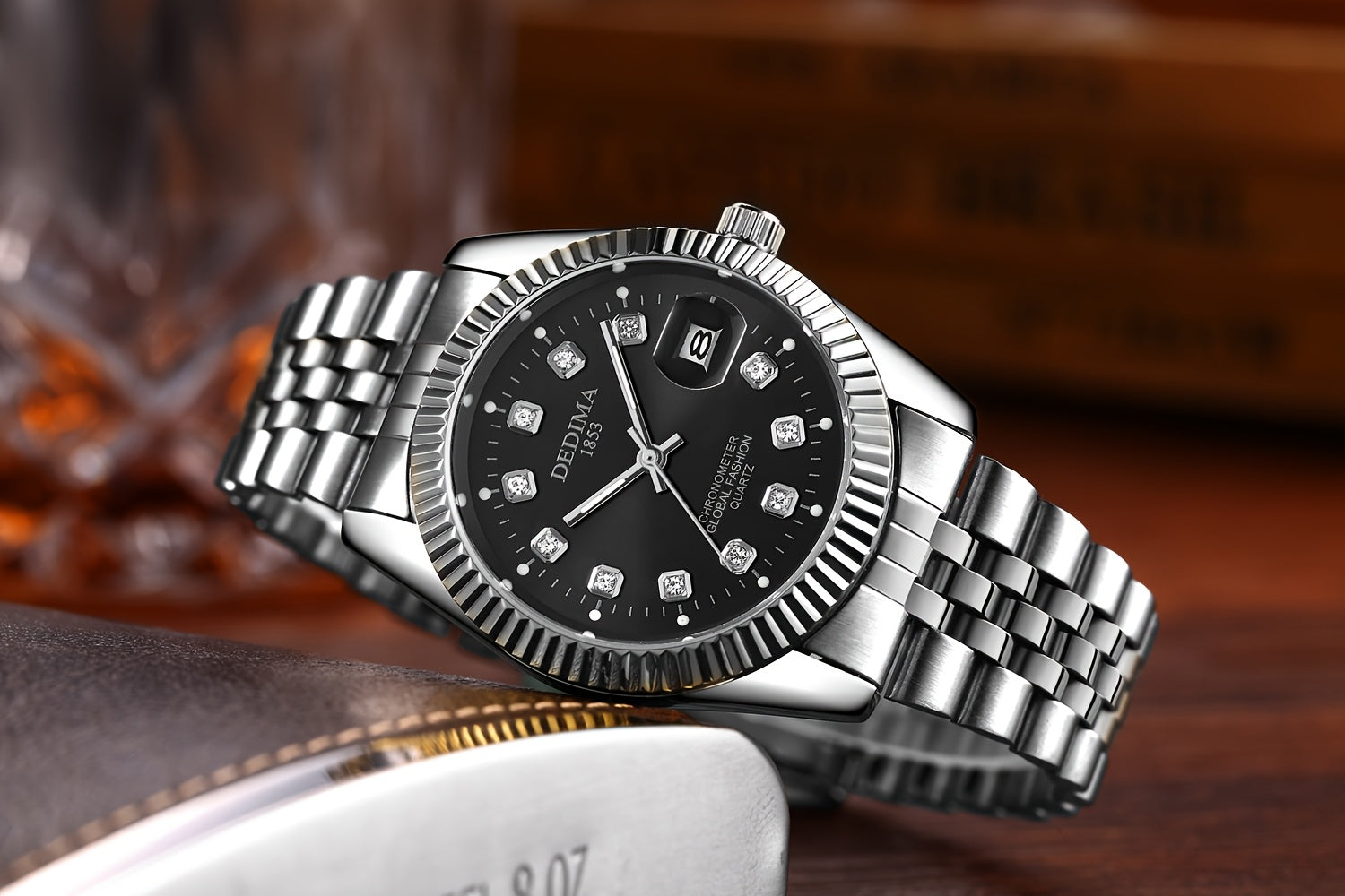 DEDIMA Elegant Stainless Steel Band Calendar Watch, Quartz Movement, Round Dial with Rhinestones, Battery-Powered, Non-Rechargeable Button Battery, Regular Cleaning, for Men, Women, Students, Christmas, Valentine'S Day, Thank