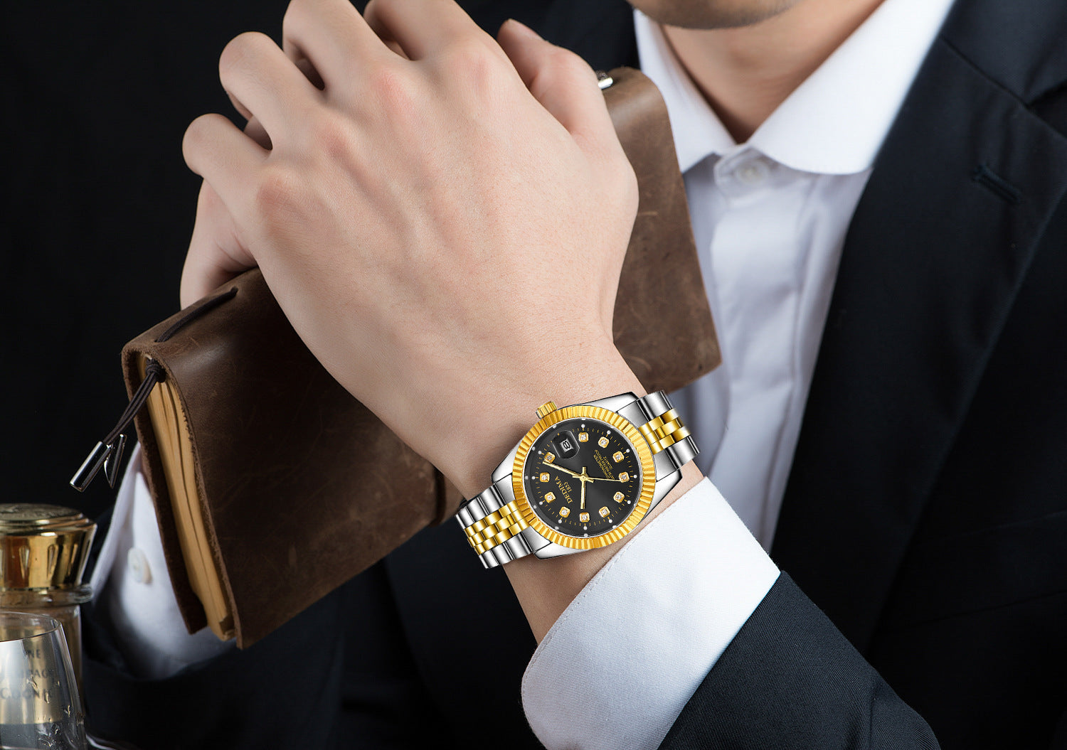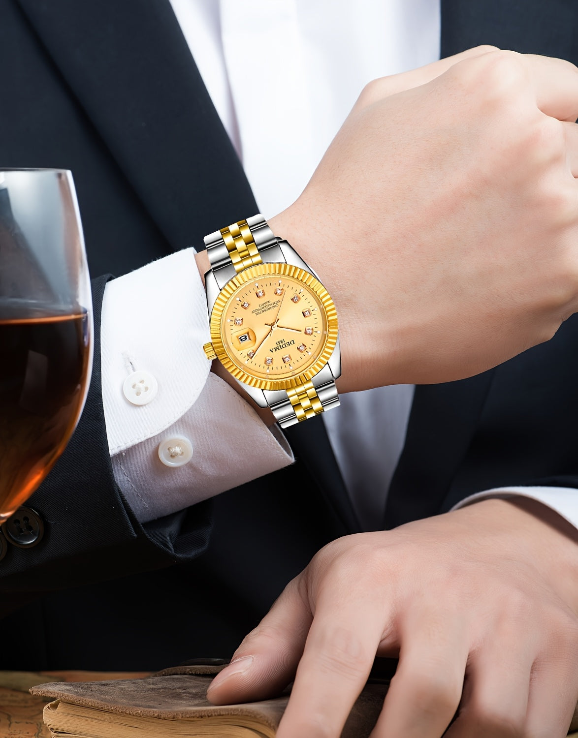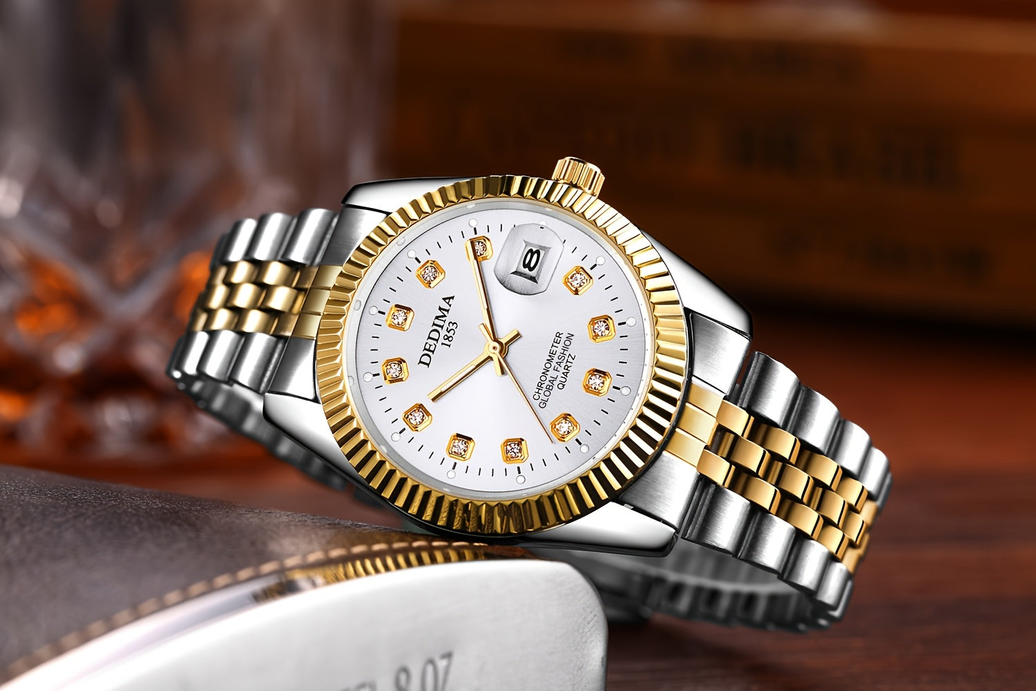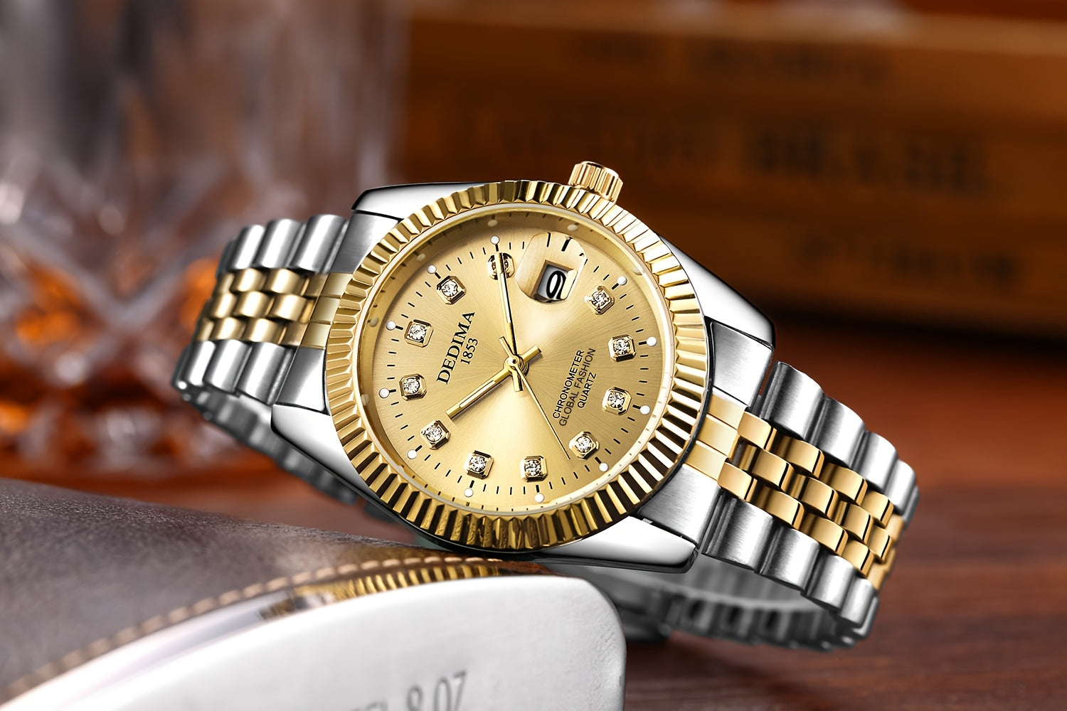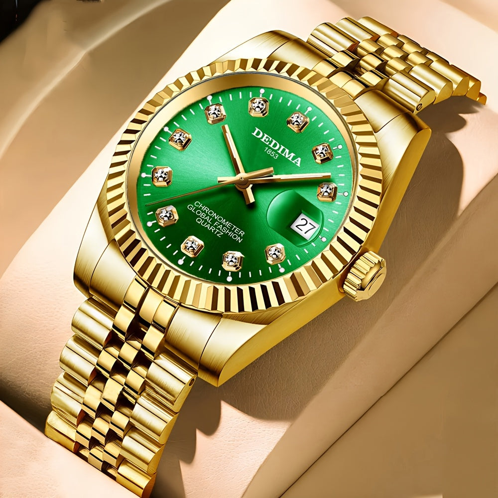 DEDIMA Elegant Stainless Steel Band Calendar Watch, Quartz Movement, Round Dial with Rhinestones, Battery-Powered, Non-Rechargeable Button Battery, Regular Cleaning, for Men, Women, Students, Christmas, Valentine'S Day, Thank