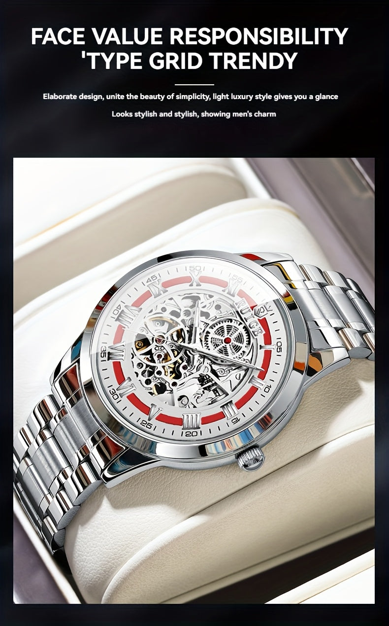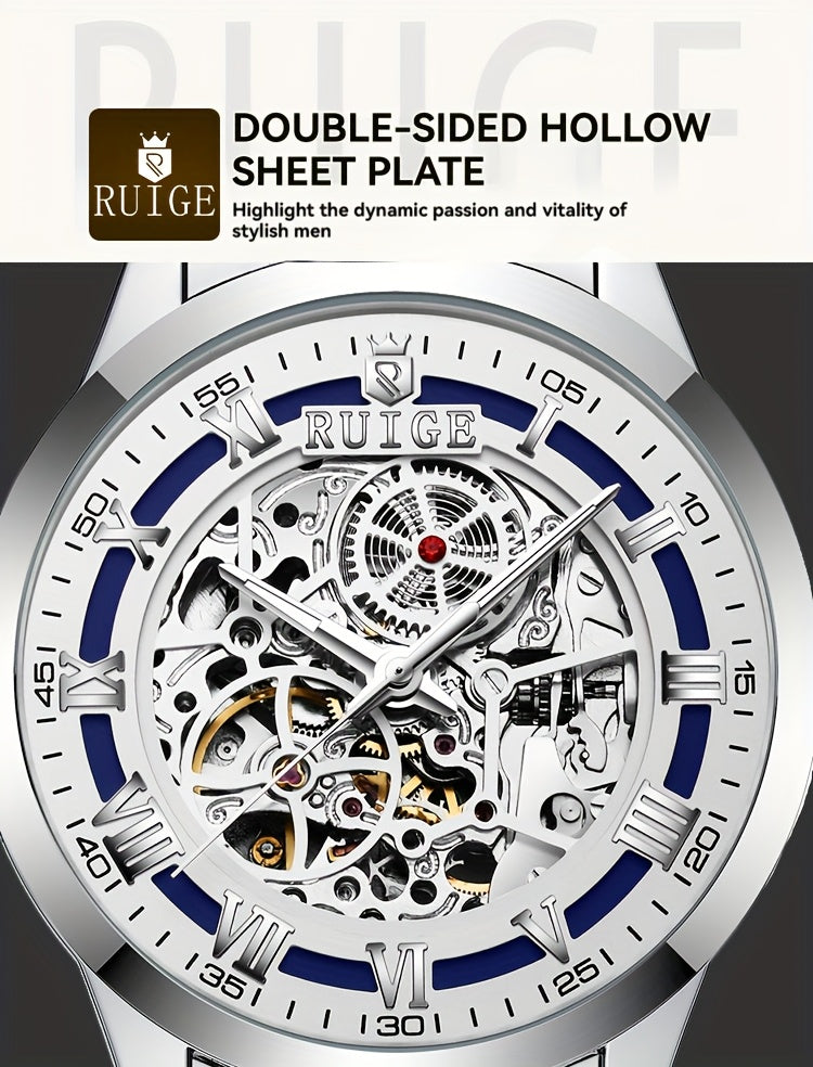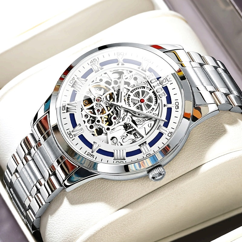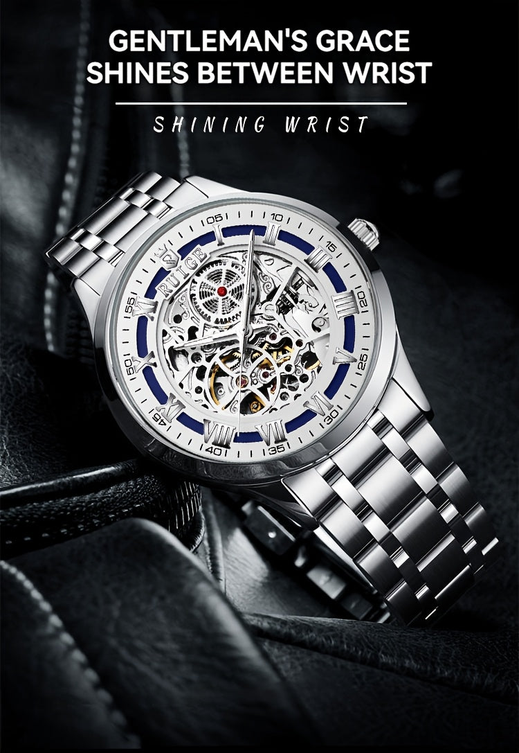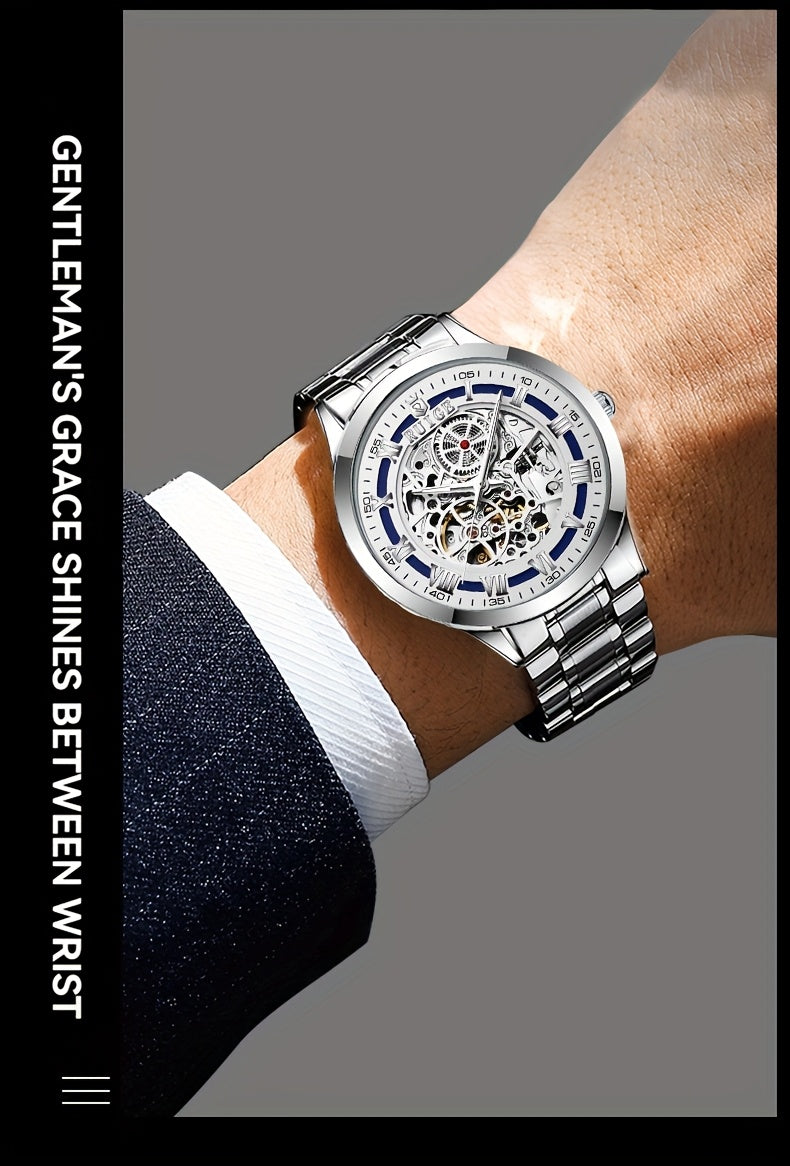 Dianpai տղամարդու շքեղ ավտոմատ մեխանիկական ժամացույց՝ կմախքի դիզայնով, չժանգոտվող պողպատե ժապավենով, կապույտ և սպիտակ ցուցատախտակով, մեխանիկական մեխանիզմով, իդեալական է Սուրբ Ծննդյան, Շնորհակալության օրվա և գարնանային տոների համար, առանց մարտկոցի