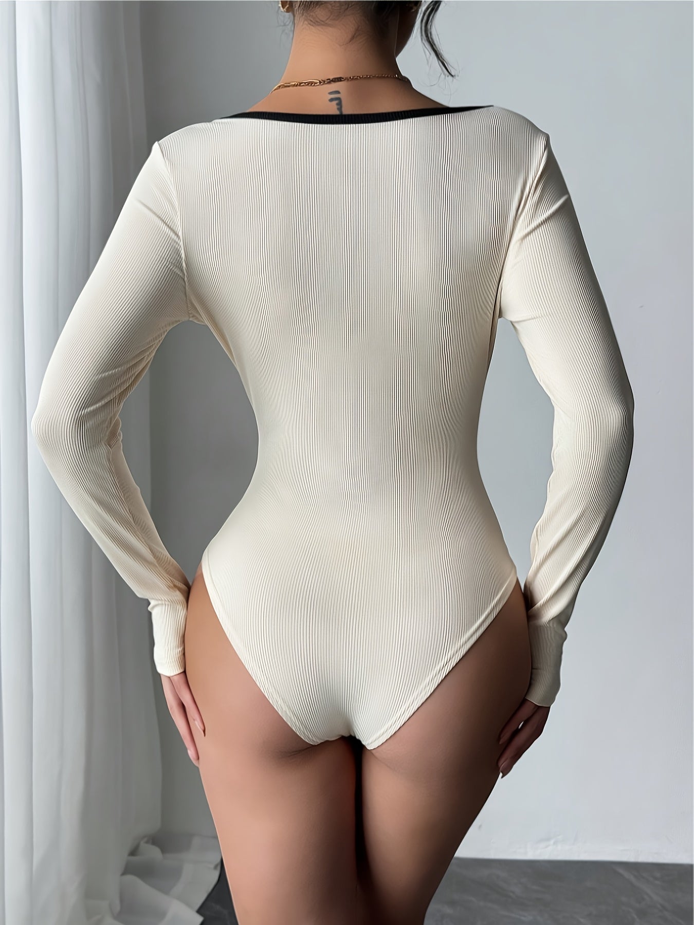 DP053391 Գունավոր բլոկներով քառակուսի վզնոցով բոդի, երկար թևքերով, մարմնին միացված կոմբինեզոն – ոճային և սեքսուալ դիզայն՝ բազմակողմանի չափսերով՝ նորաձև տեսքի համար