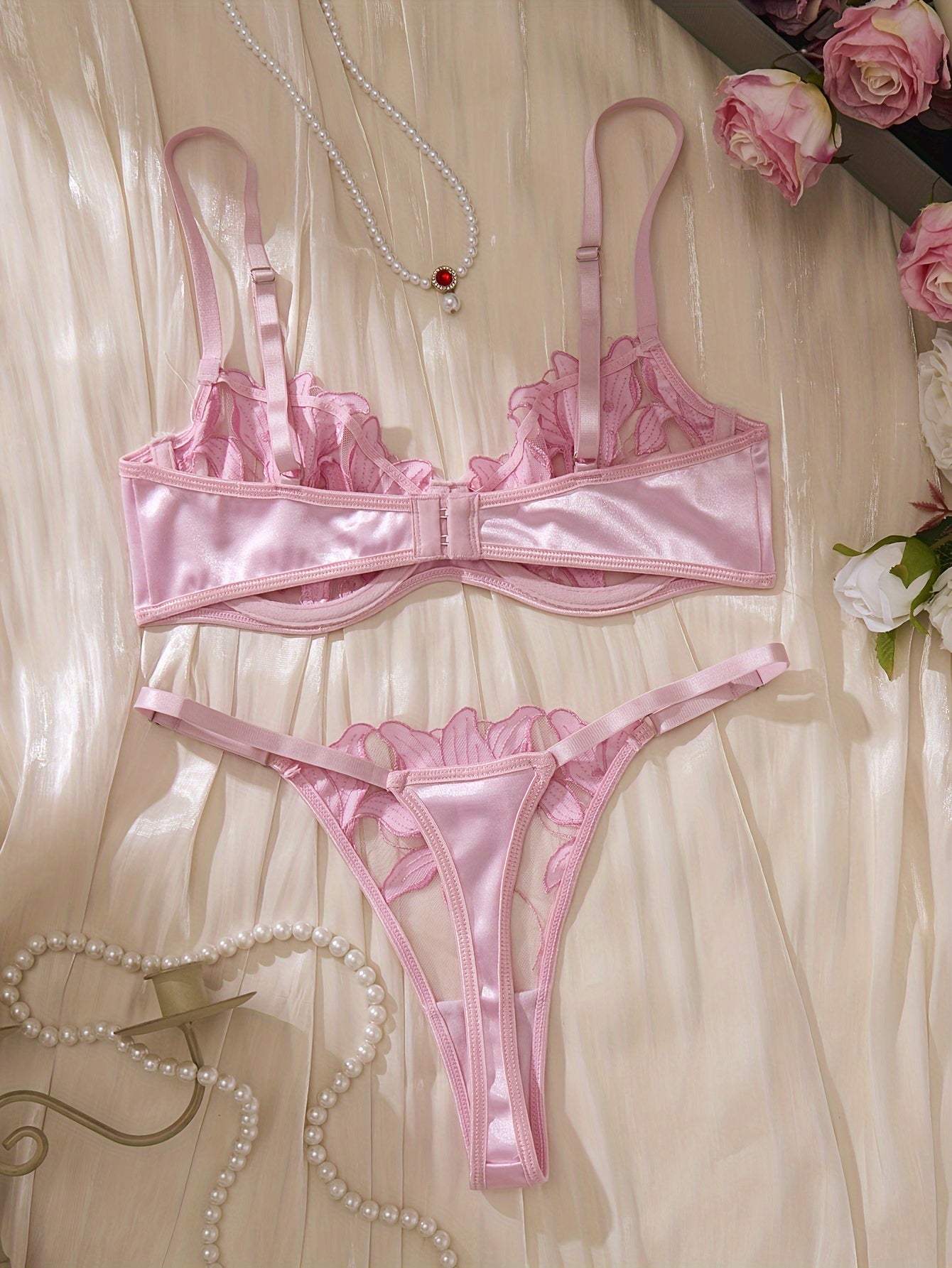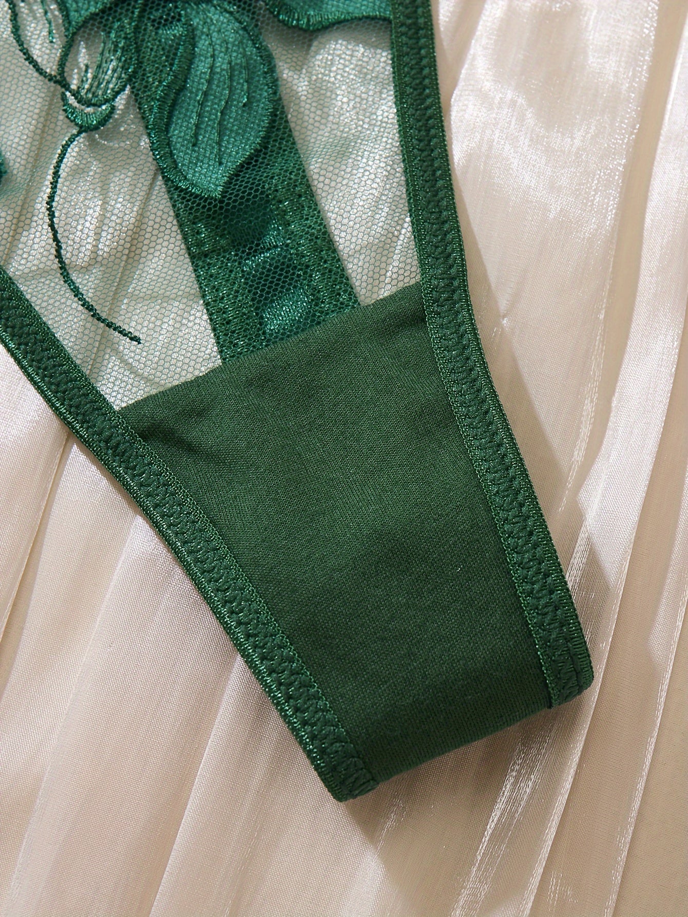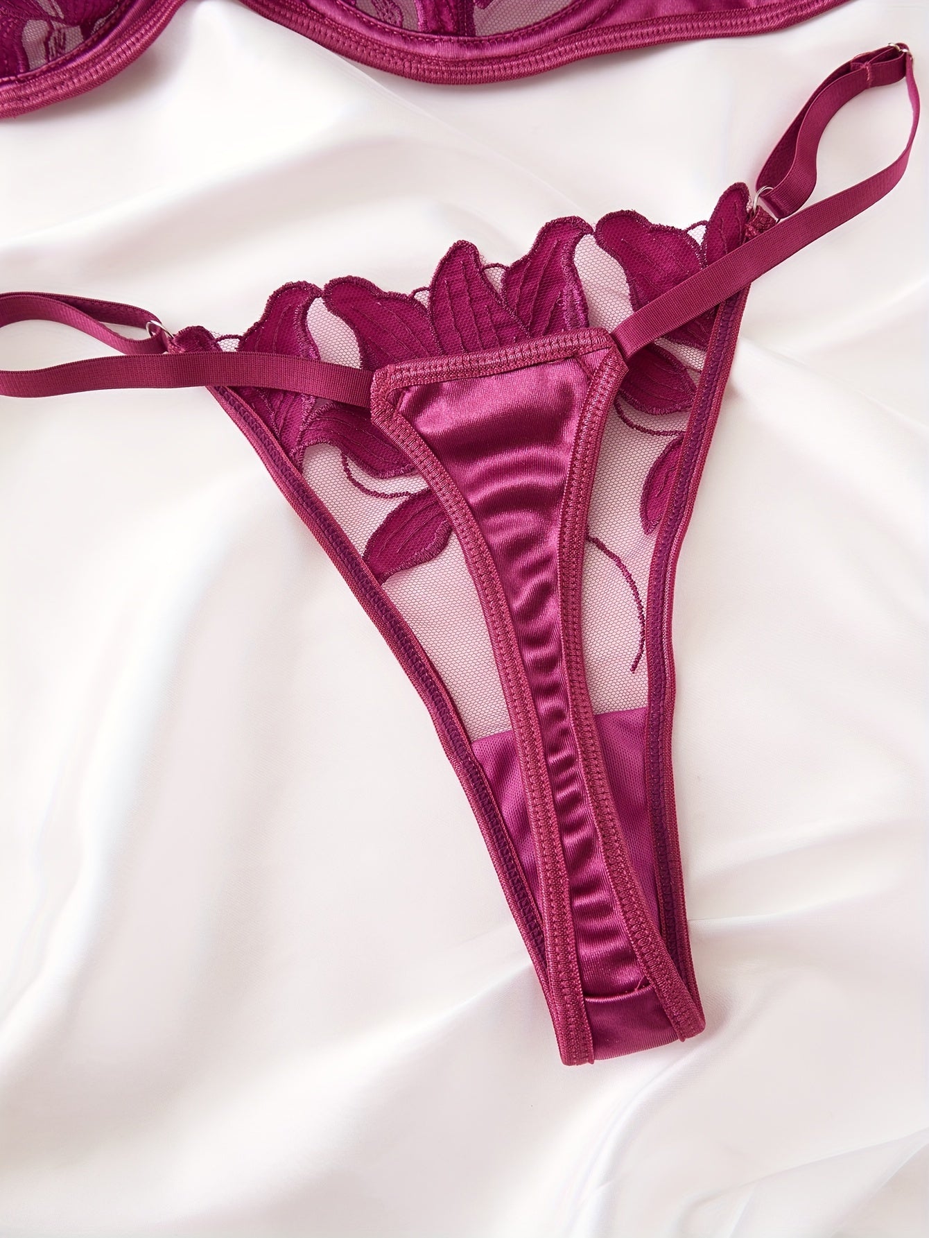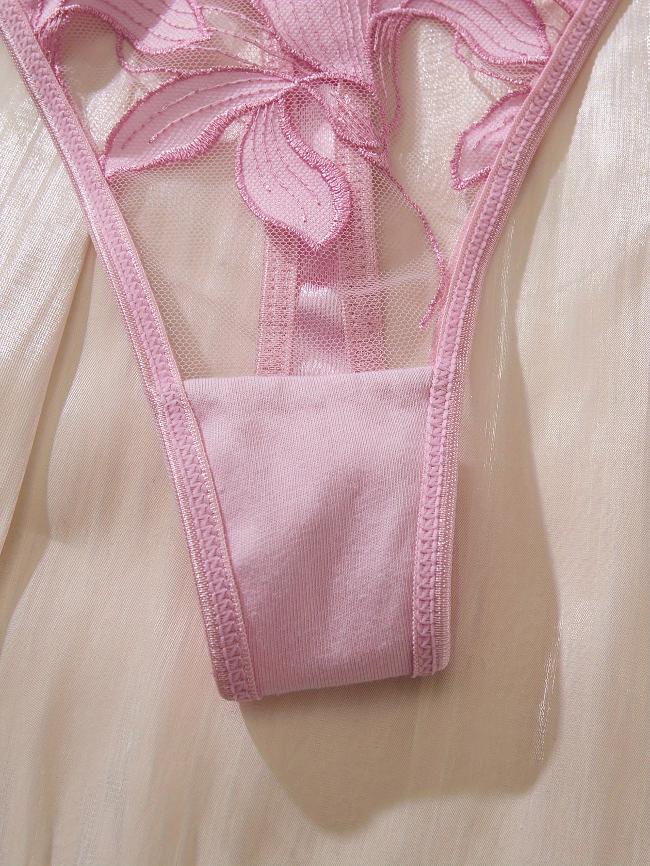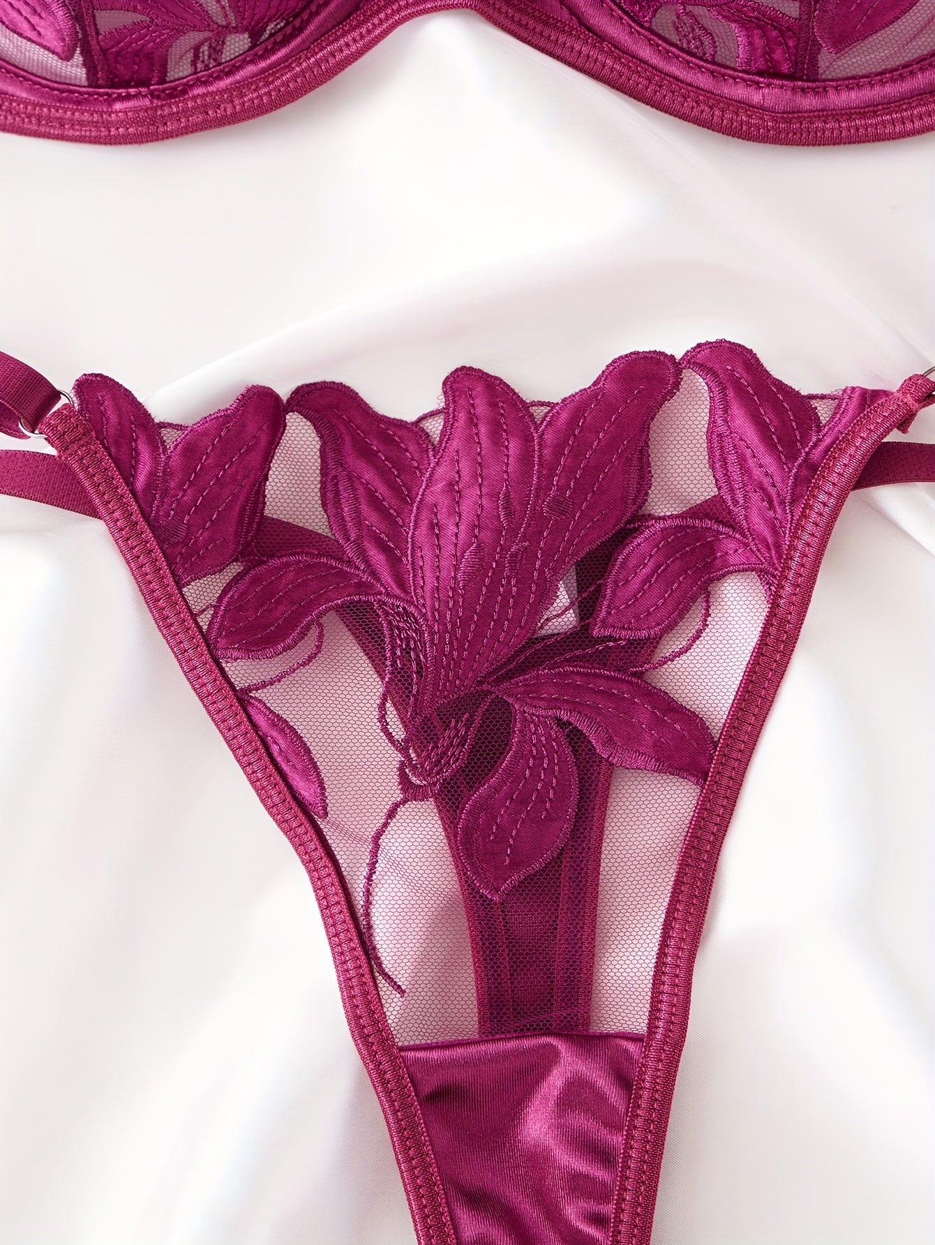 Նրբագեղ ծաղկային ասեղնագործված ներքնազգեստի հավաքածու կանանց համար. սեքսուալ թափանցիկ կրծկալ և խրճիթ, առանց միջուկի, միջին աջակցության տրիկոտաժե գործվածքից ներքնազգեստի հավաքածու պոլիեսթերով և էլաստանով
