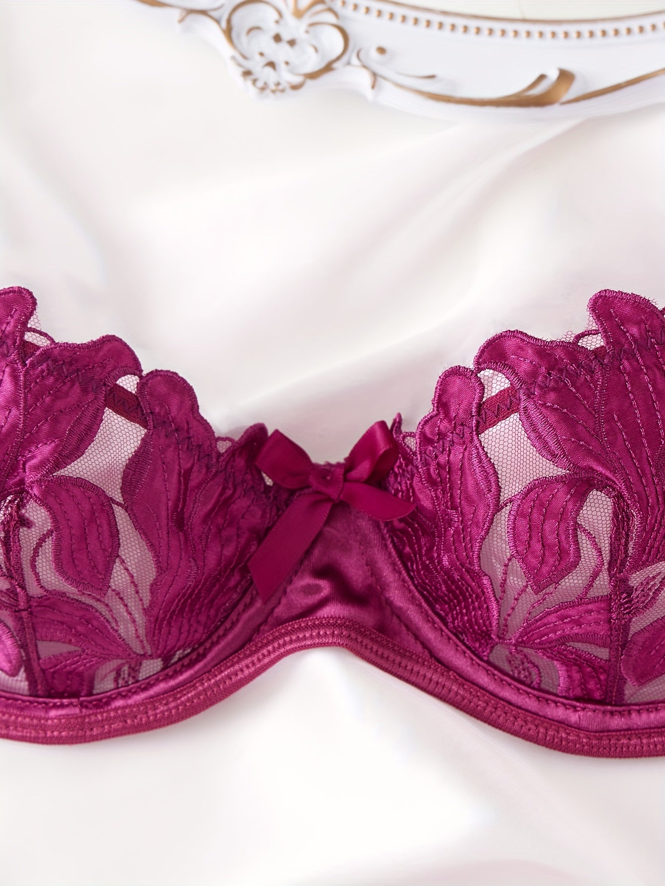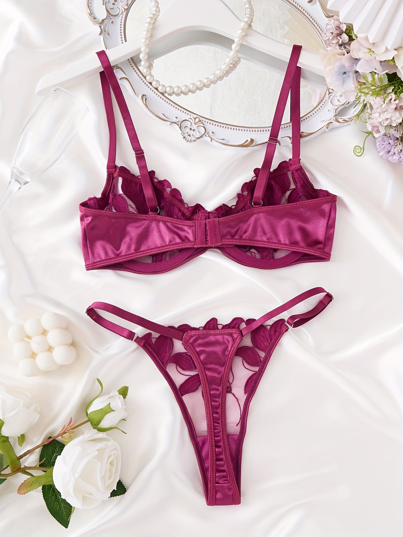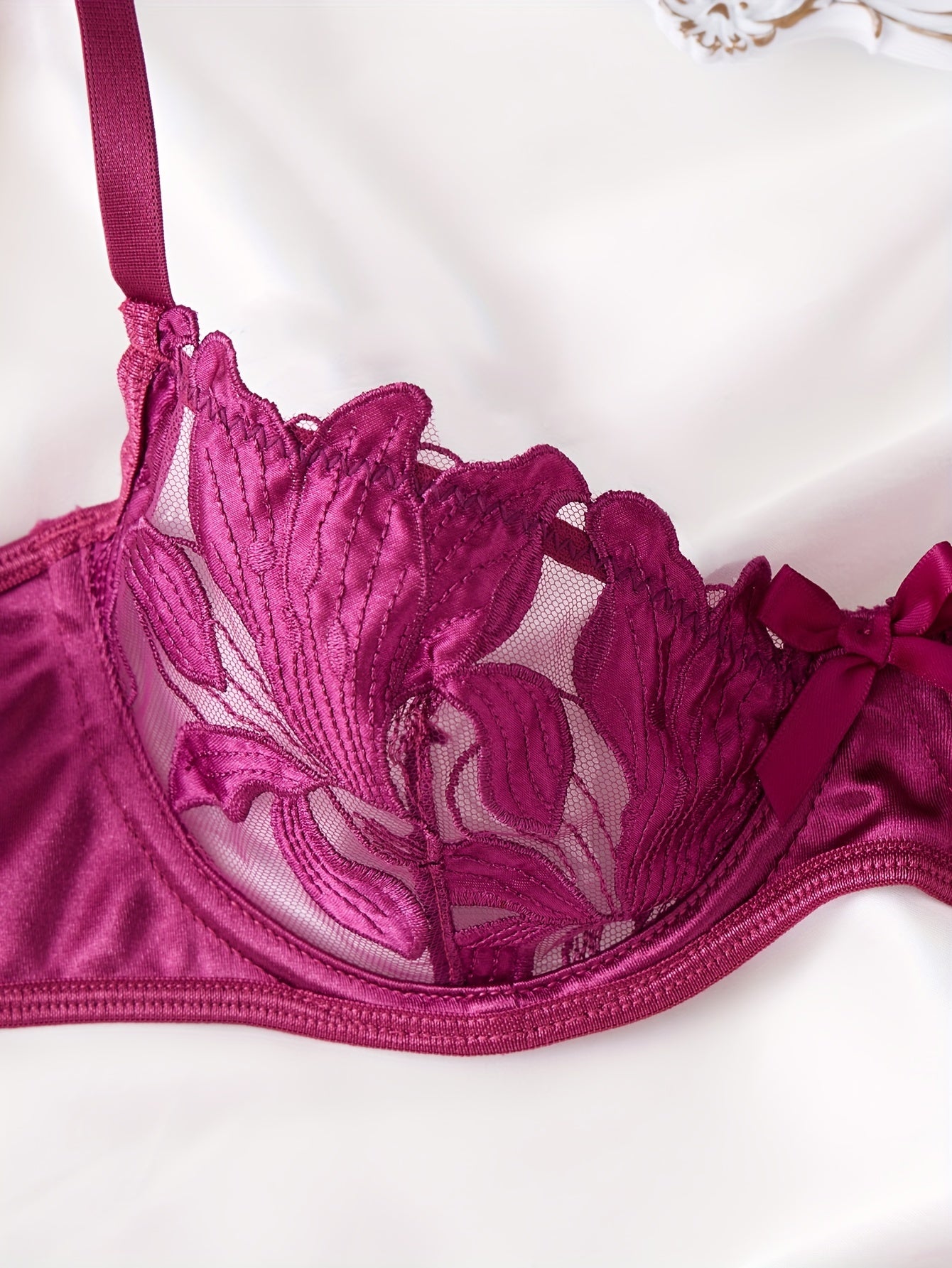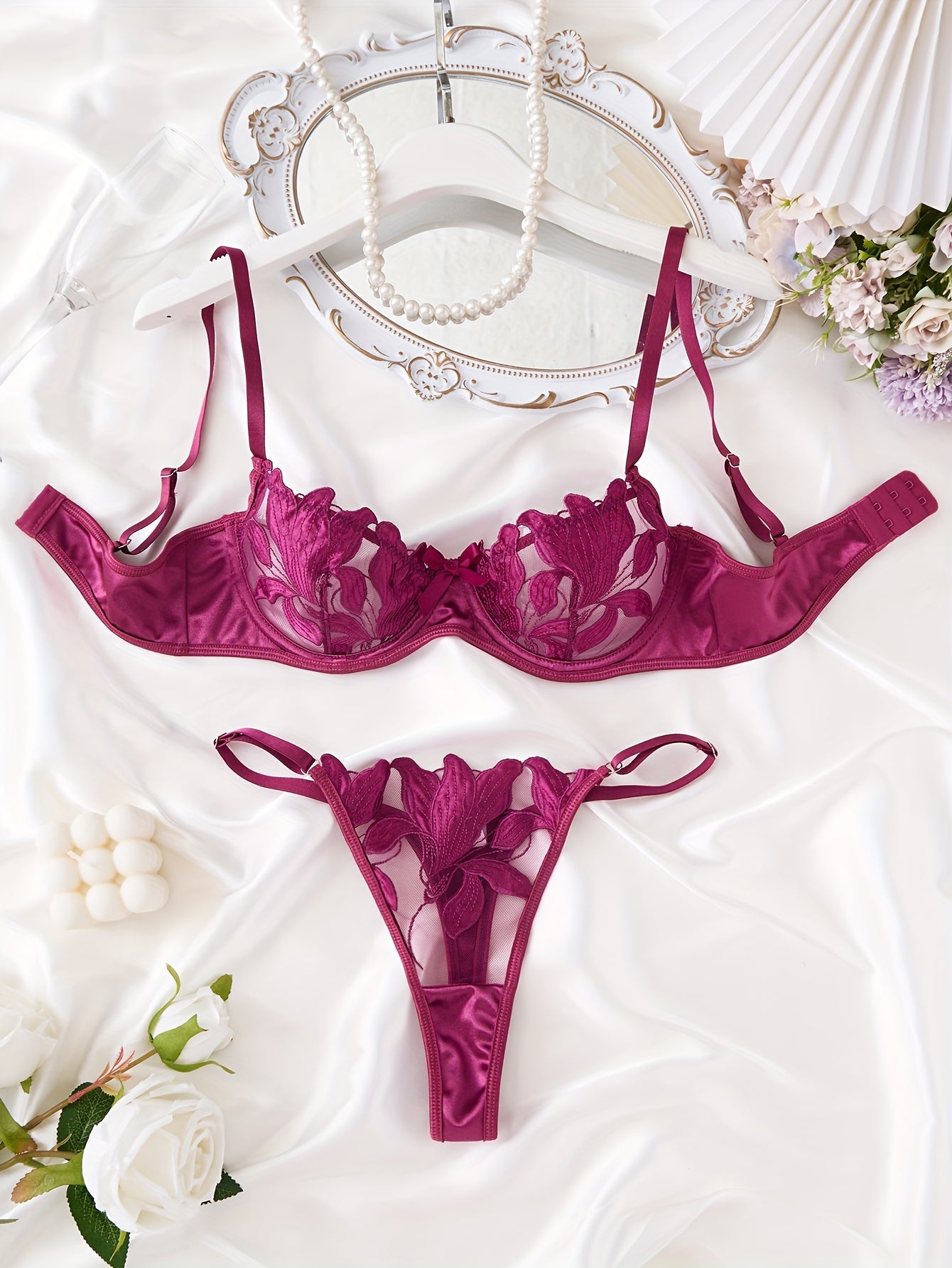Նրբագեղ ծաղկային ասեղնագործված ներքնազգեստի հավաքածու կանանց համար. սեքսուալ թափանցիկ կրծկալ և խրճիթ, առանց միջուկի, միջին աջակցության տրիկոտաժե գործվածքից ներքնազգեստի հավաքածու պոլիեսթերով և էլաստանով