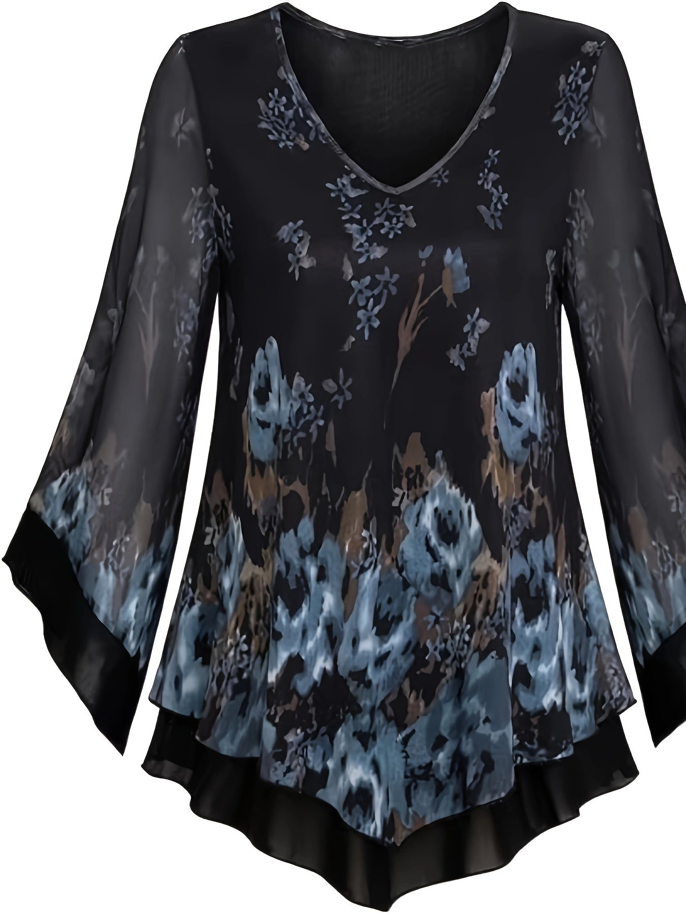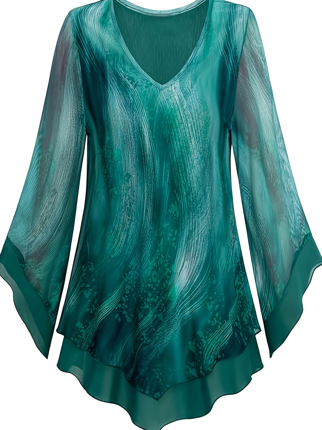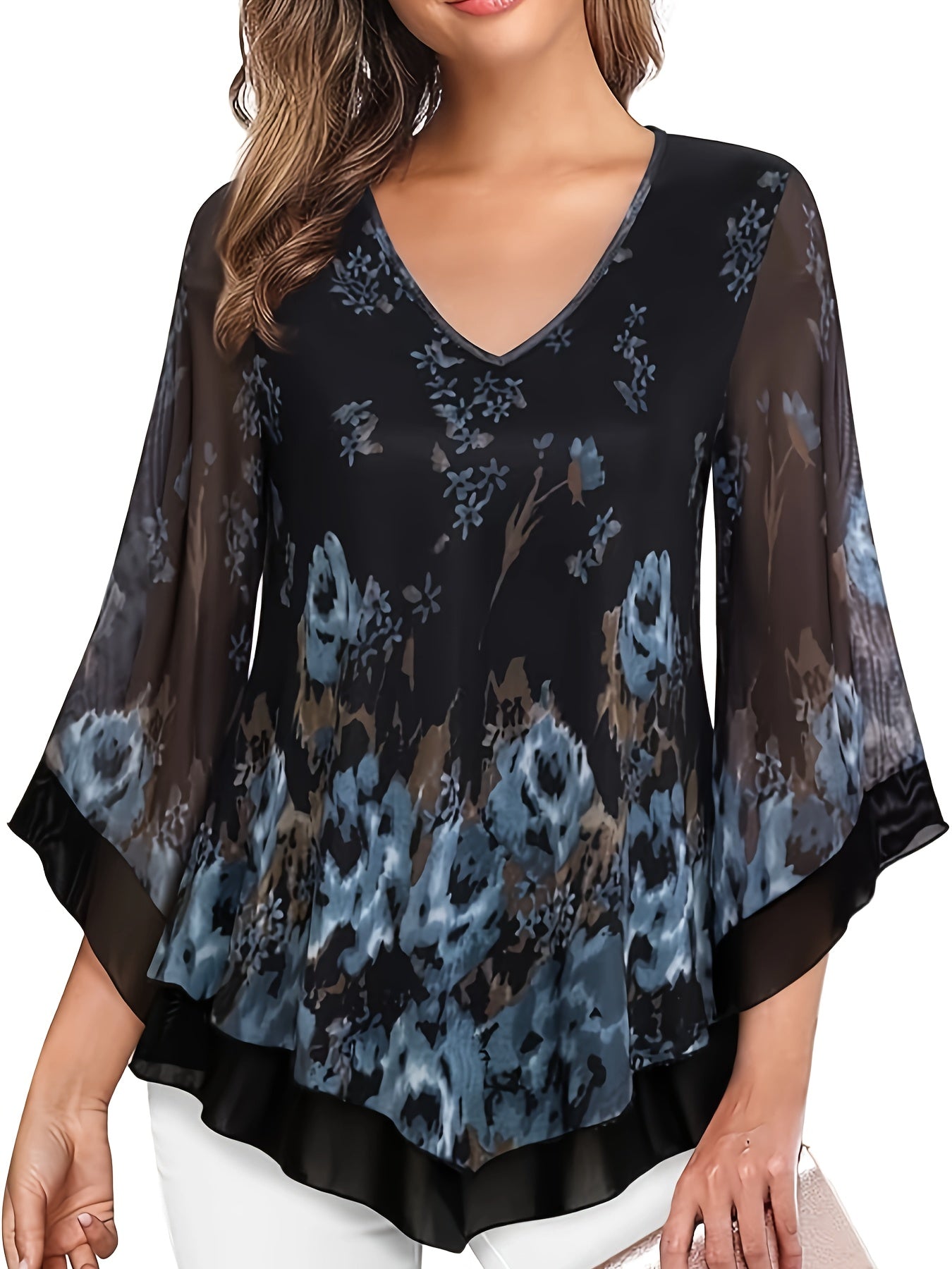 Նրբագեղ ծաղկային տպագրության շերտավոր ցանցային վերնաշապիկ V- պարանոցով և զանգակաթևերով - շնչող պոլիեսթեր խառնուրդ, լվացվող մեքենայով - կատարյալ գարուն/ամառ/աշուն