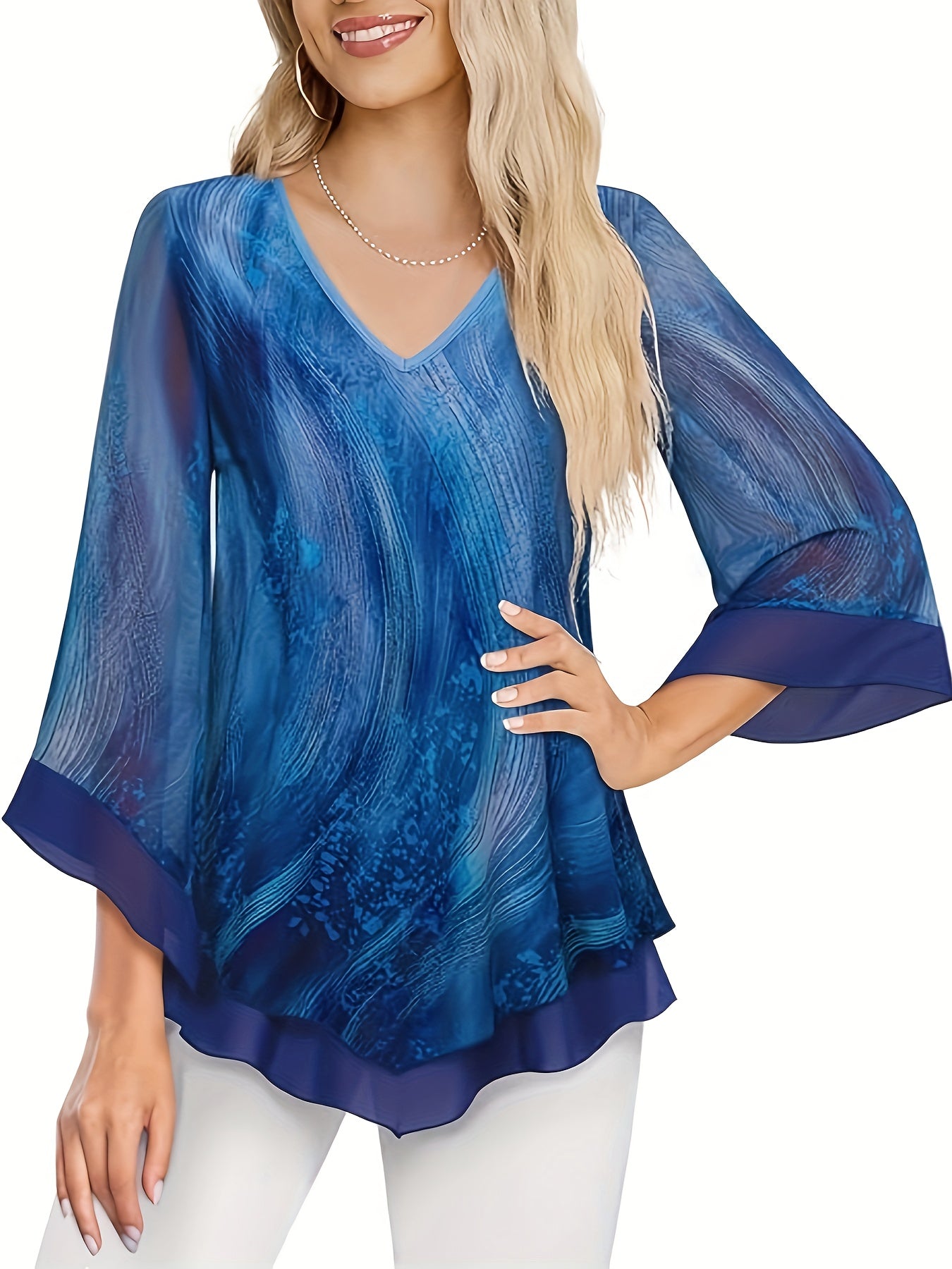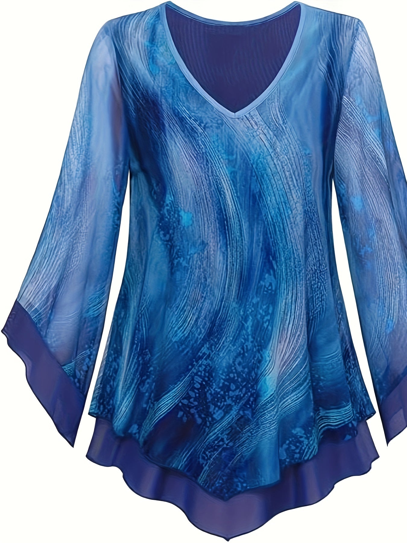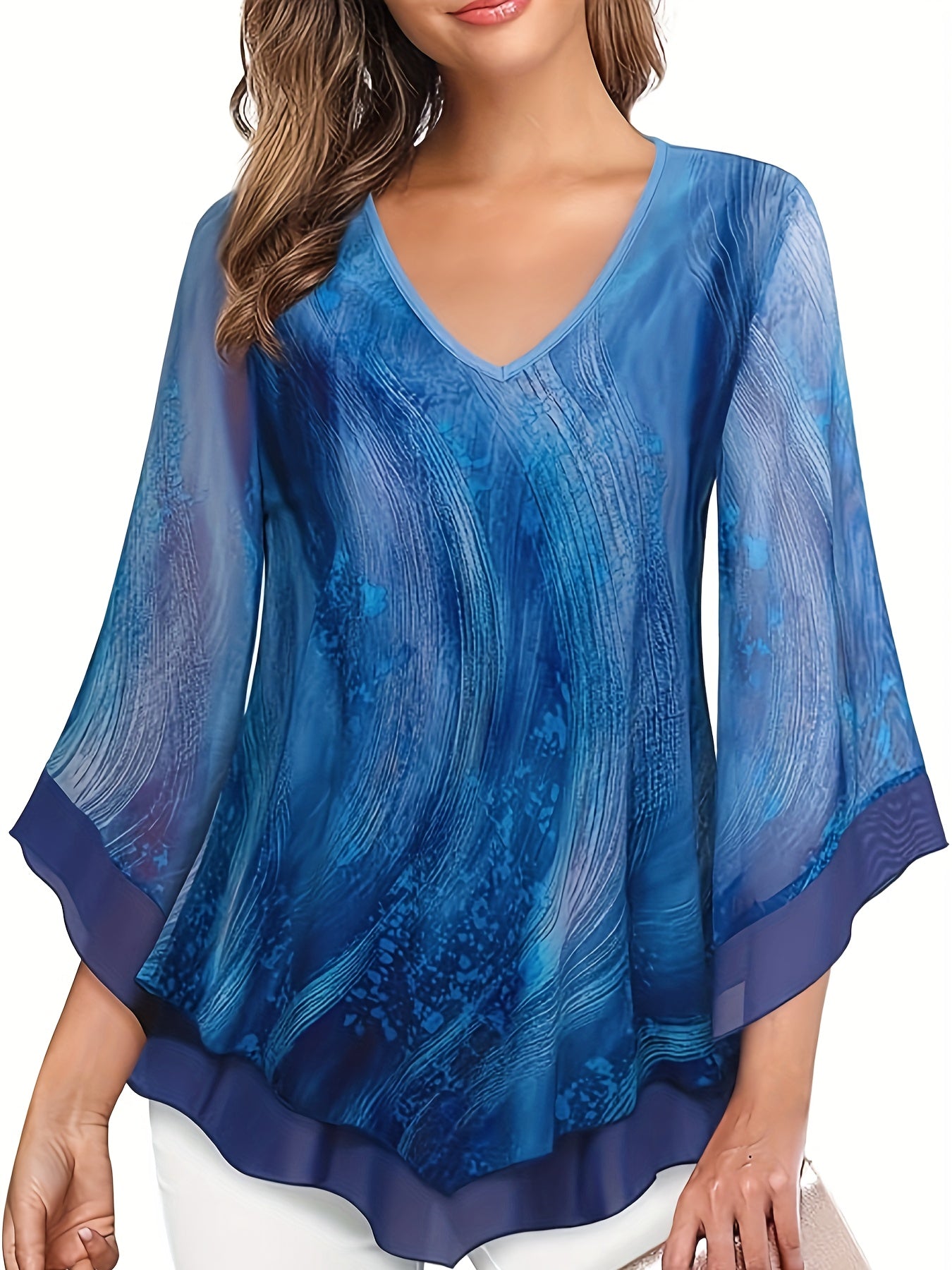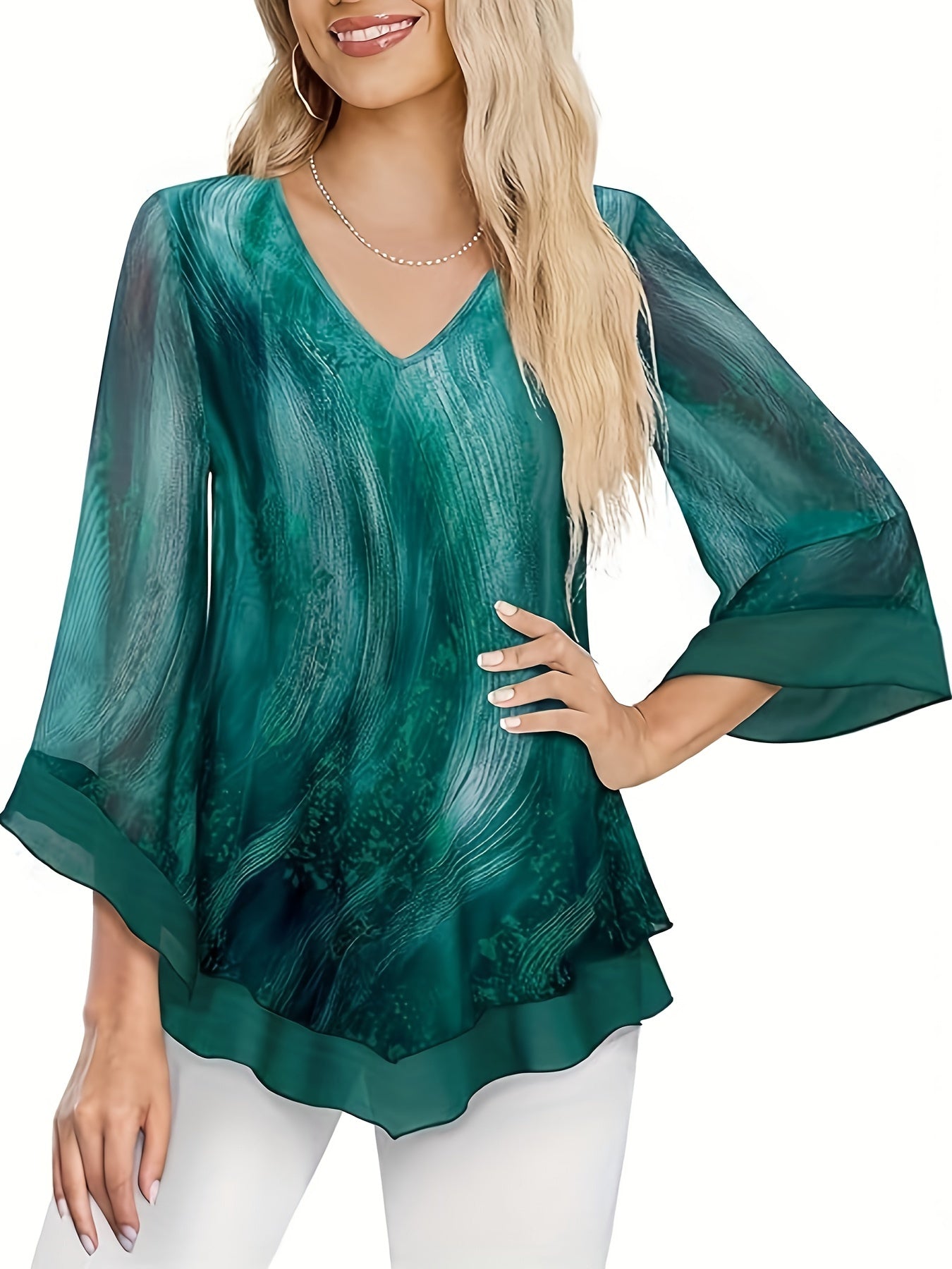Նրբագեղ ծաղկային տպագրության շերտավոր ցանցային վերնաշապիկ V- պարանոցով և զանգակաթևերով - շնչող պոլիեսթեր խառնուրդ, լվացվող մեքենայով - կատարյալ գարուն/ամառ/աշուն