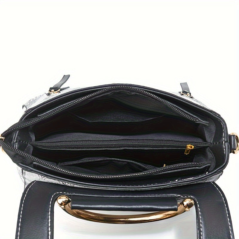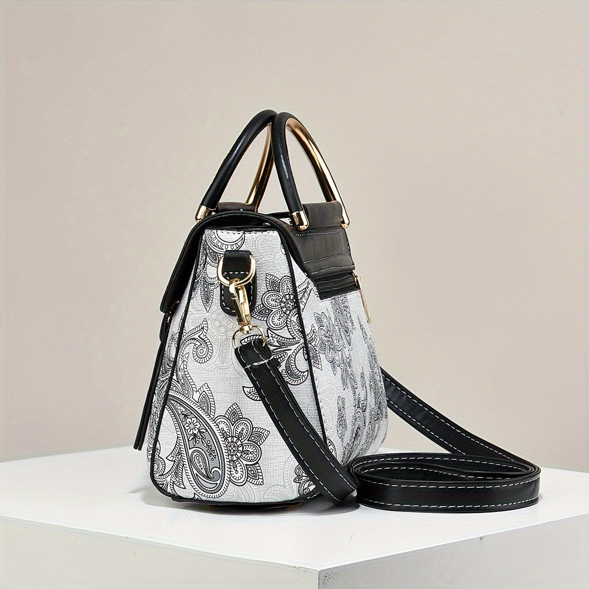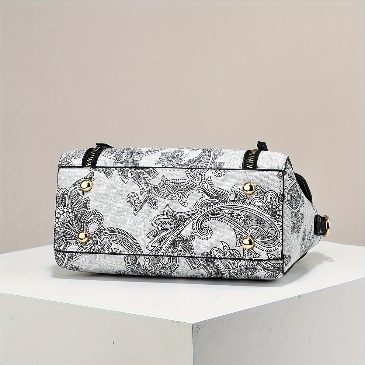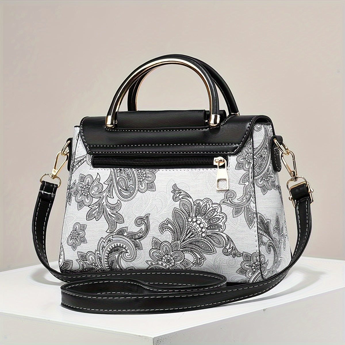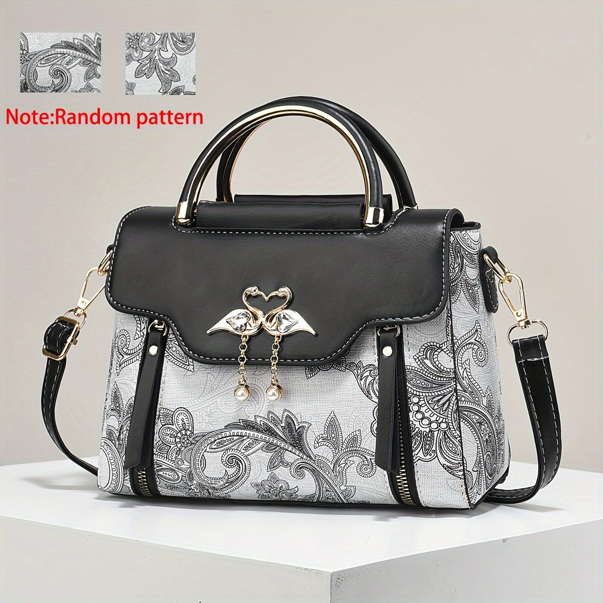 Կանացի էլեգանտ ծաղկային նախշերով պայուսակ՝ մագնիսական փակմամբ, կարգավորվող ժապավենով և մետաղական կարապի տեսքով սրտաձև կախազարդով, արհեստական կաշվից ուսի պայուսակ՝ պոլիեսթերային աստառով և ներկված եզրերով, կանացի պայուսակ