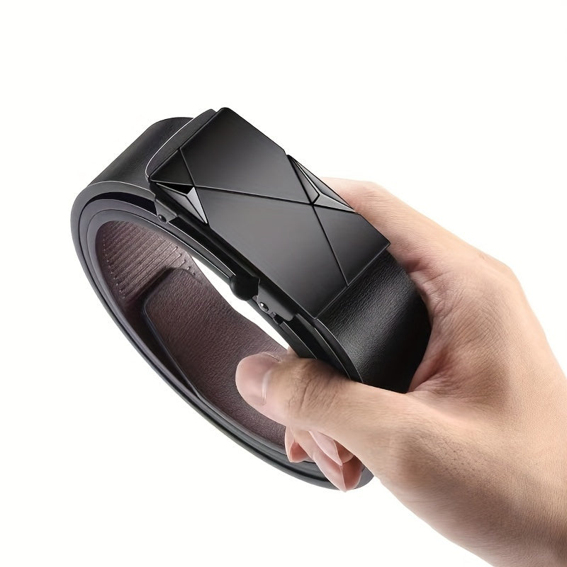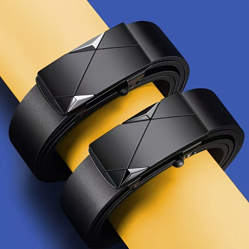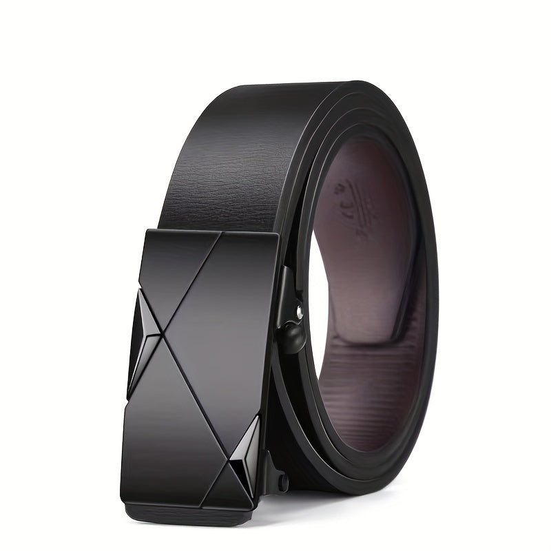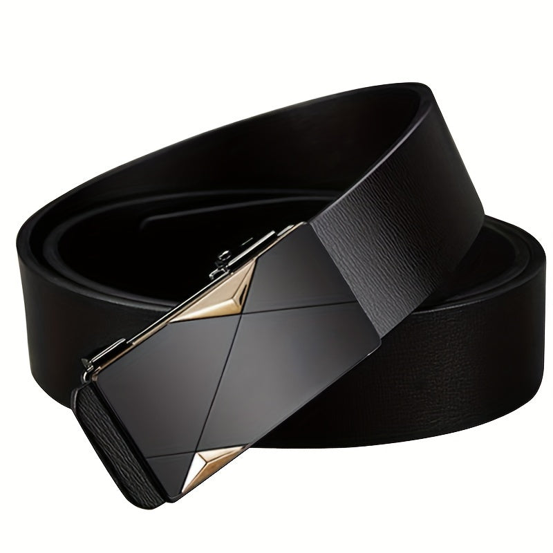 Տղամարդկանց էլեգանտ Ավտոմատ ճարմանդային գոտի - Նրբագեղ սև արհեստական կաշի ոսկեգույն երկրաչափական ճարմանդով, իդեալական բիզնեսի և պատահական հանդերձանքների համար