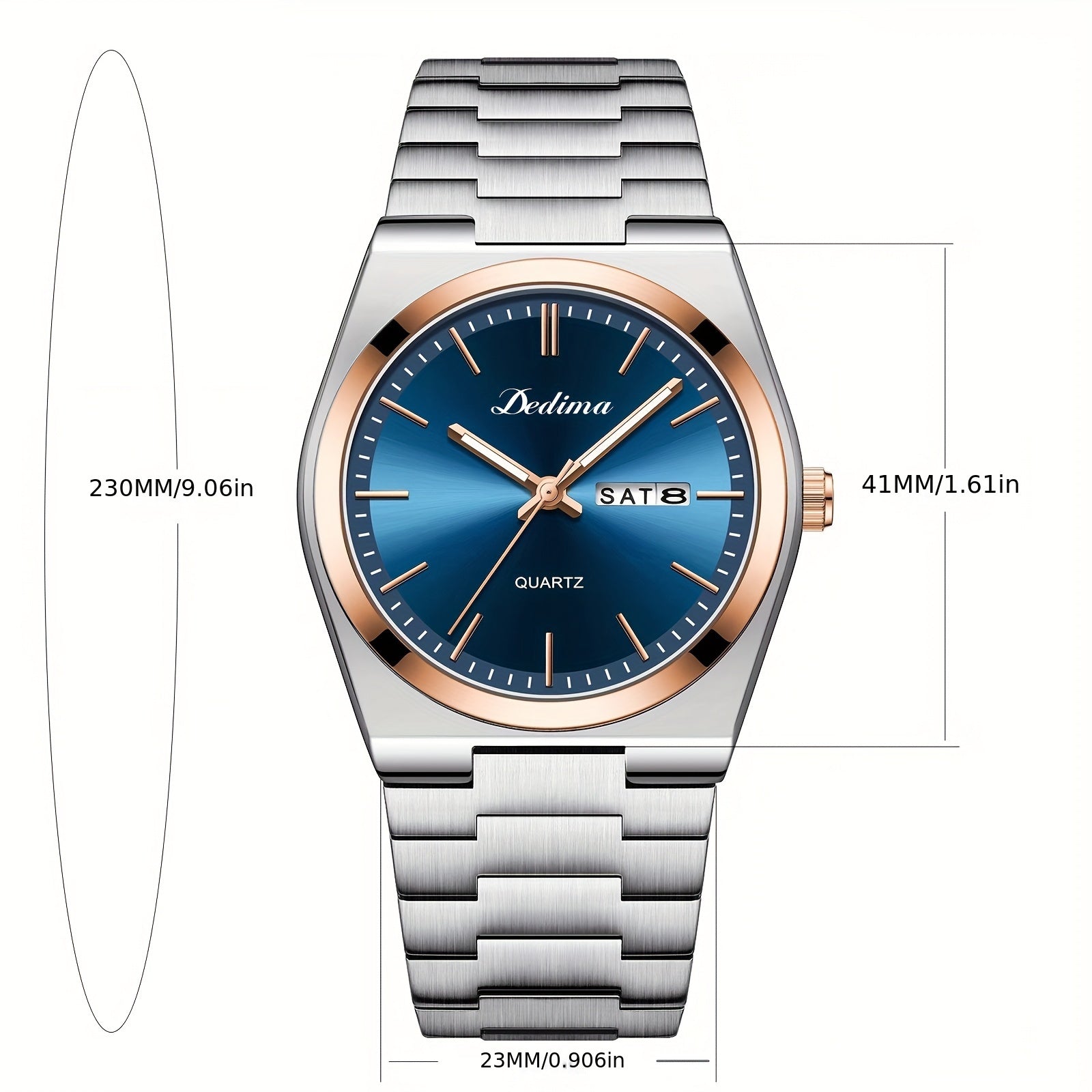 Էլեգանտ տղամարդու քվարցային ժամացույց՝ չժանգոտվող պողպատե ժապավենով, ամրակաձև դետալով և կրկնակի օրացույցով - ներառված է չլիցքավորվող կոճակով մարտկոց, DEDIMA