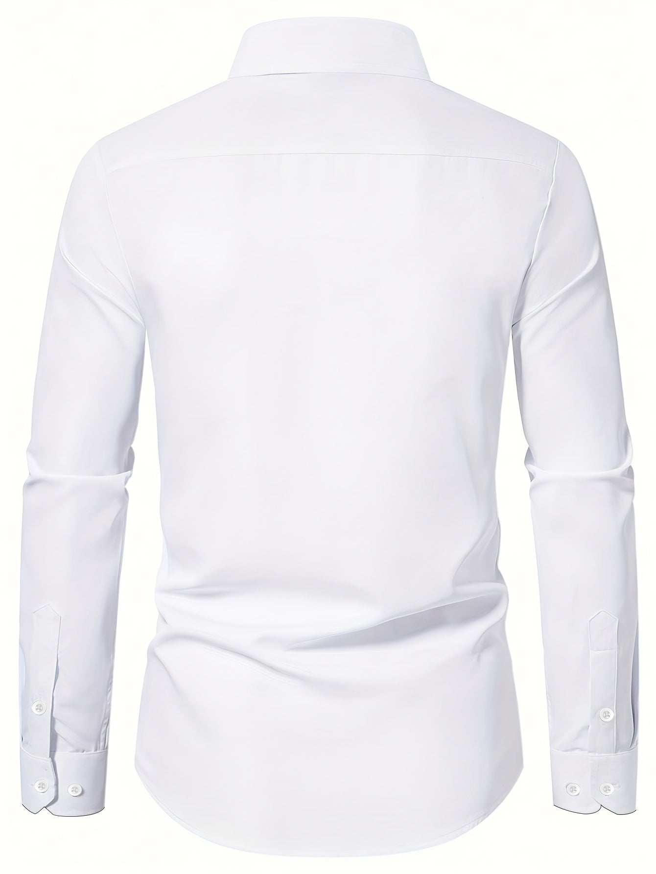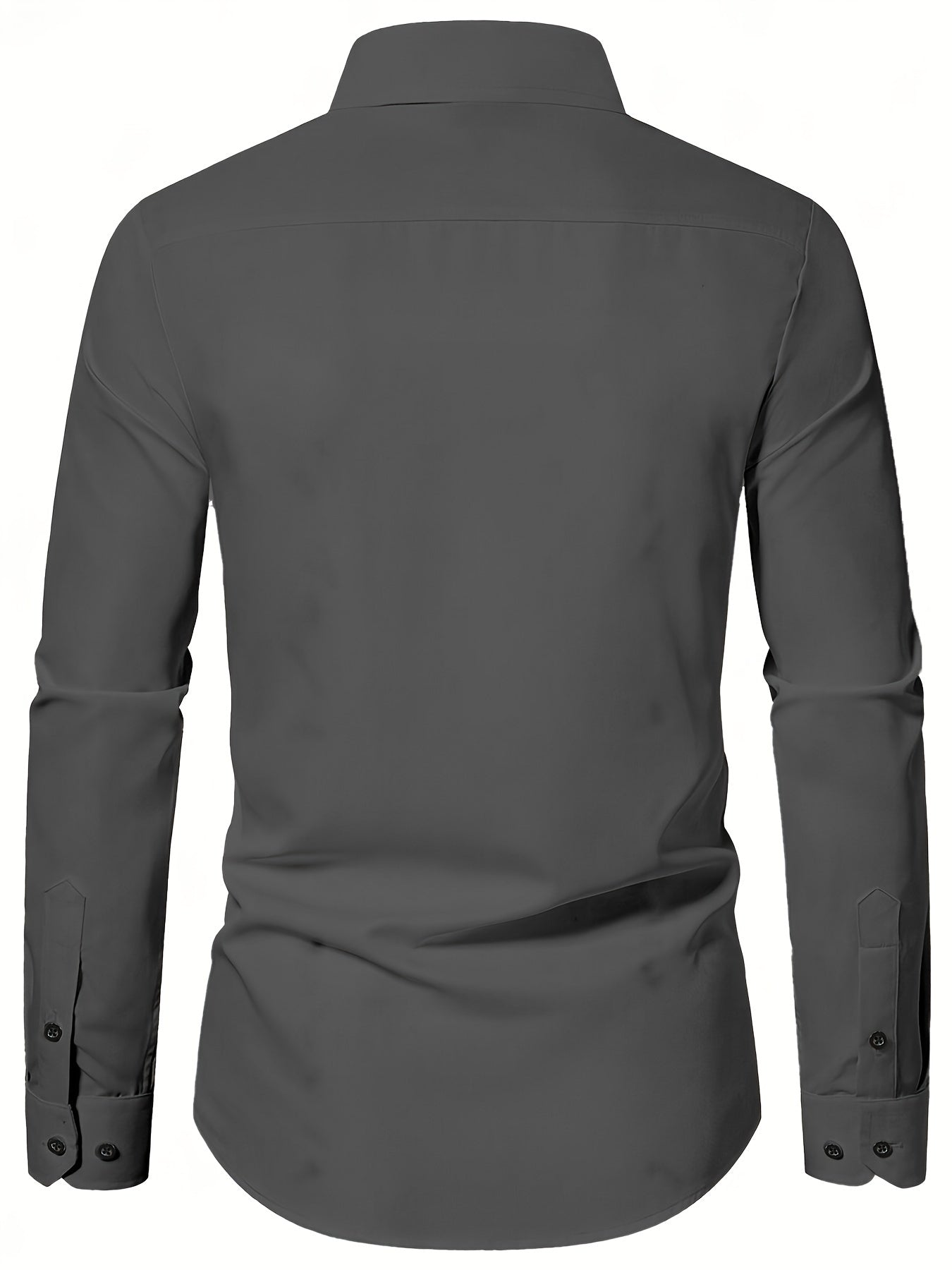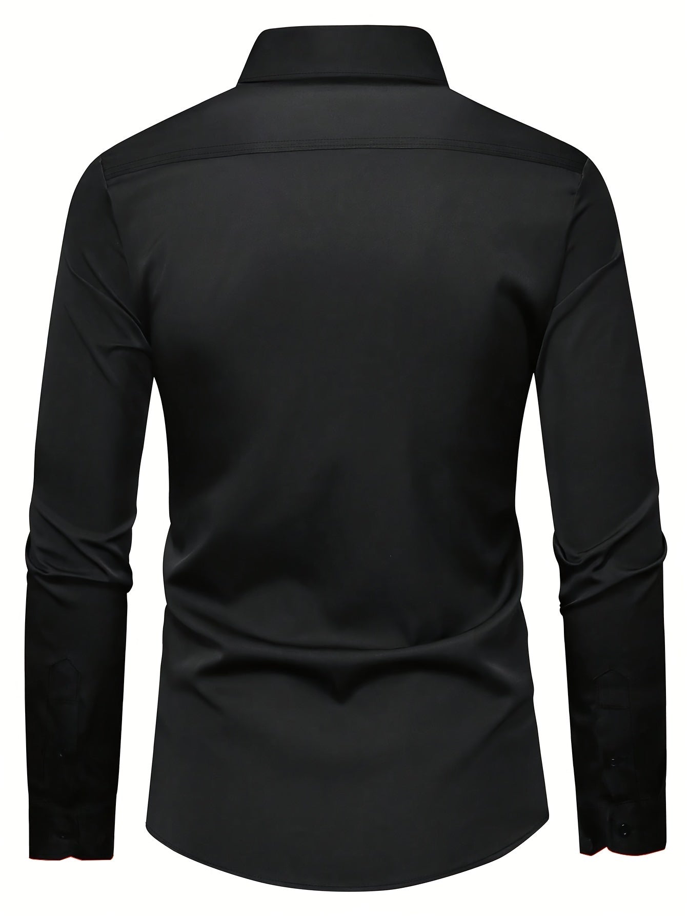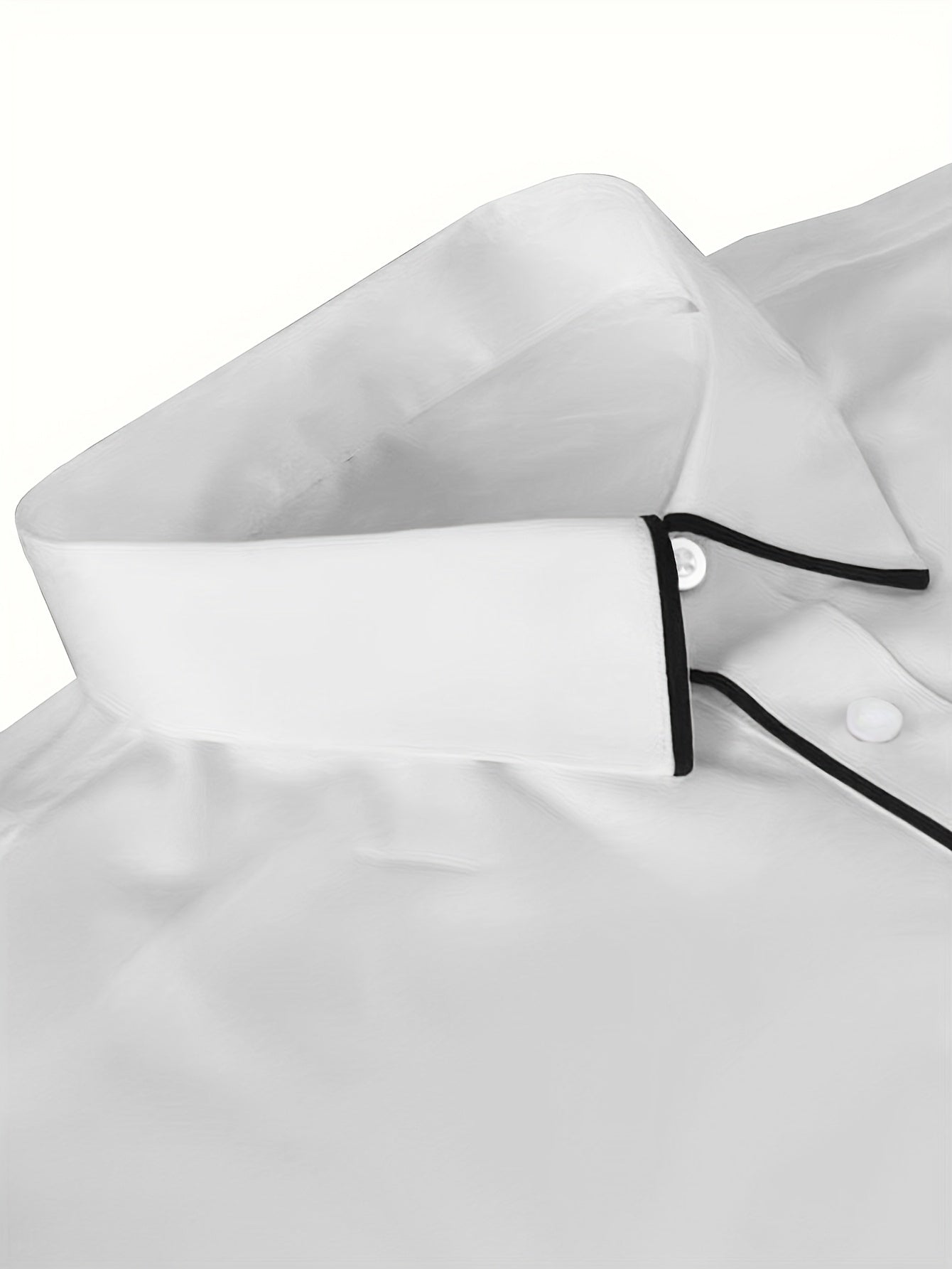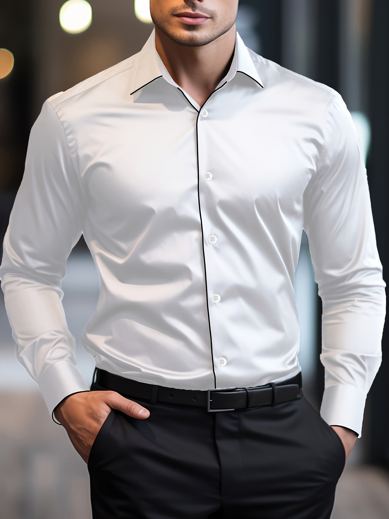 Էլեգանտ տղամարդու միագույն երկար թևքով վերնաշապիկ՝ ոճային հակապատկերային եզրագծով - 100% պոլիեսթեր, կոճակներով, լվացվող մեքենայով - իդեալական է պաշտոնական և կիսապաշտոնական առիթների համար