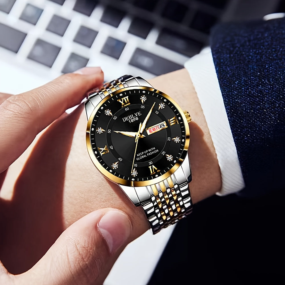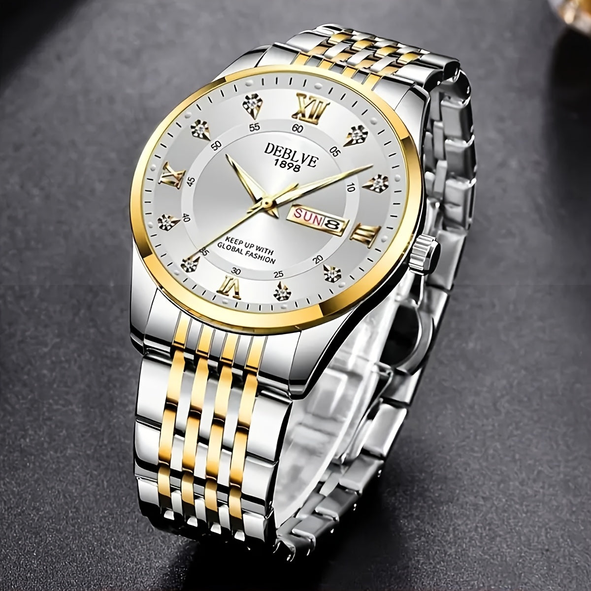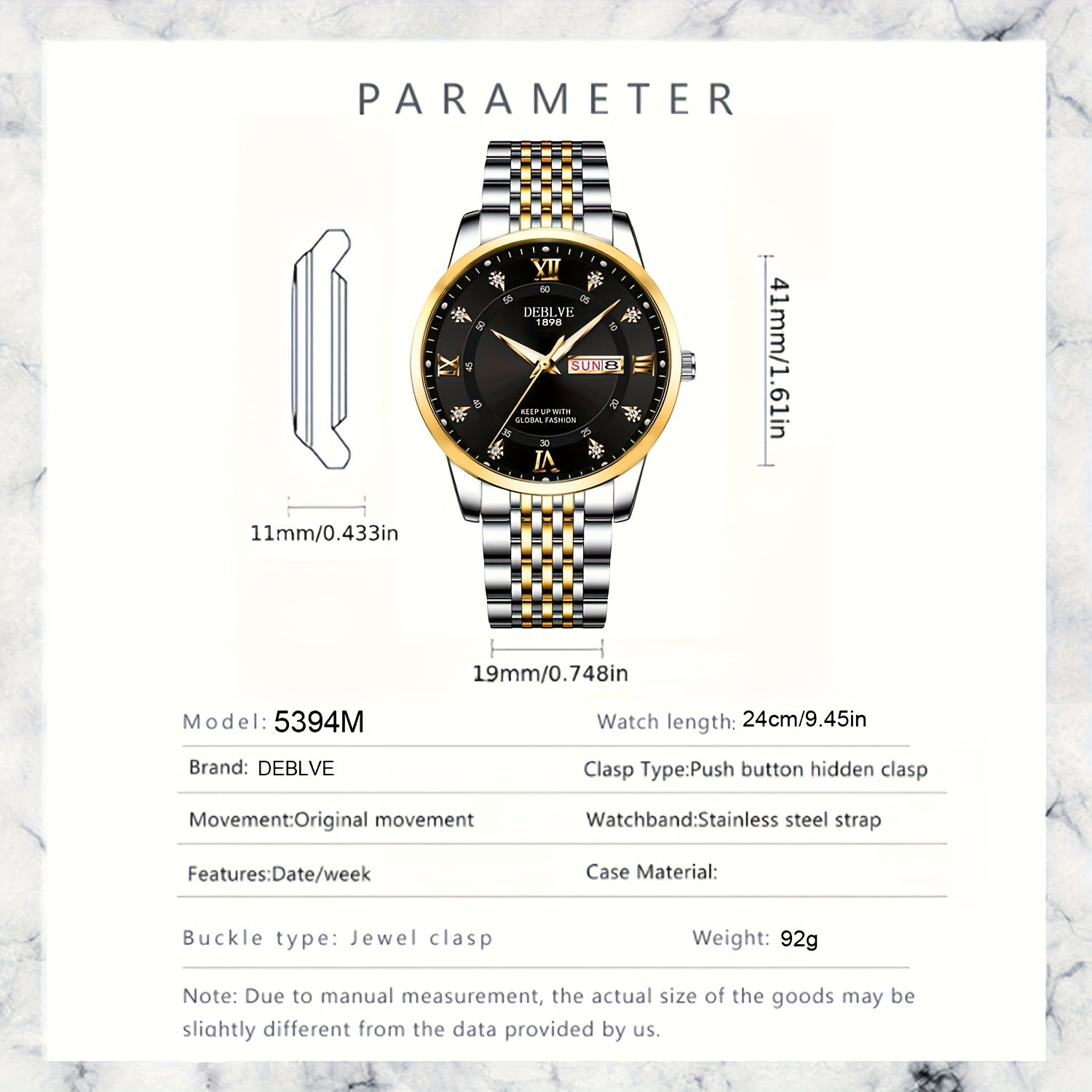 Elegant Men'S Stainless Steel Quartz Watch with Luminous Hands, Date Display & Week Indicator - Classic Design, Non-Waterproof, Battery Powered - Ideal Gift for Christmas, Halloween, Campus Related Events, Everyday Watch|Clas