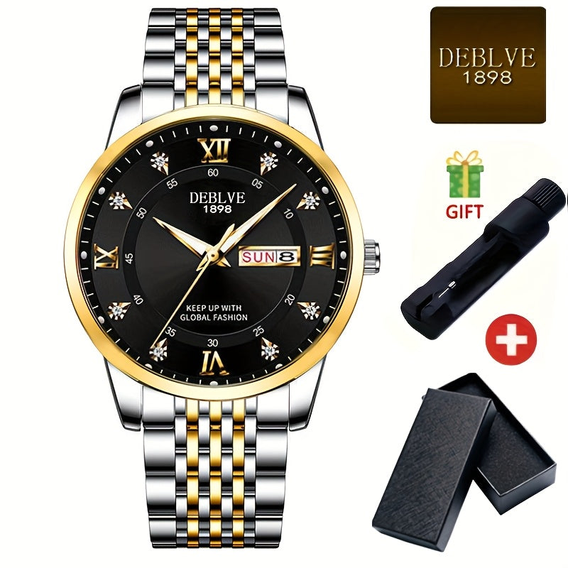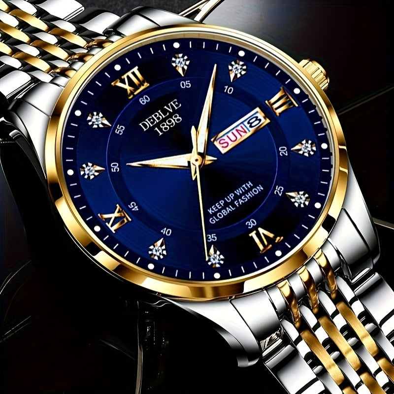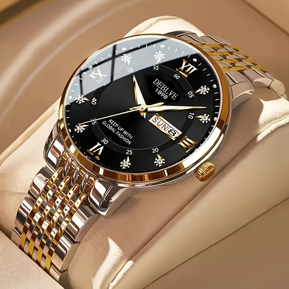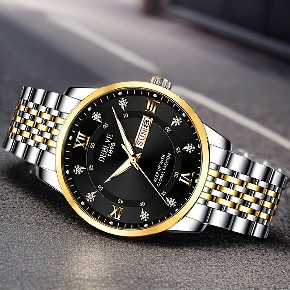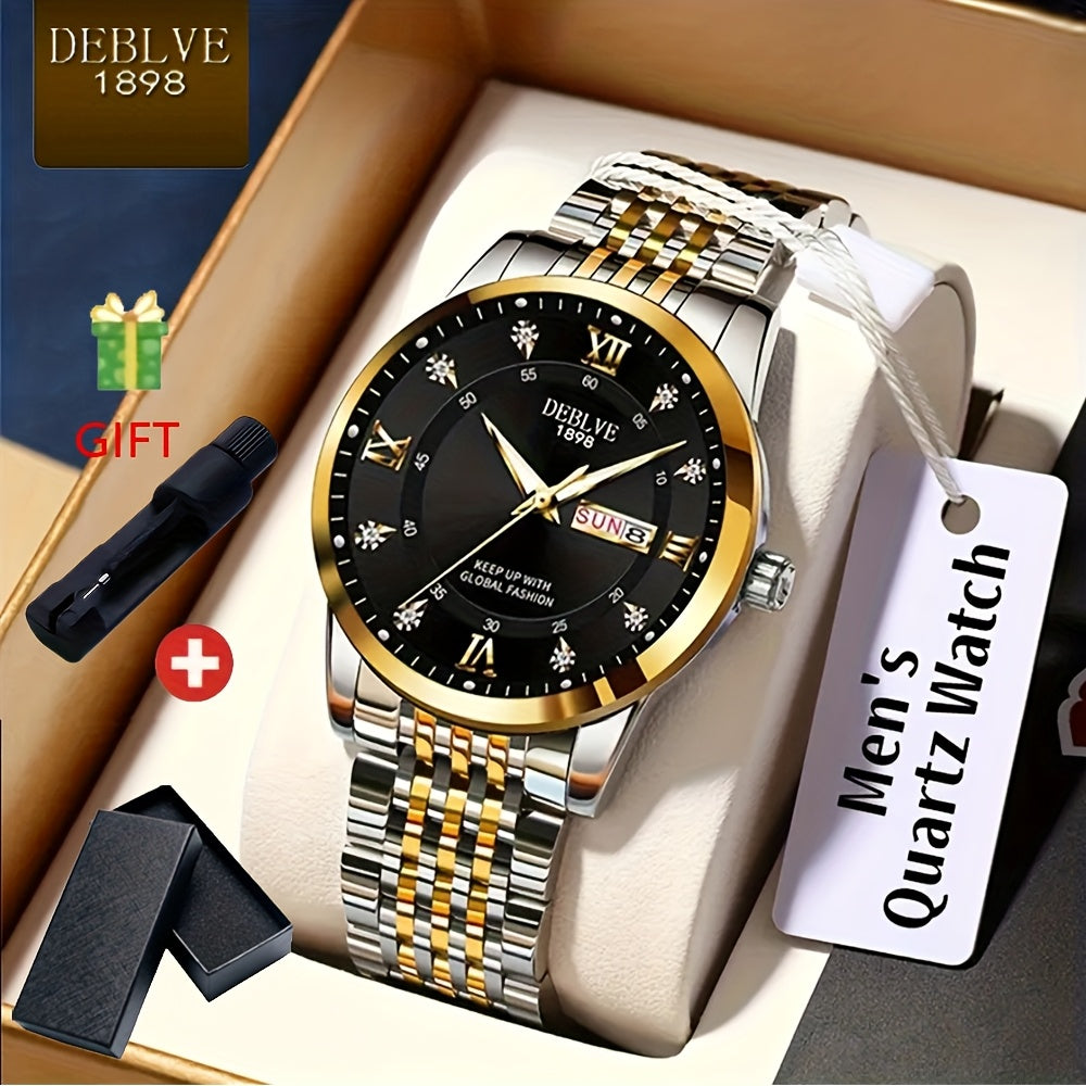 Elegant Men'S Stainless Steel Quartz Watch with Luminous Hands, Date Display & Week Indicator - Classic Design, Non-Waterproof, Battery Powered - Ideal Gift for Christmas, Halloween, Campus Related Events, Everyday Watch|Clas