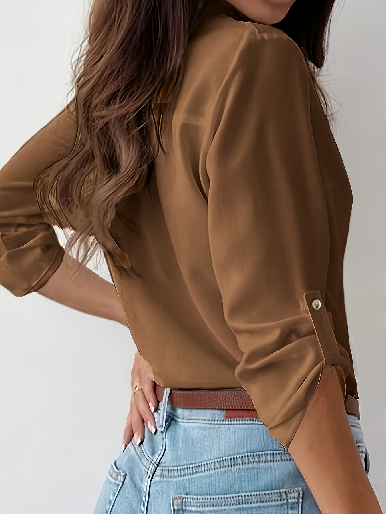 Էլեգանտ միագույն կանացի վերնաշապիկ՝ պոլիեսթերից, կոճակներով, ոչ թափանցիկ, լվացվող մեքենայով՝ գարնան/աշնան համար