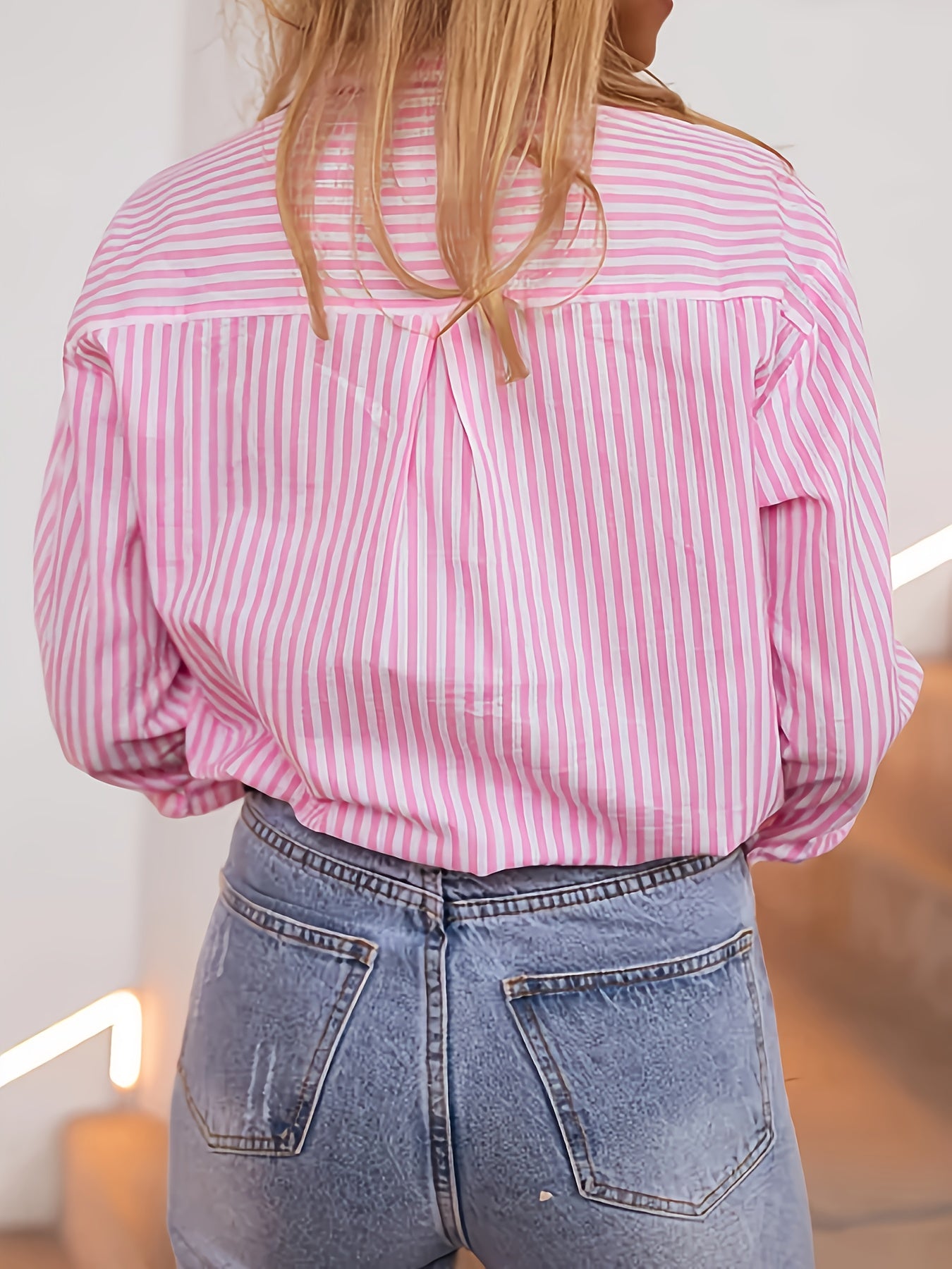 Նրբաճաշակ գծավոր կոճակներով վերնաշապիկ կանանց համար - շքեղ երկարաթև, թեթև պոլիեսթեր խառնուրդ, բազմակողմանի կապույտ սպիտակ գծերով, իդեալական գարուն/ամառ