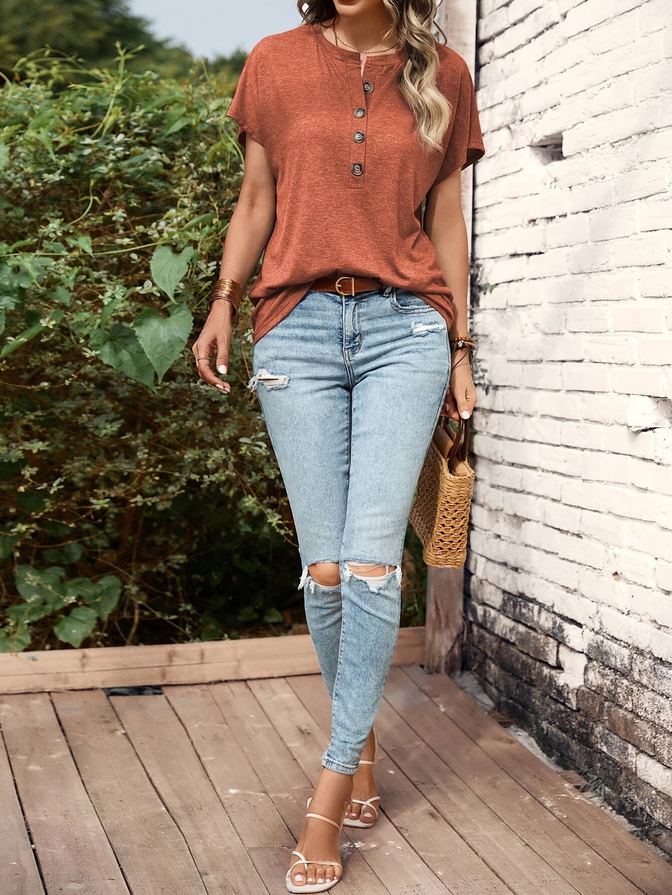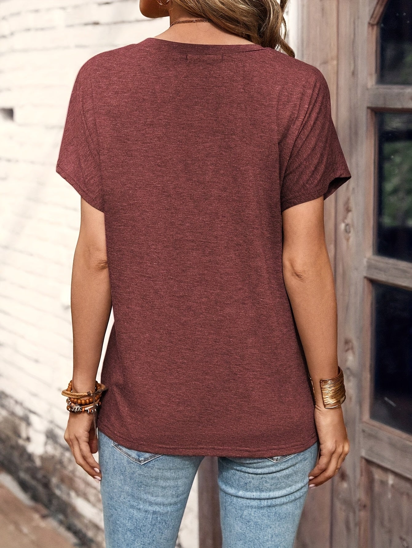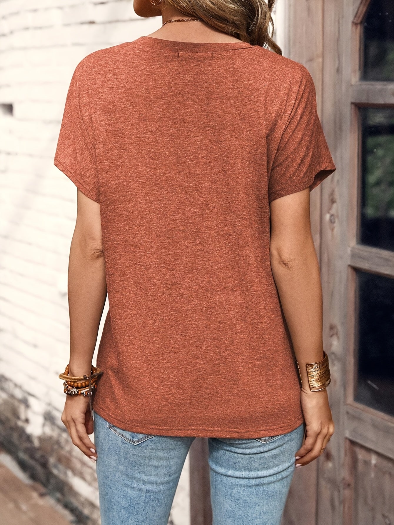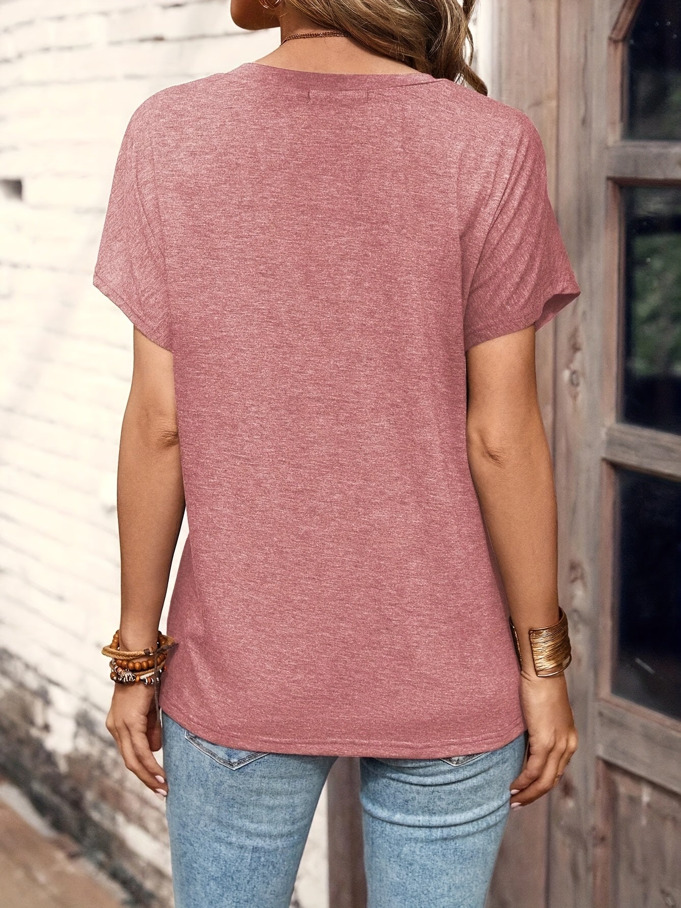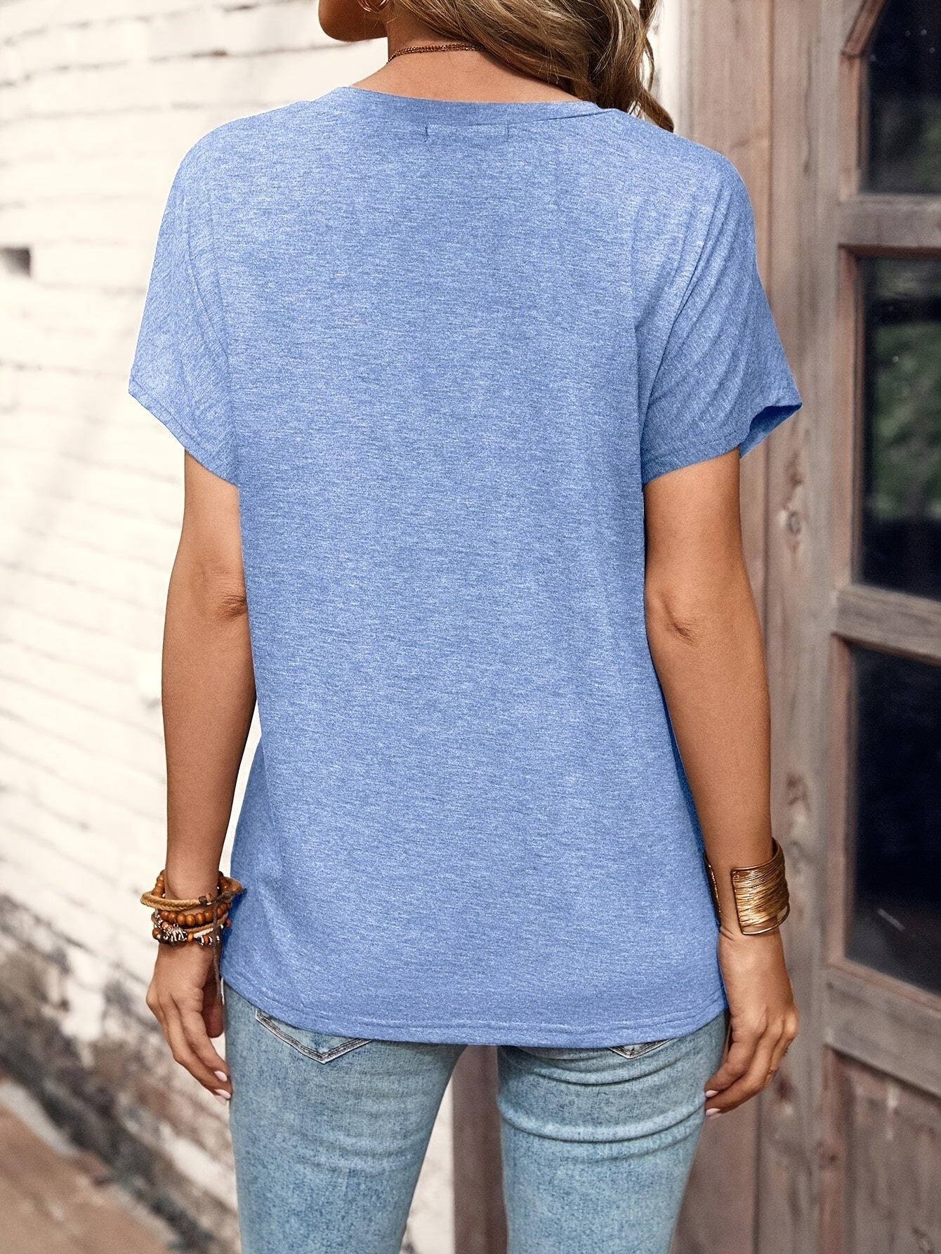 Էլեգանտ կանացի բաց կապույտ ամառային մարզաշապիկ՝ կարճ թևքերով, կլոր վզնոցով, պոլիեսթերի խառնուրդով, լվացվող լվացքի մեքենայով, հարթ հյուսվածքով - իդեալական է ինչպես առօրյա, այնպես էլ շքեղ առիթների համար