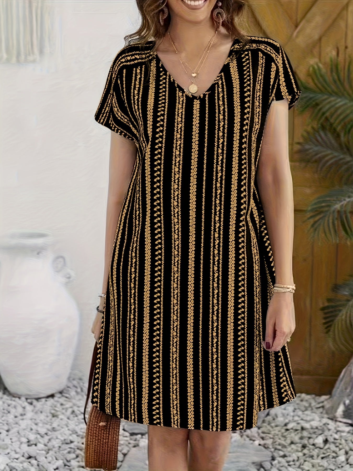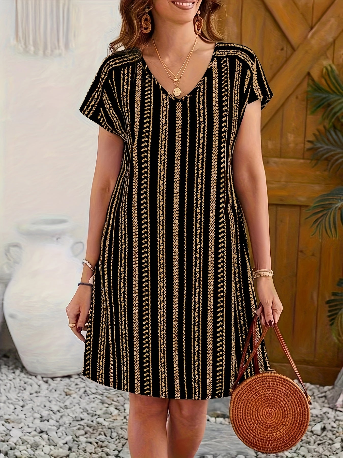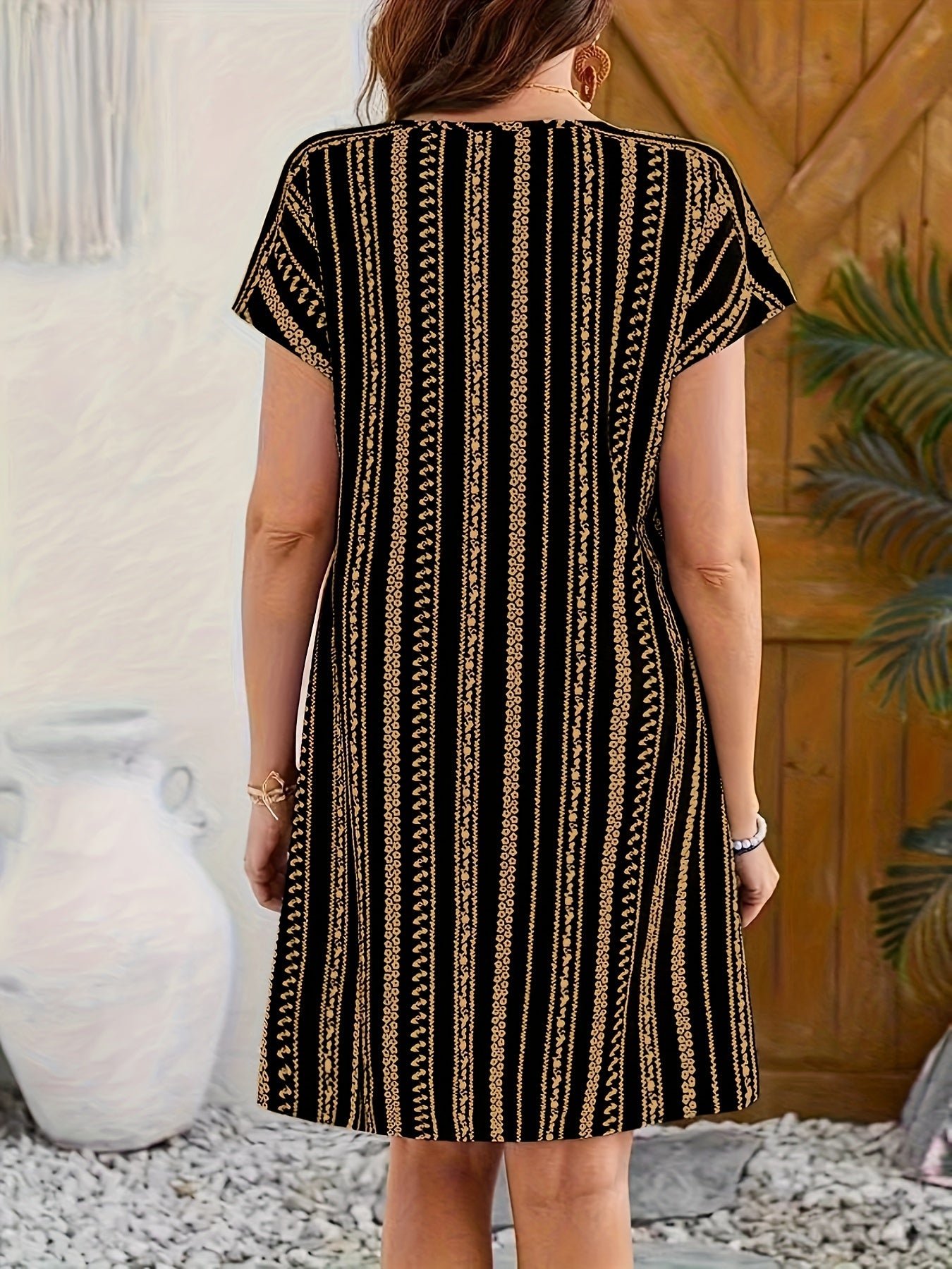 Էթնիկ պրինտով վզով զգեստ, արձակուրդային ոճի կարճաթև բարակ զգեստ գարնան և ամառի համար, կանացի հագուստ