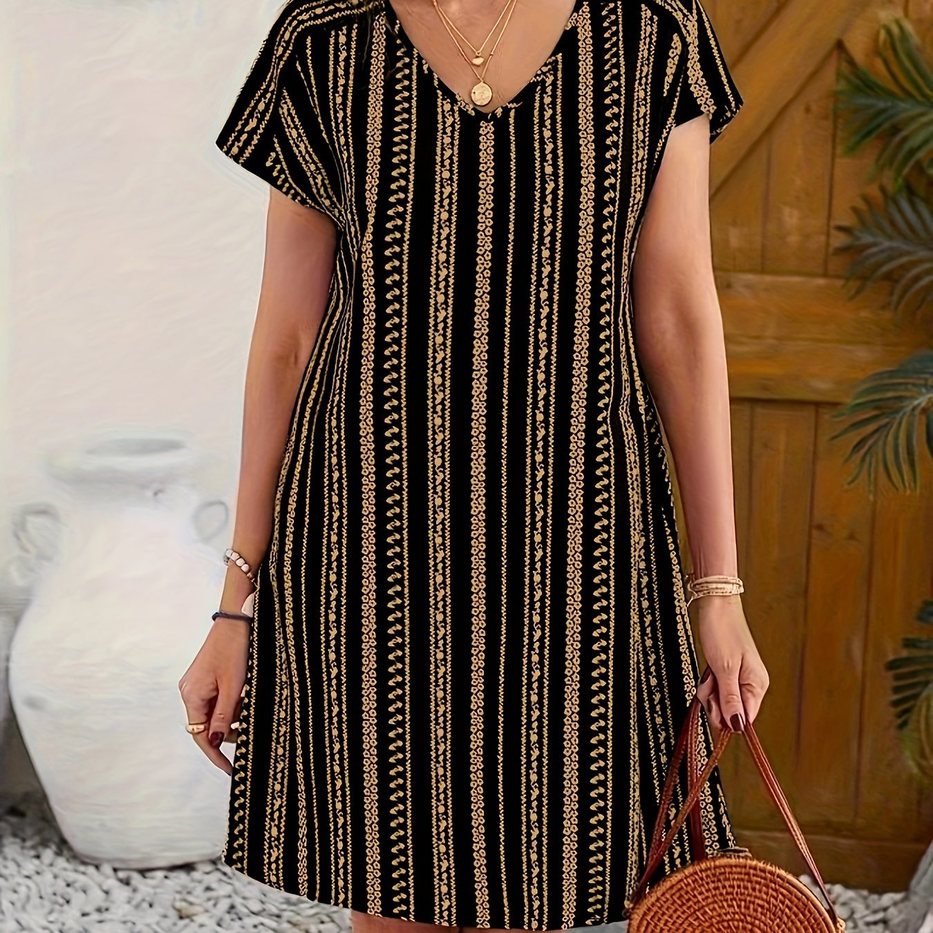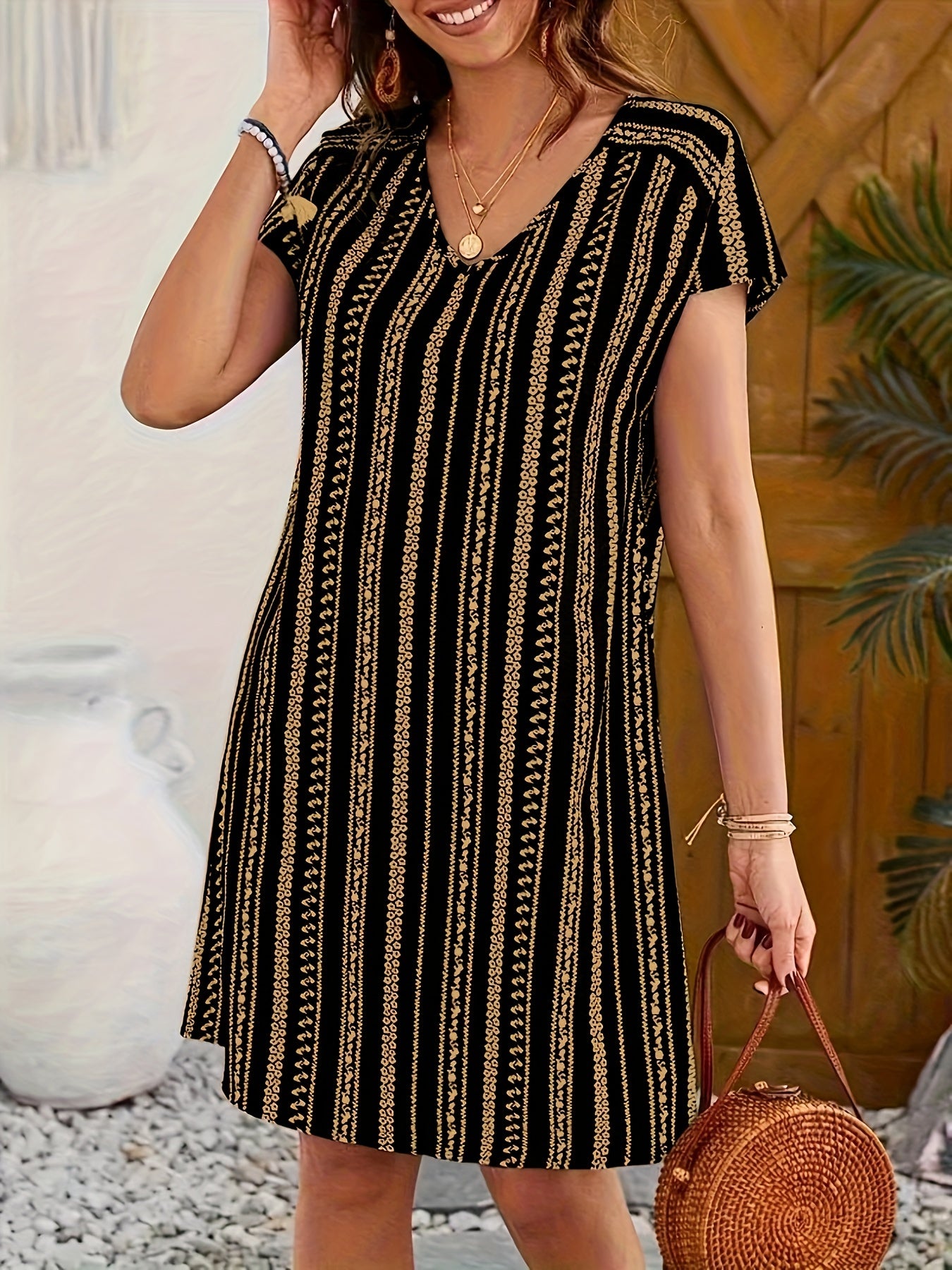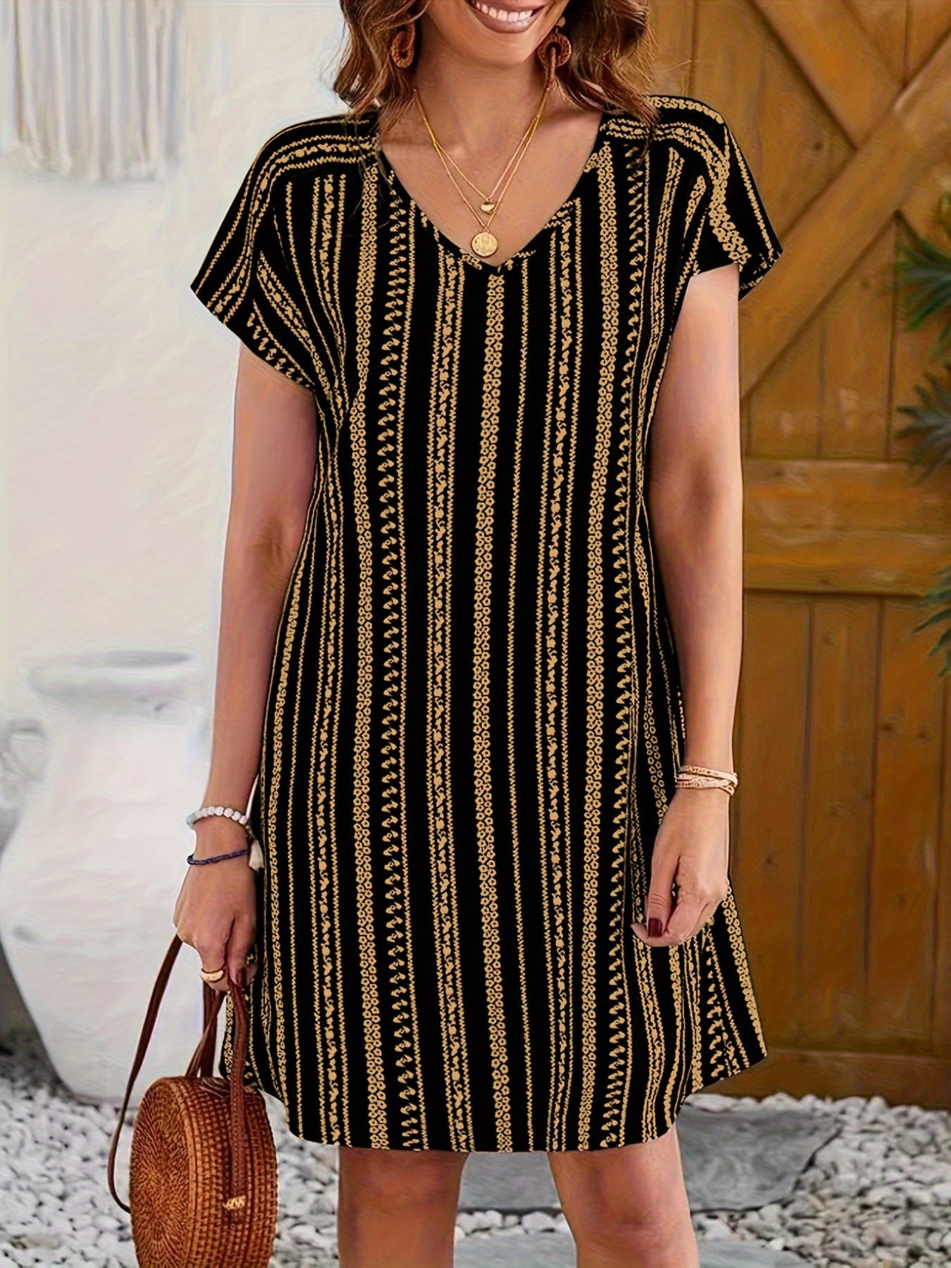 Էթնիկ պրինտով վզով զգեստ, արձակուրդային ոճի կարճաթև բարակ զգեստ գարնան և ամառի համար, կանացի հագուստ