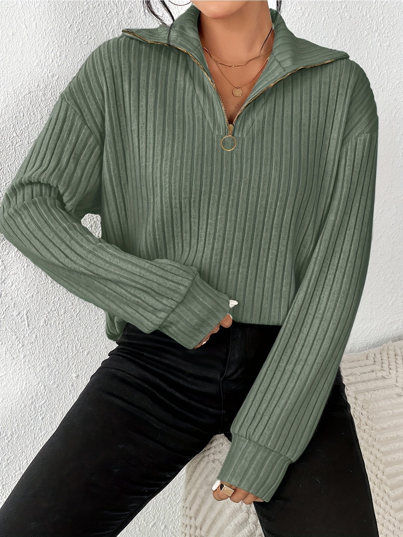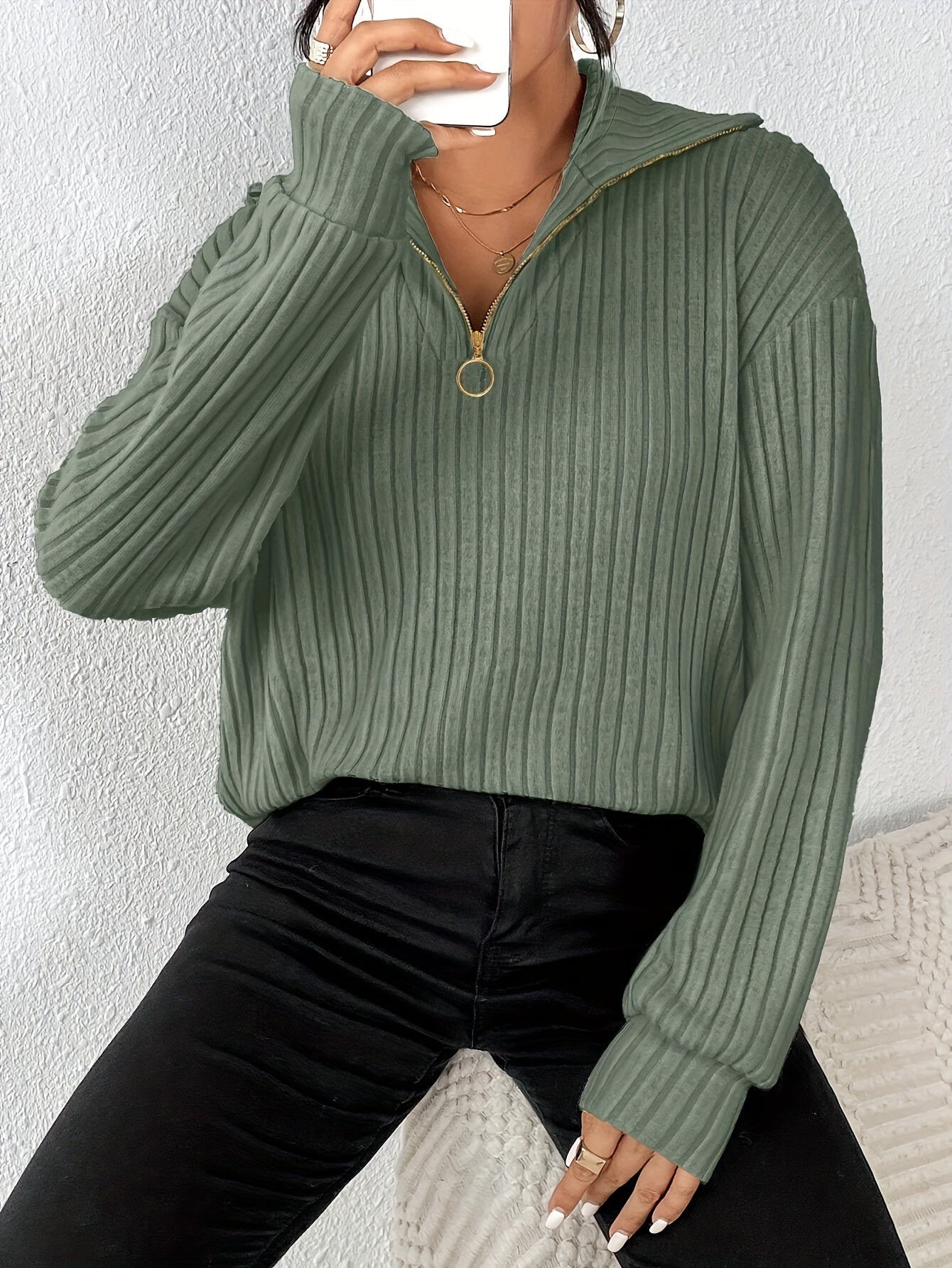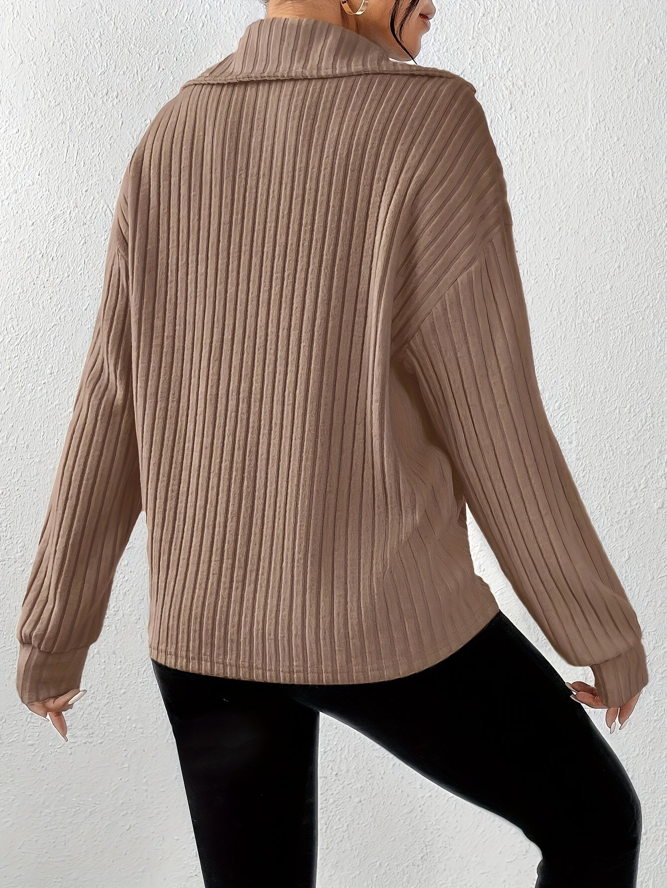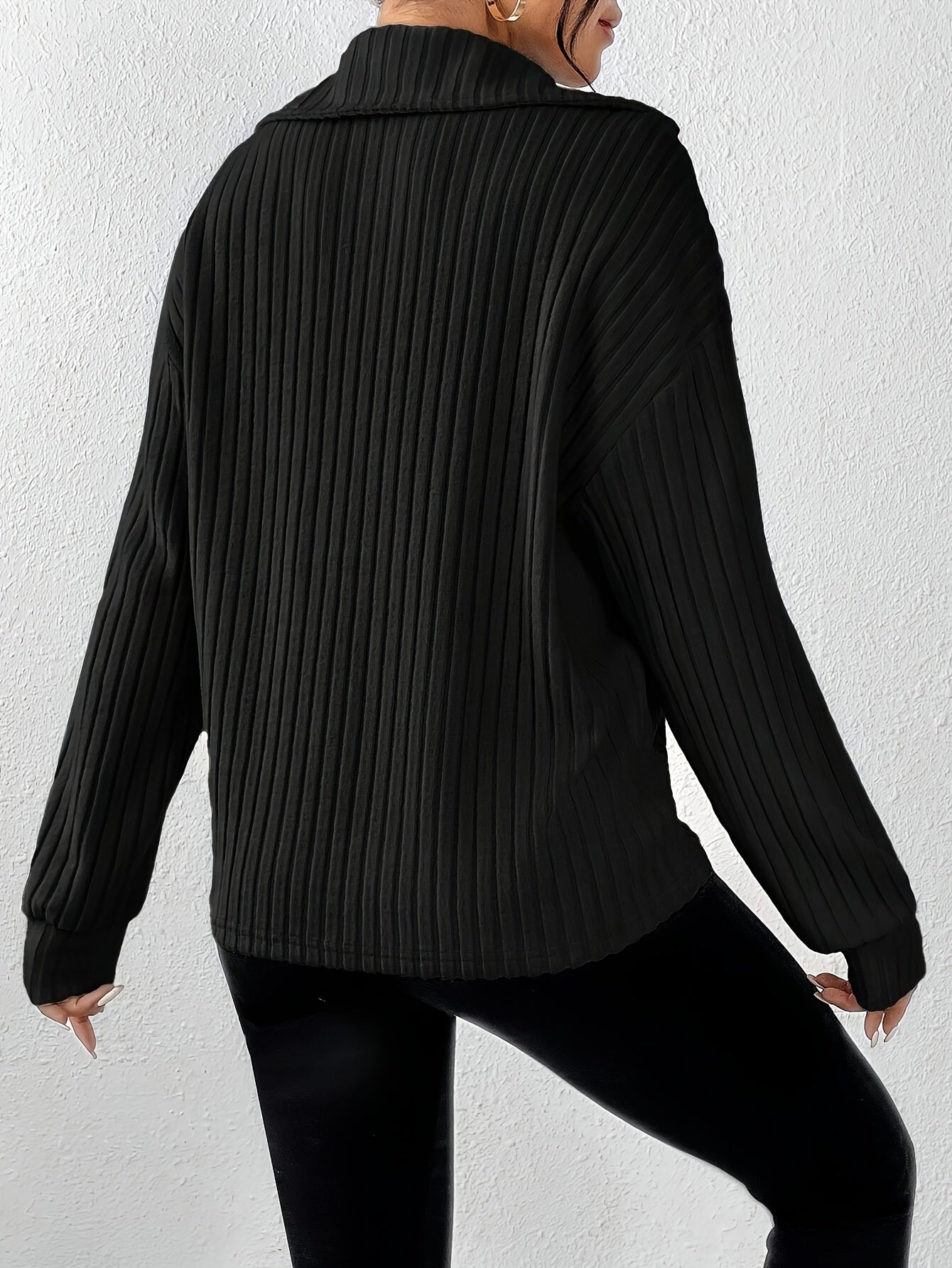 [Everyday Elegance] Կանացի էլեգանտ շերտավոր տրիկոտաժե օձիքով շապիկ - սև, երկարաթև, կայծակաճարմանդ դիզայն, փափուկ պոլիեսթեր խառնուրդ, լվացվող մեքենայով, կատարյալ գարնան և աշնան համար, կանացի վերնաշապիկներ
