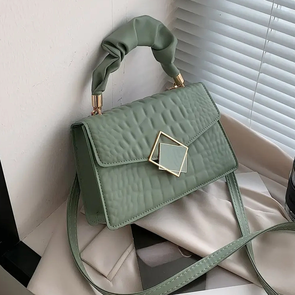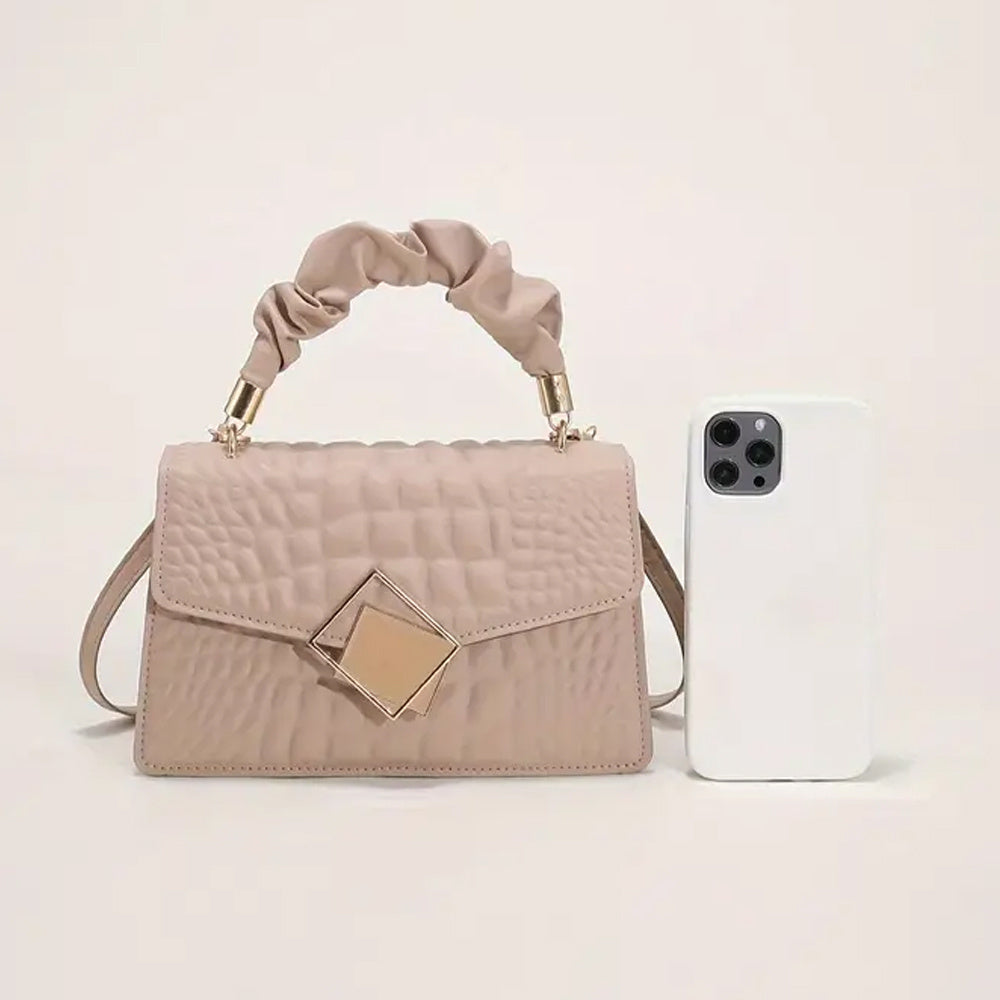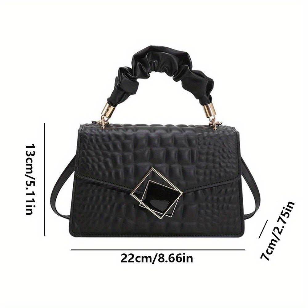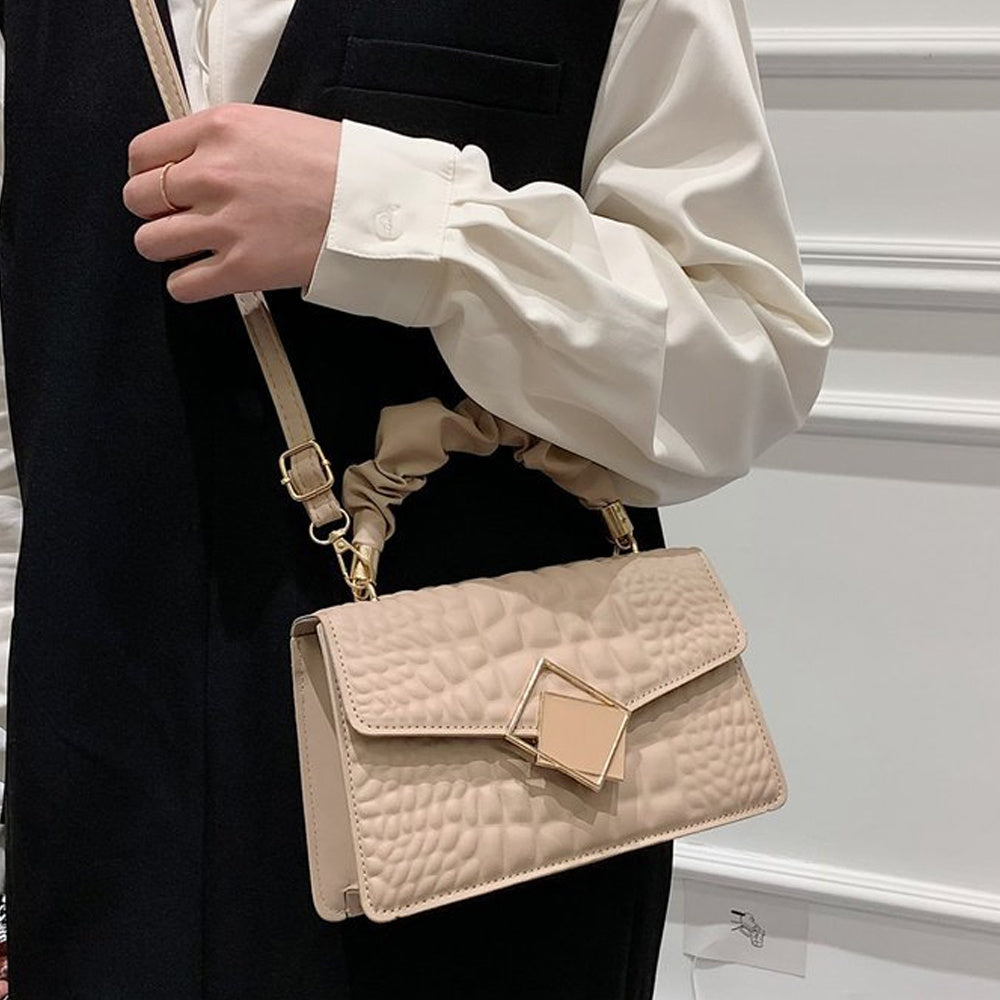 Նորաձև, ռելիեֆային, ծալքավոր բռնակով, խաչաձև մարմնի վրա կպչող պայուսակ - Կանացի միագույն, ոճային, ուսային պայուսակ, պարզ, ծալքավոր բռնակով, փոքր քառակուսի պայուսակ քարե նախշերով։